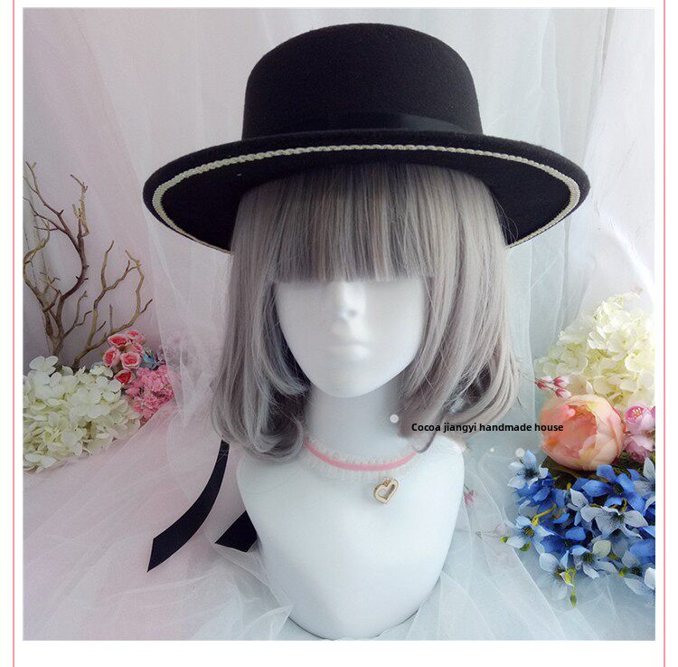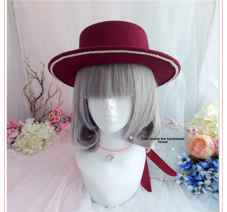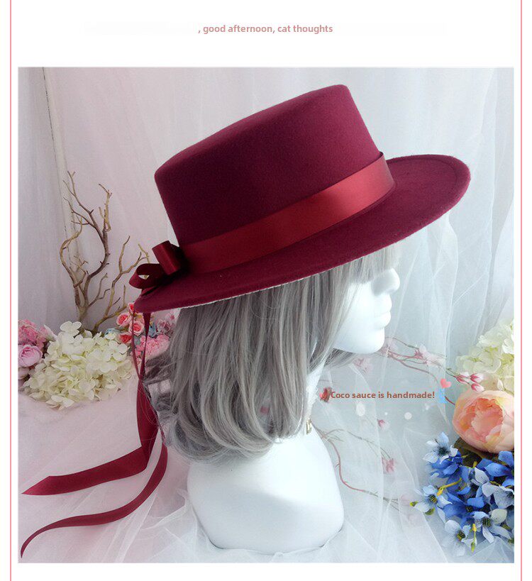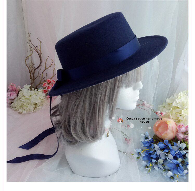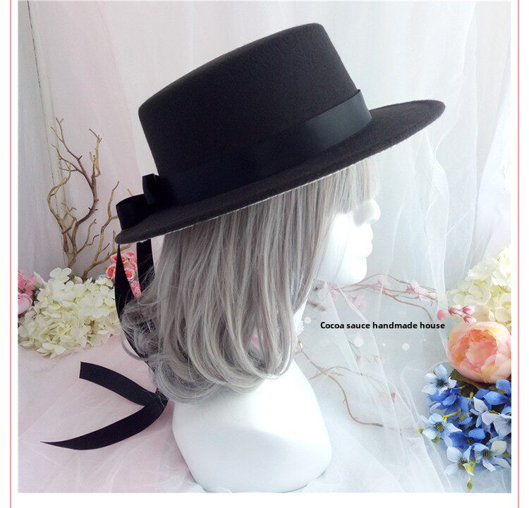 A Lolita-style flat-top wide-brimmed autumn/winter wool hat, a vintage British gay gentleman's dress hat.