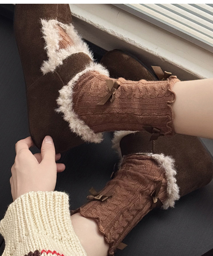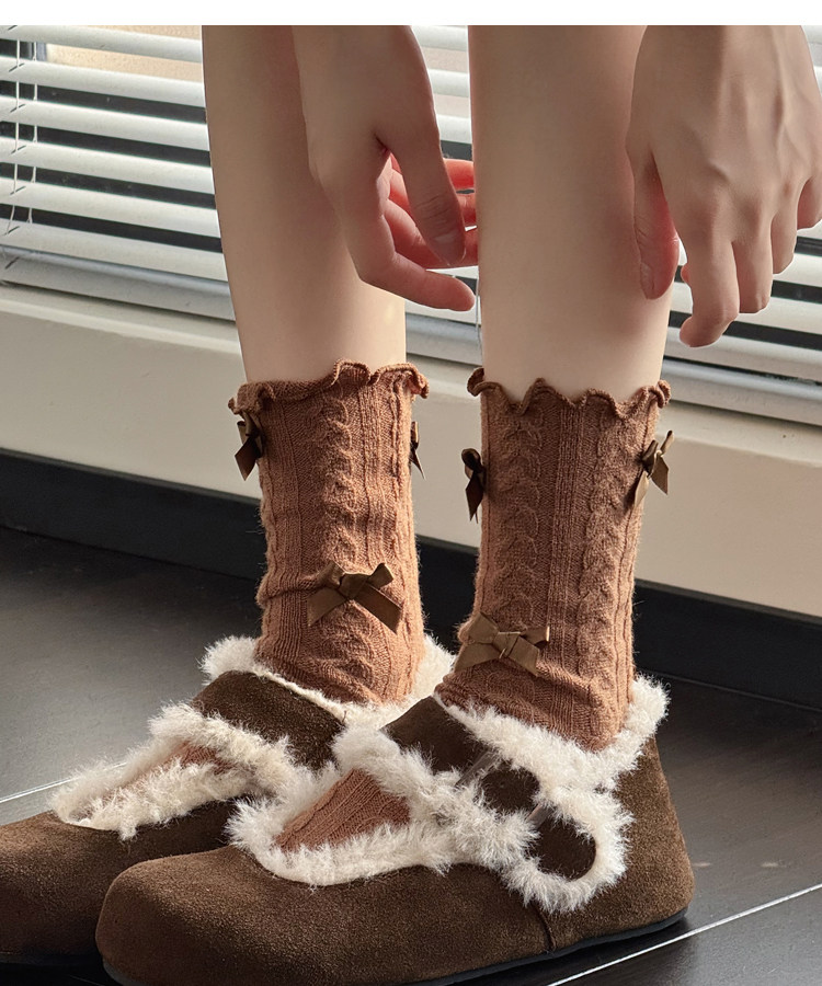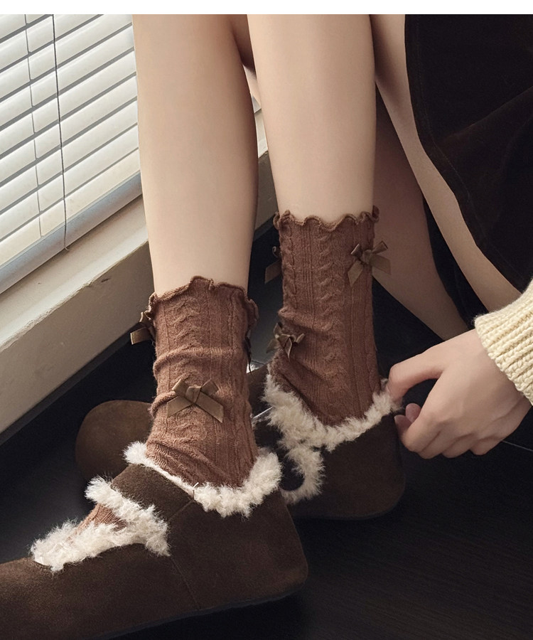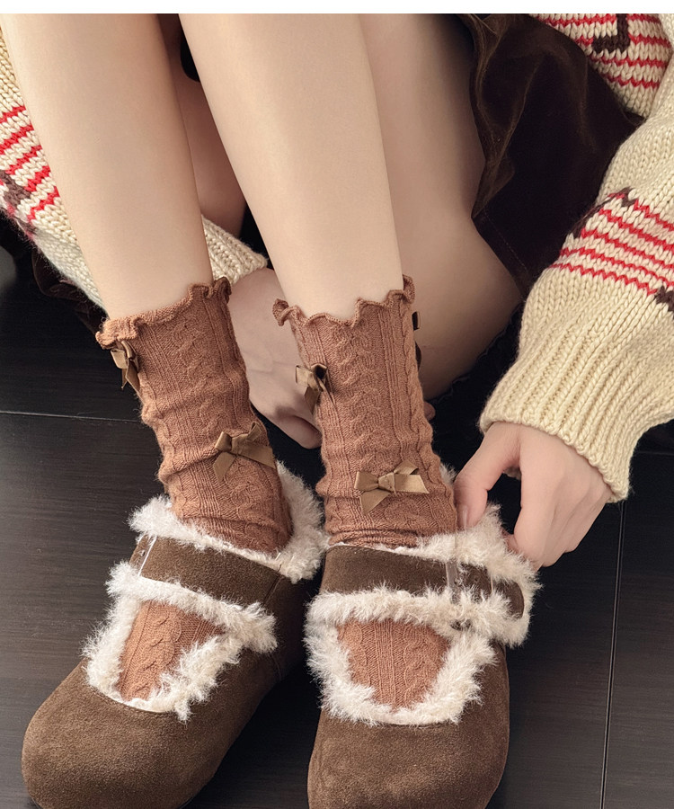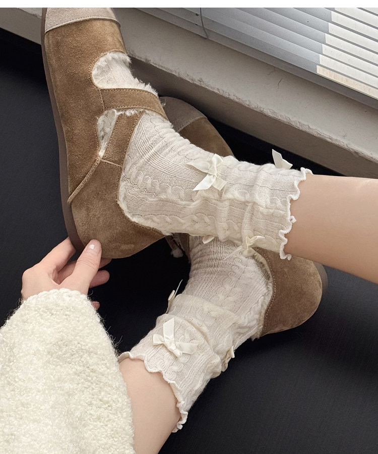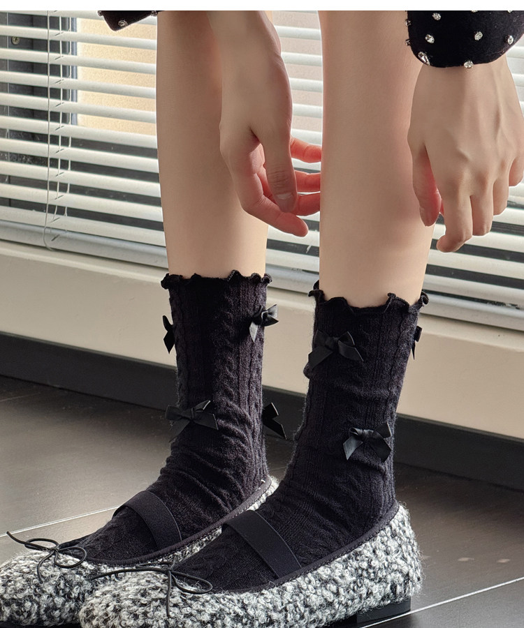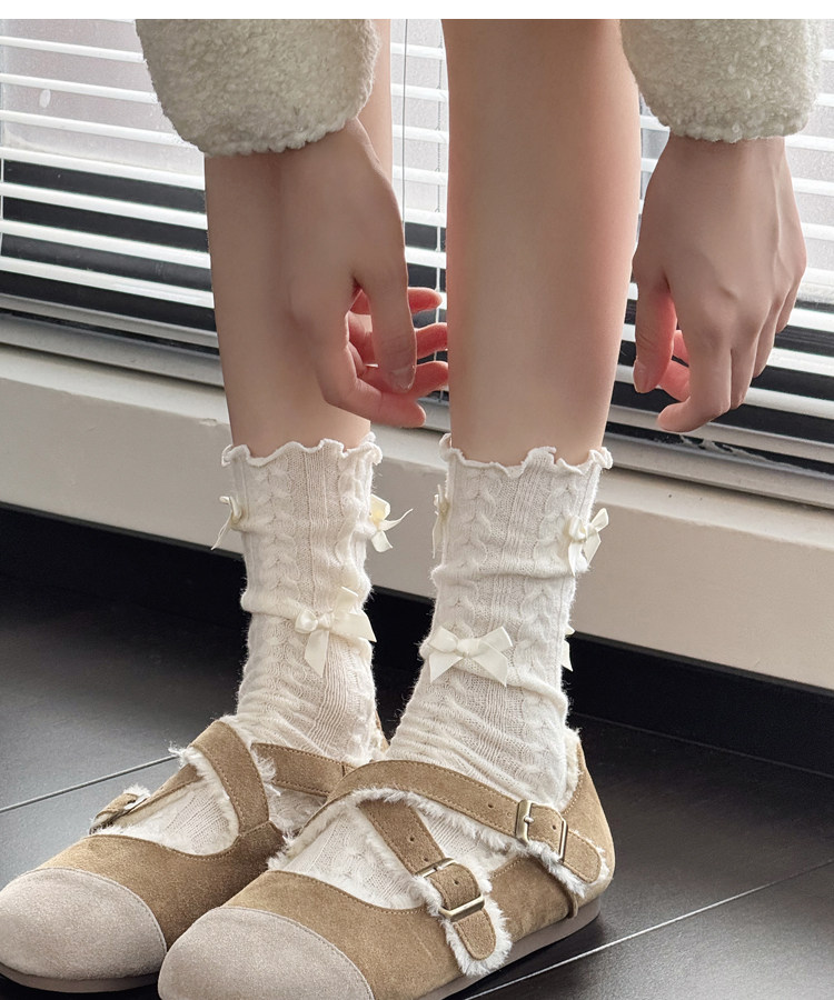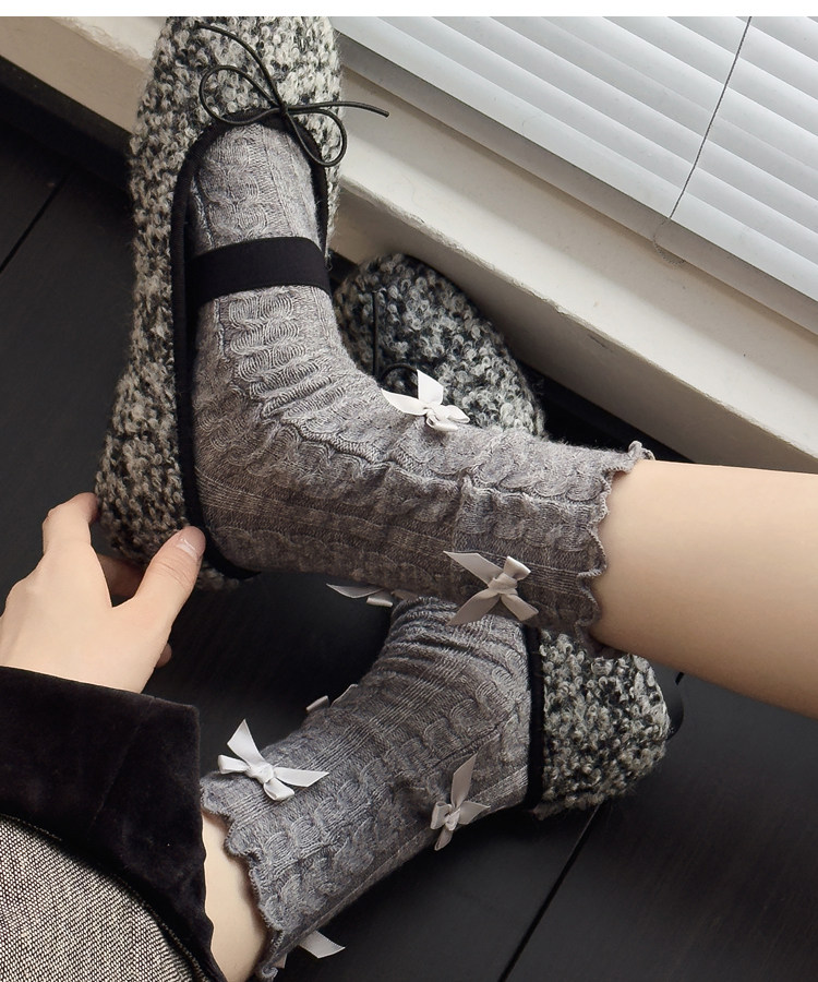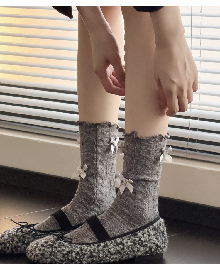 秋冬款奶白色中筒袜女麻花纹短袜烟灰色小腿袜甜美蝴蝶结堆堆袜子 [Original Page Link]