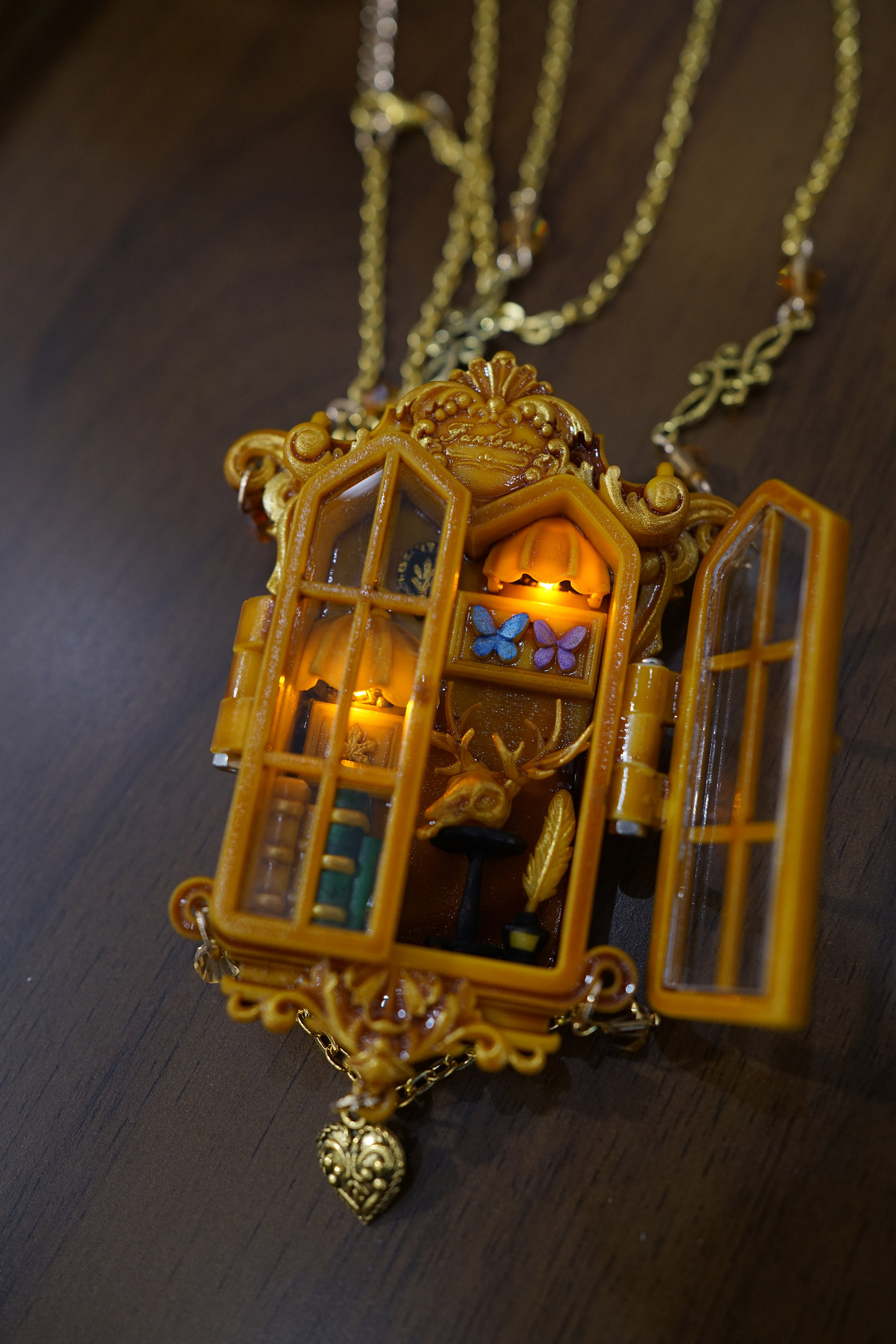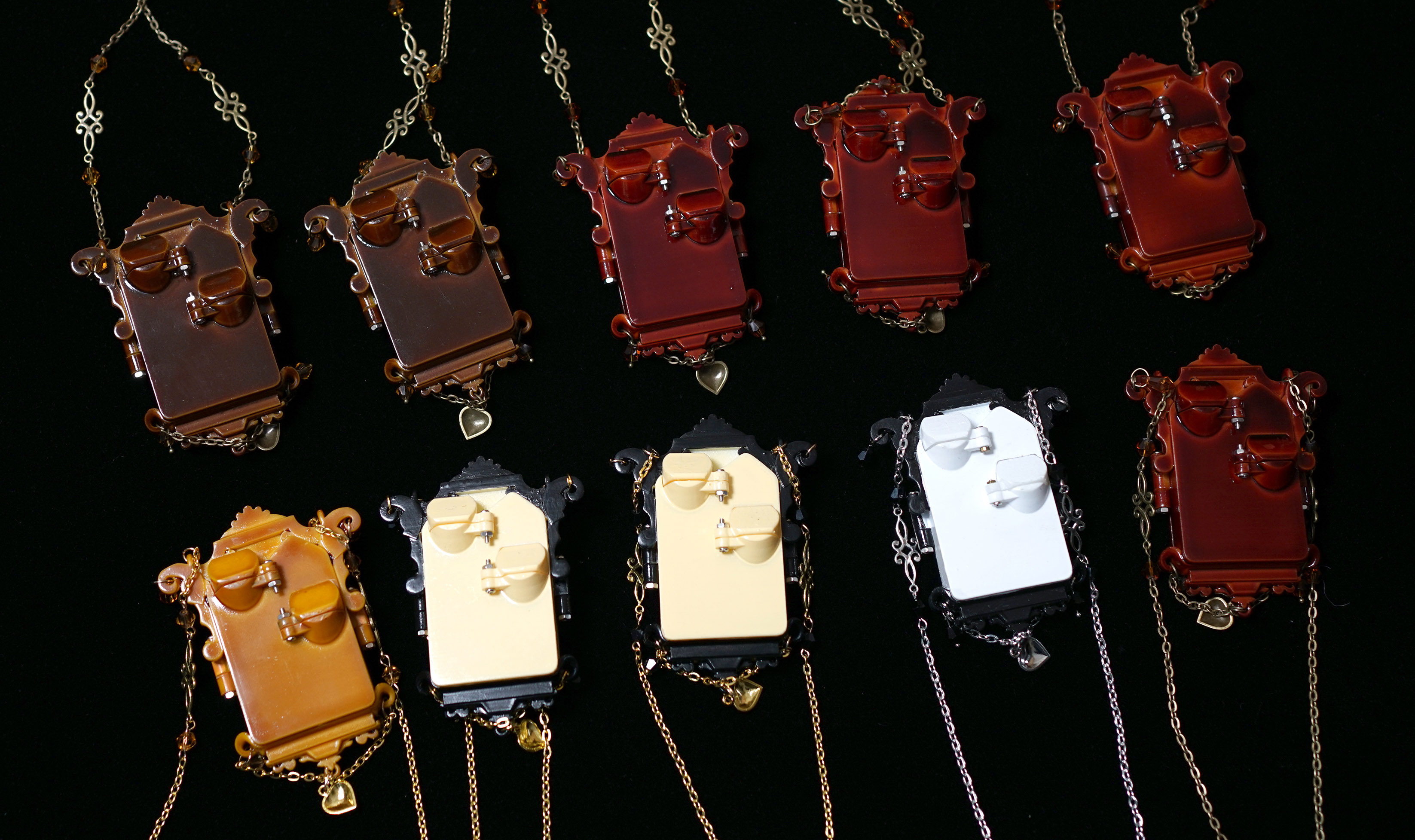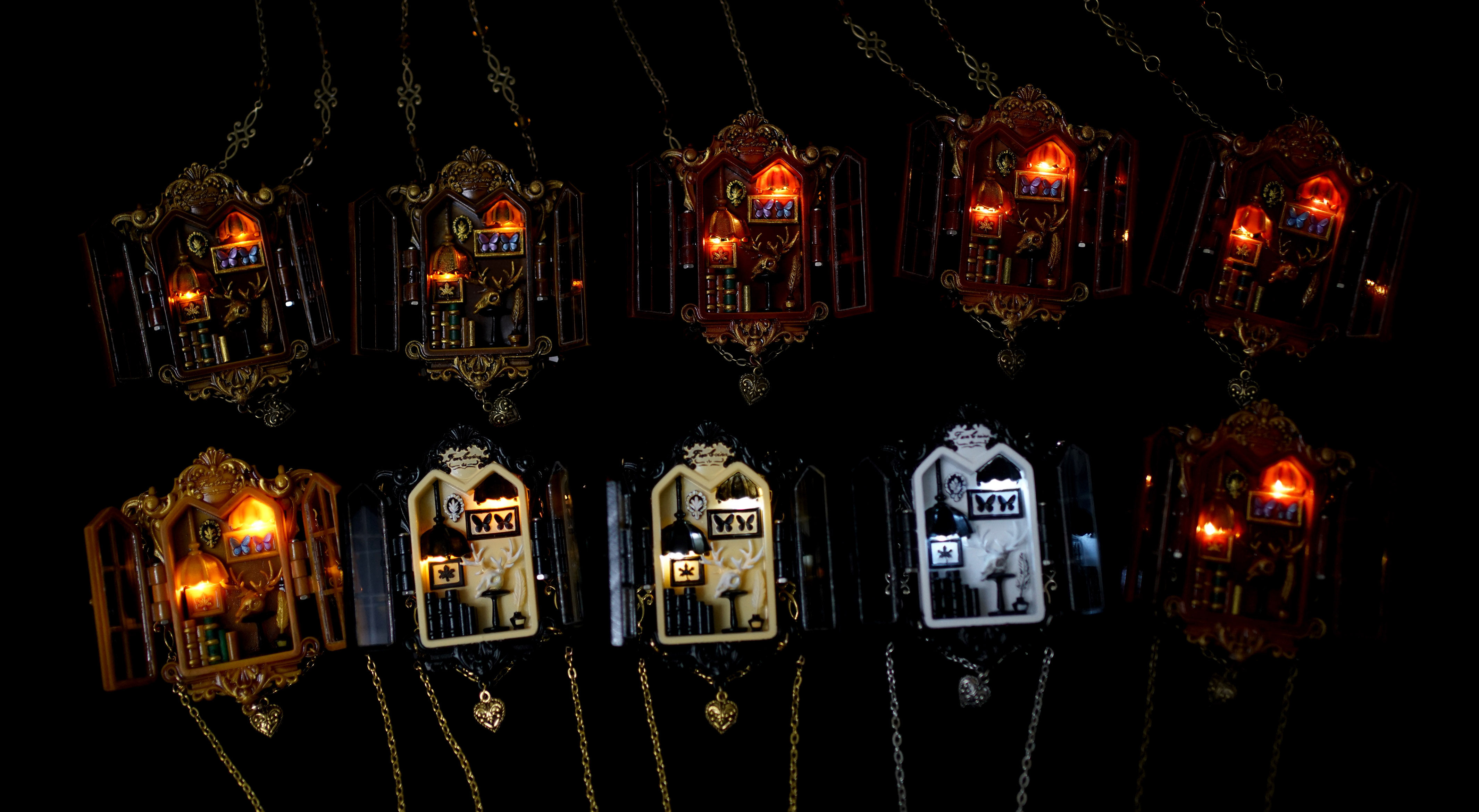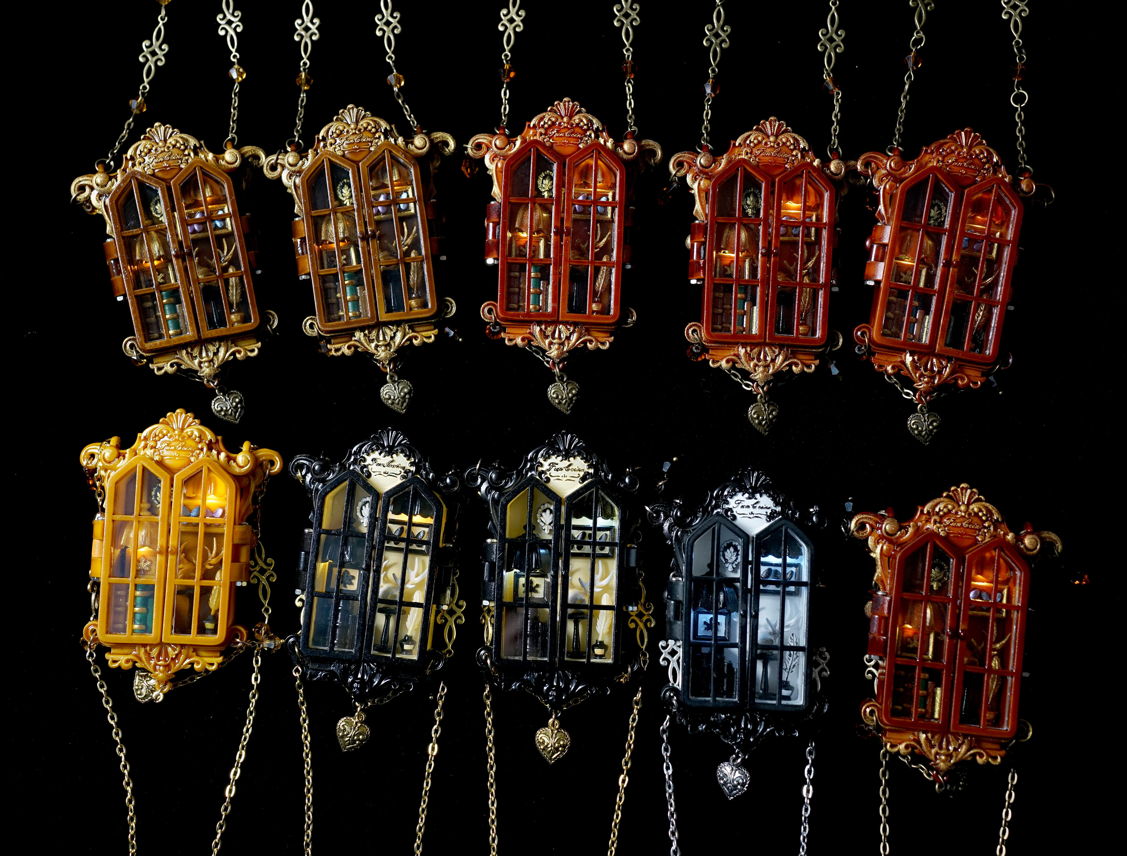 项链主体为手工上色,会有不均匀和笔触痕迹,有些小零件会粘蓝丁胶固定在木棍上进行上色,会留下一些痕迹(背盖的印子比较大),窗框会有胶水的痕迹,合页连接处安装螺丝测试的时候有脱漆,补漆后会出现不均匀的色块,放电池的背盖里面颜料堆积太厚导致合不上,后期用刮刀刮掉了(外观看不到,不属于瑕疵)。一个链接对应一个项链,可以放大图片查看细节,拍下即默认上述手工小瑕疵。