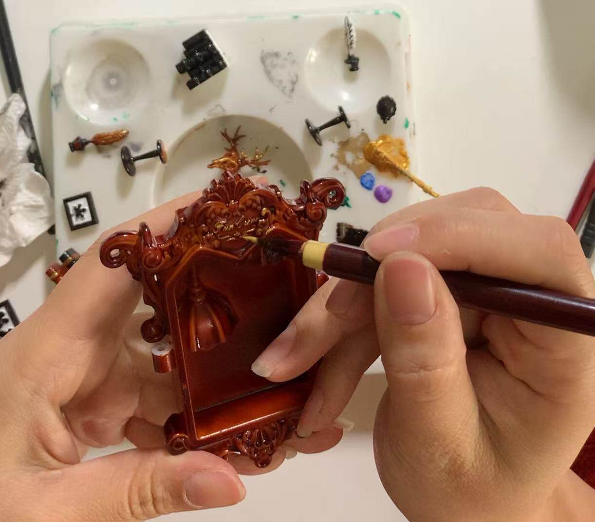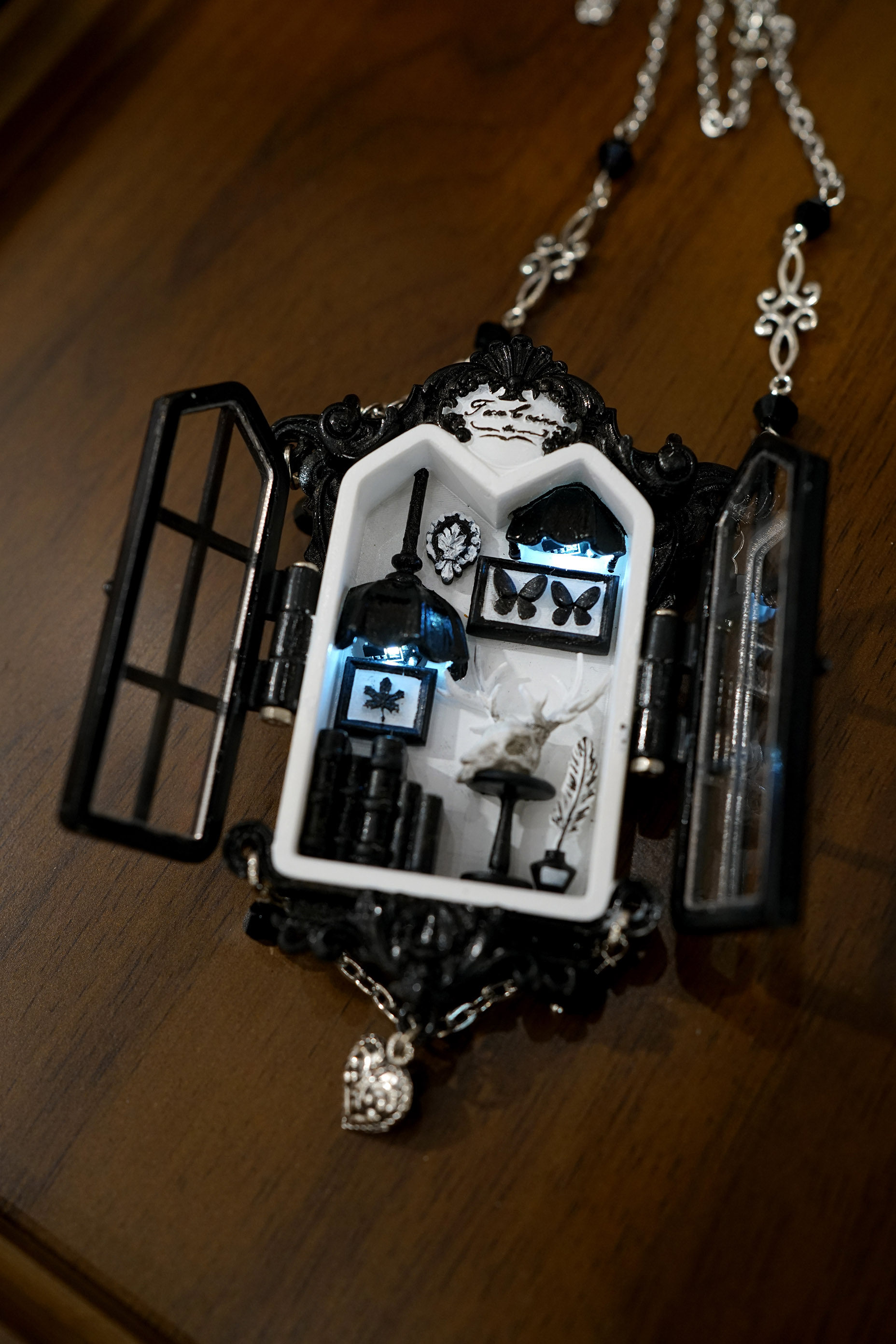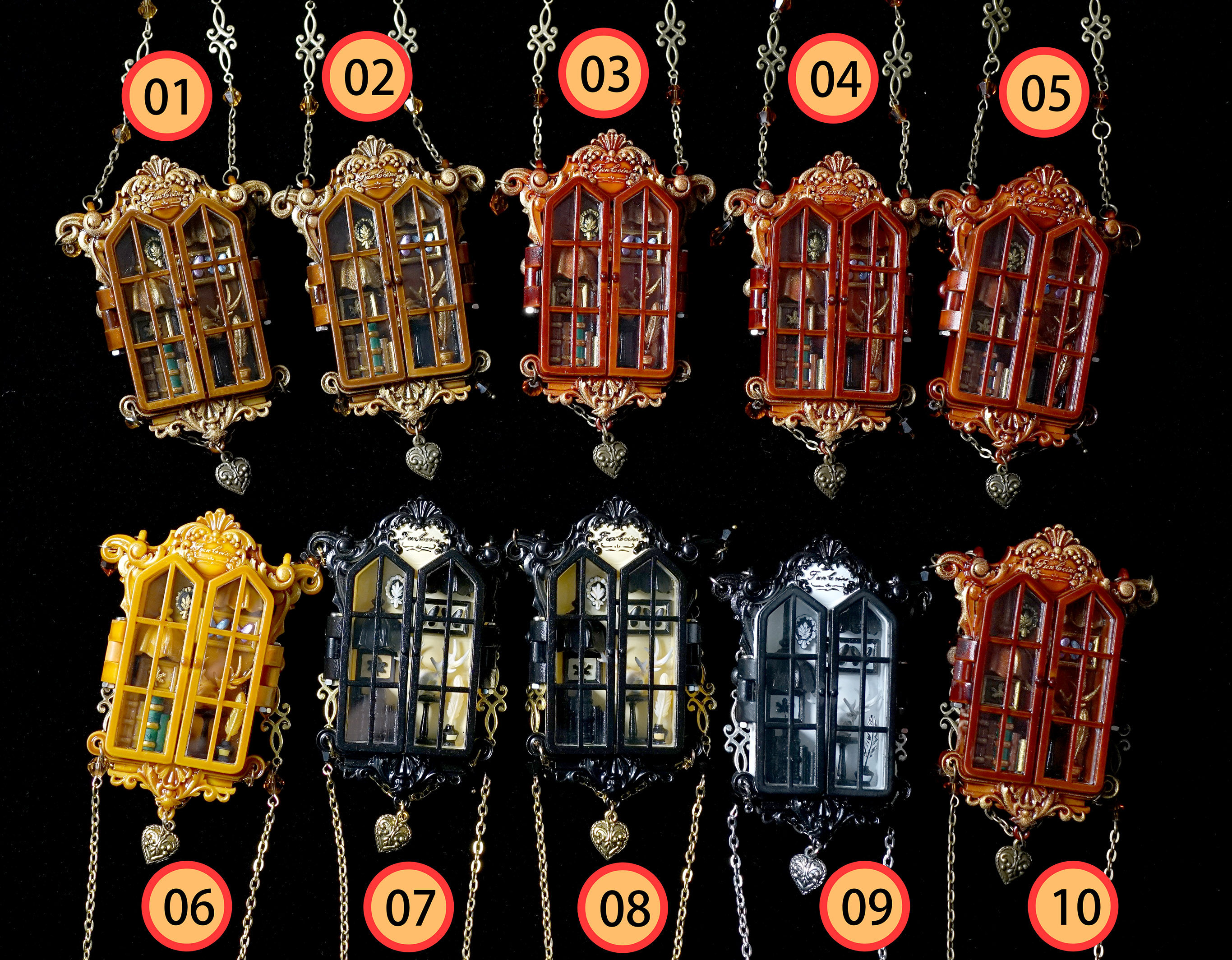 项链主体为手工上色,会有不均匀和笔触痕迹,有些小零件会粘蓝丁胶固定在木棍上进行上色,会留下一些痕迹(背盖的印子比较大),窗框会有胶水的痕迹,合页连接处安装螺丝测试的时候有脱漆,补漆后会出现不均匀的色块,放电池的背盖里面颜料堆积太厚导致合不上,后期用刮刀刮掉了(外观看不到,不属于瑕疵)。一个链接对应一个项链,可以放大图片查看细节,拍下即默认上述手工小瑕疵。