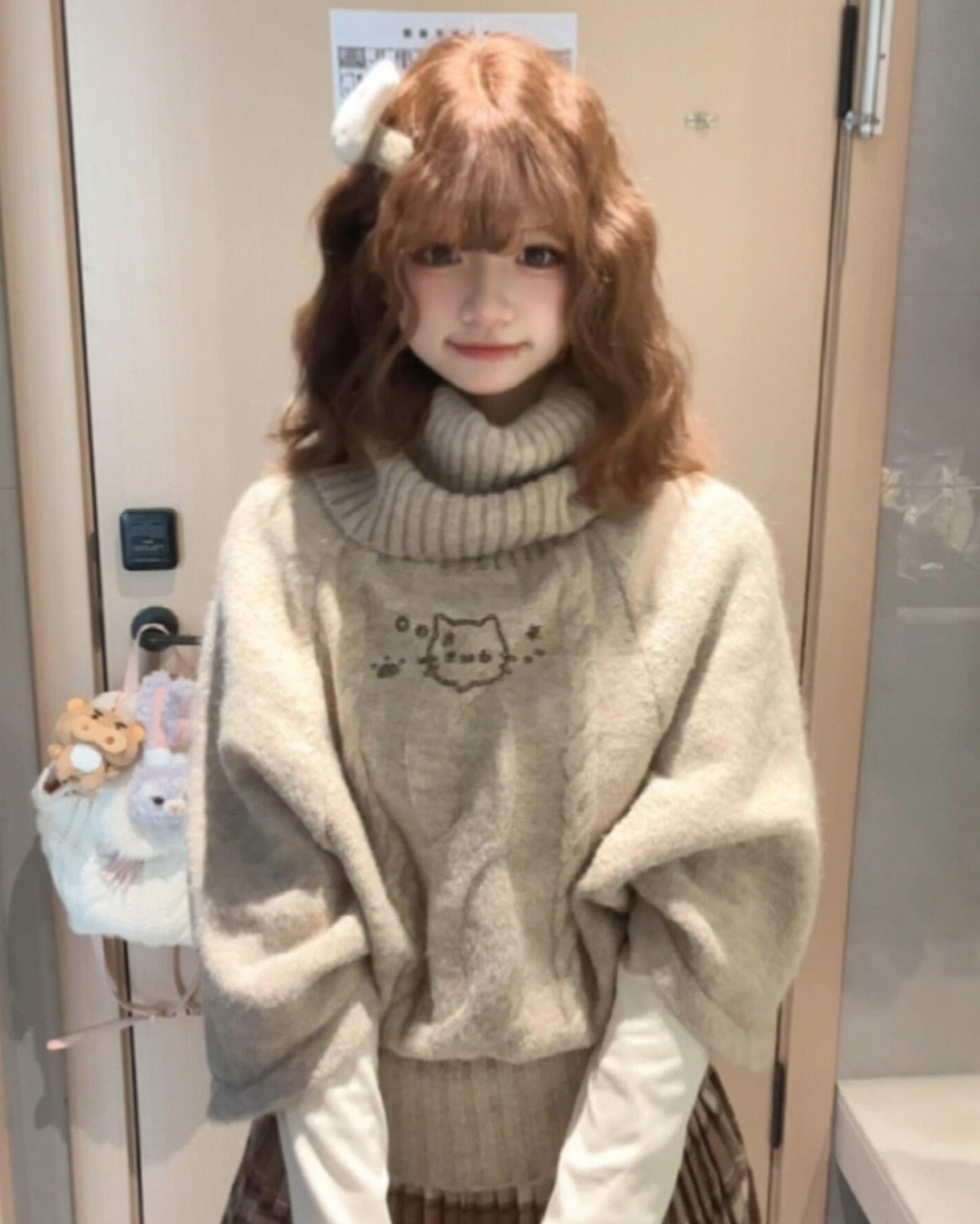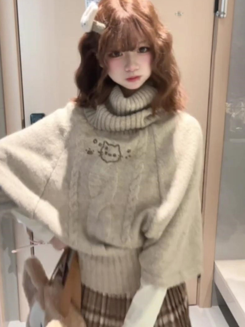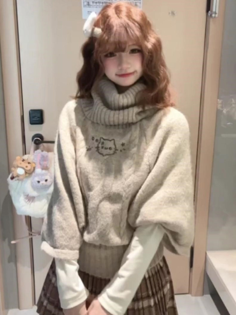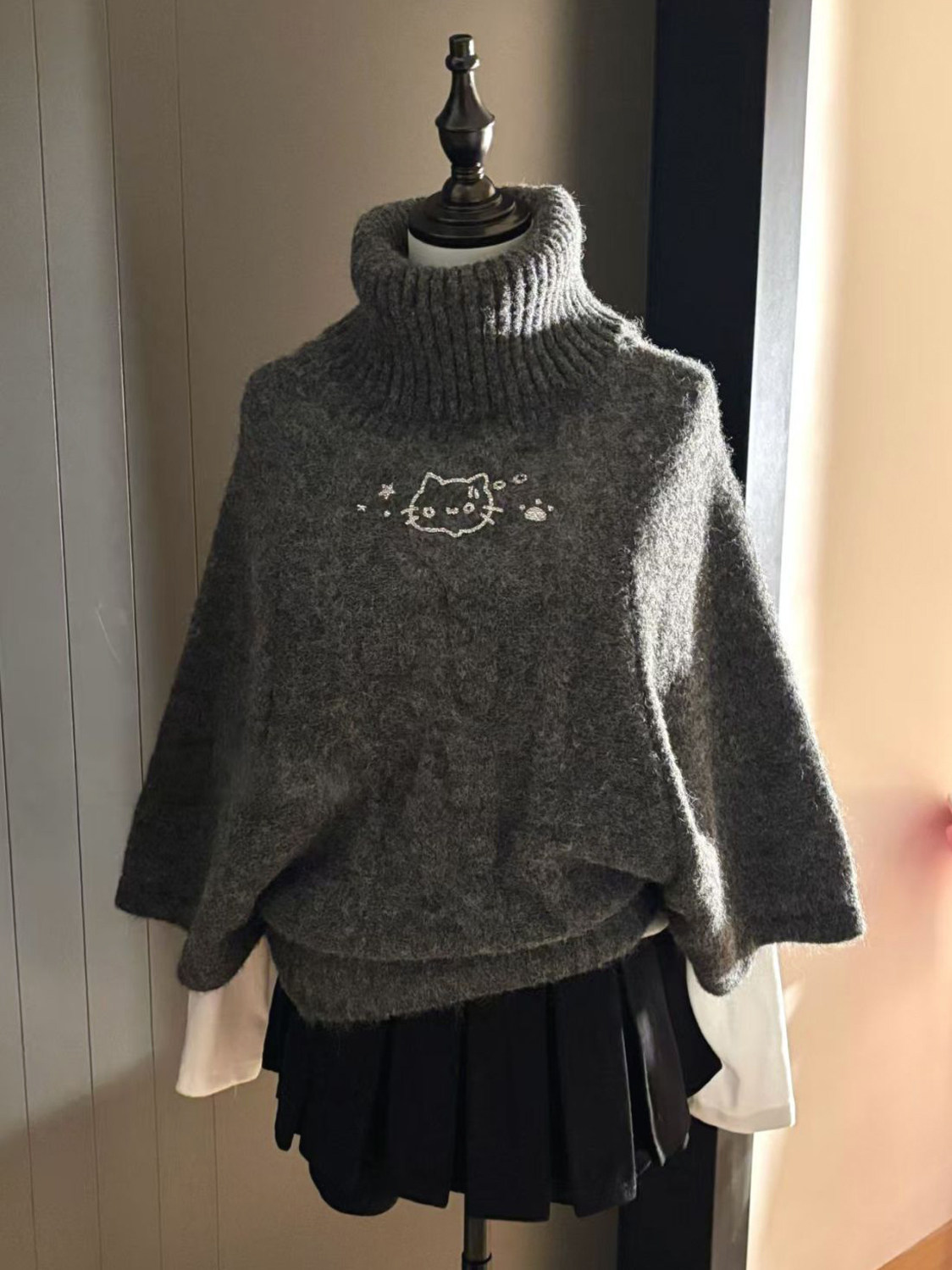 Sweet and cute cat-print batwing sleeve turtleneck sweater for autumn and winter, Korean style, slim fit, versatile, flattering and brightening.
