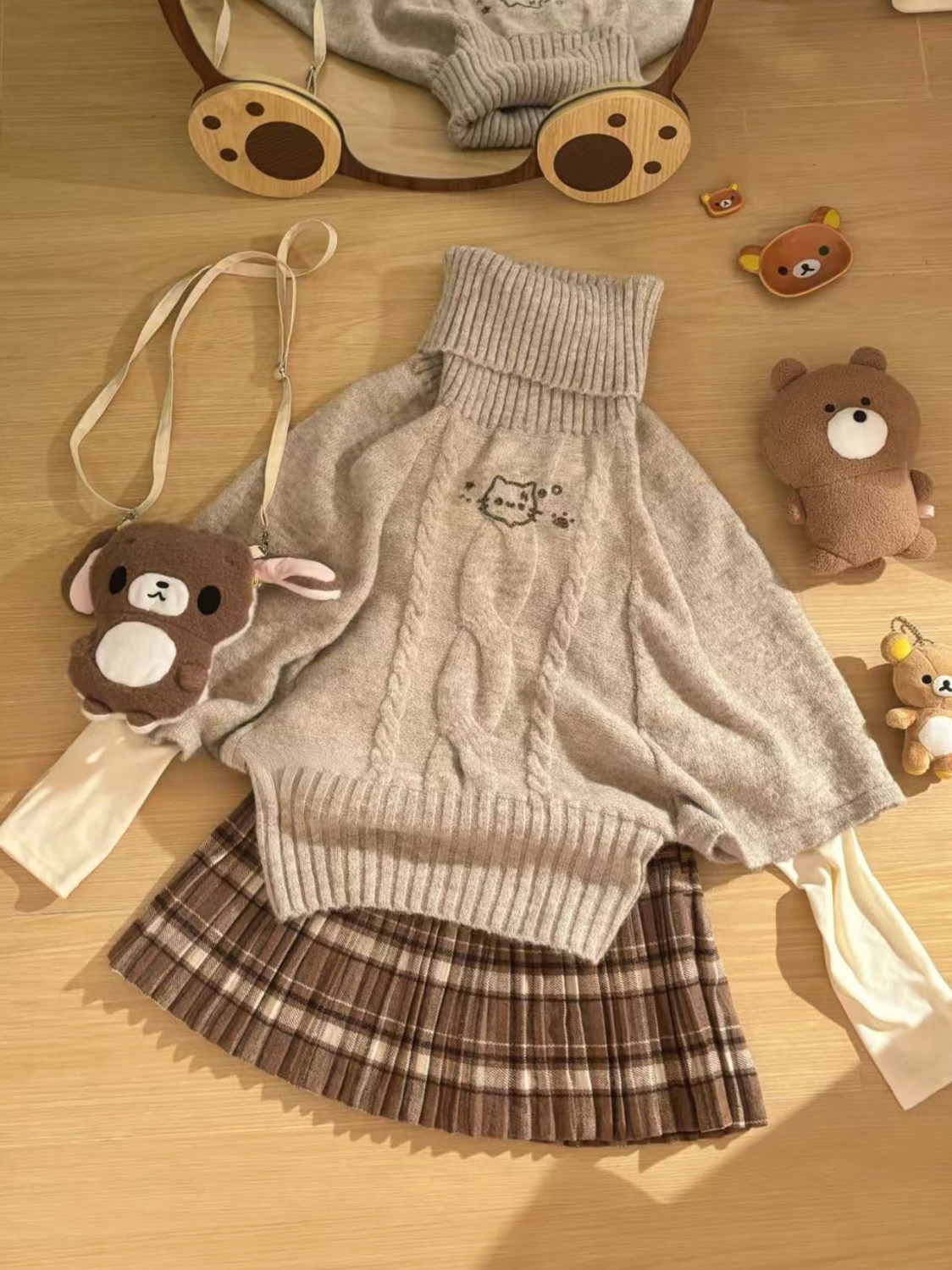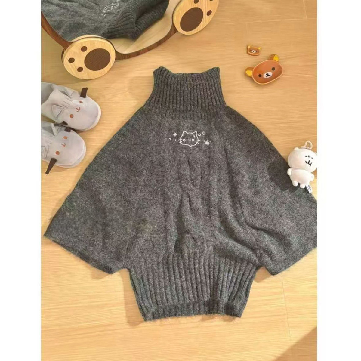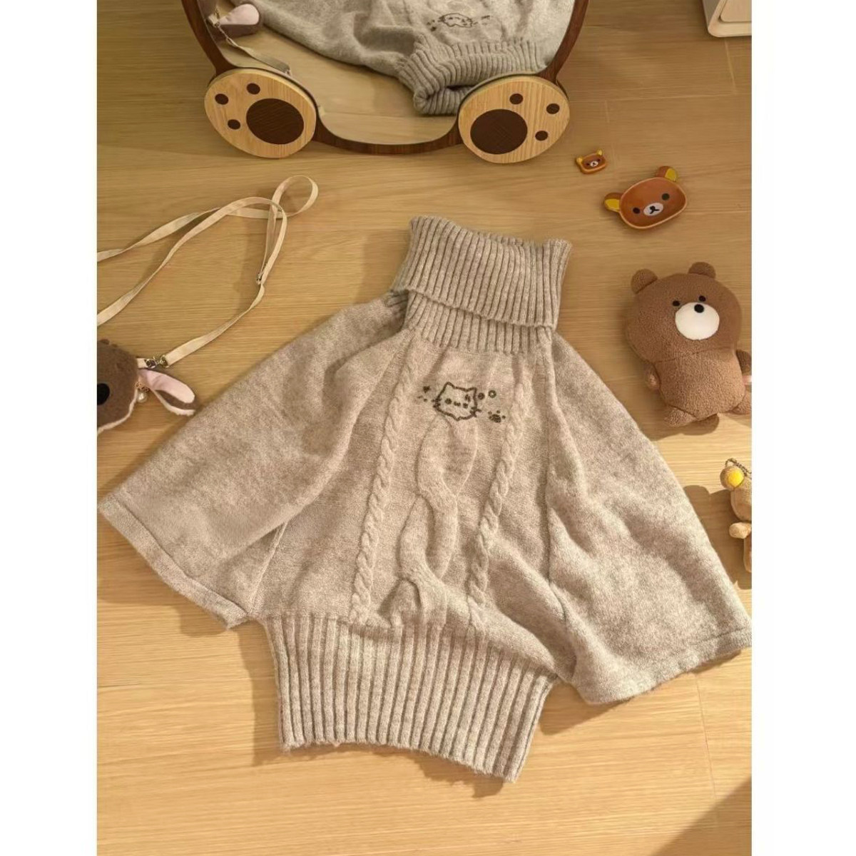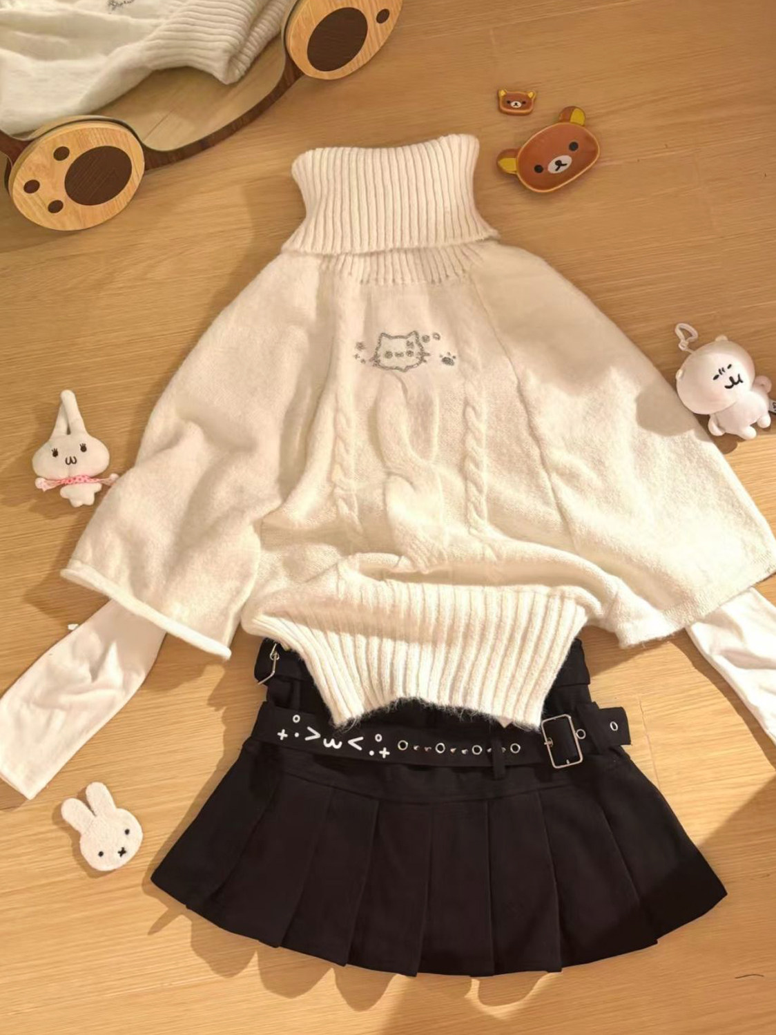 Sweet and cute cat-print batwing sleeve turtleneck sweater for autumn and winter, Korean style, slim fit, versatile, flattering and brightening.