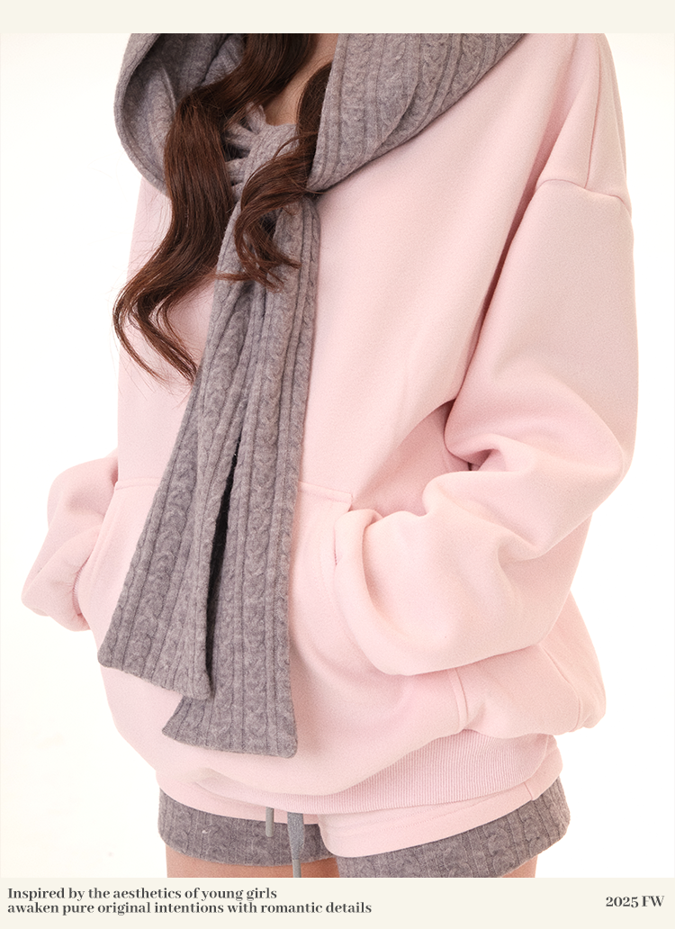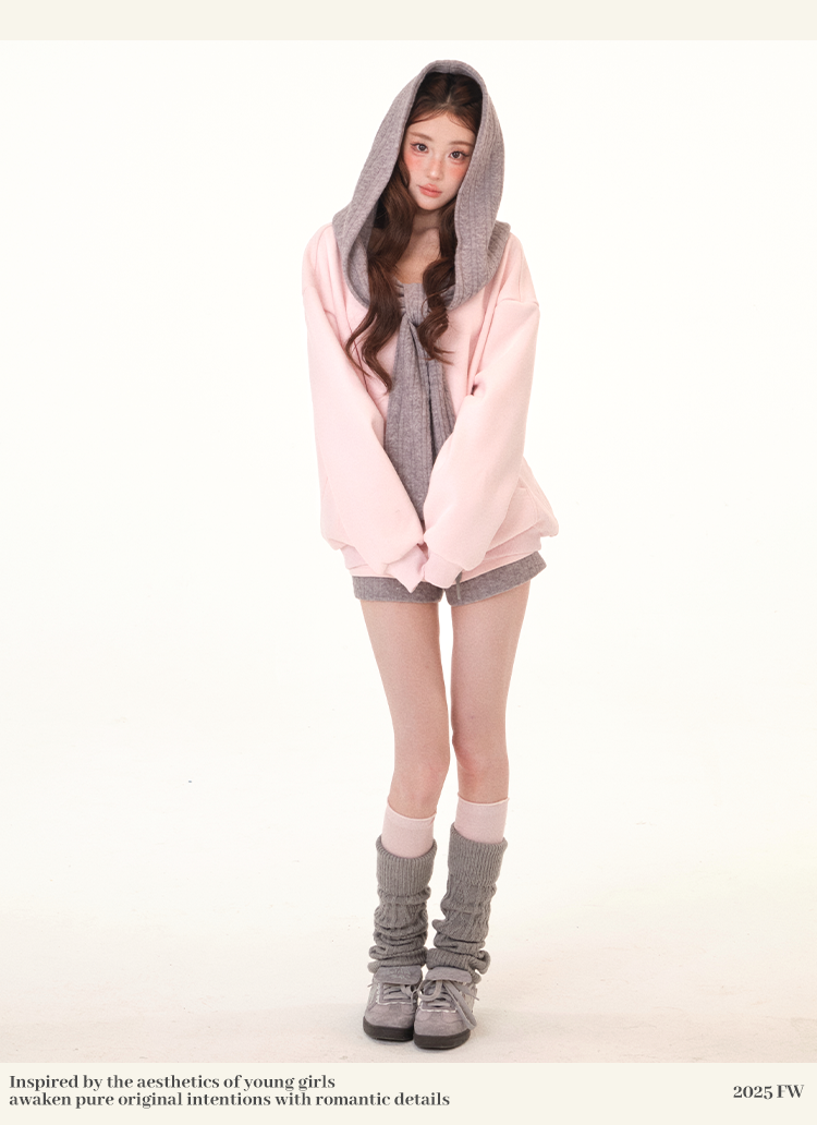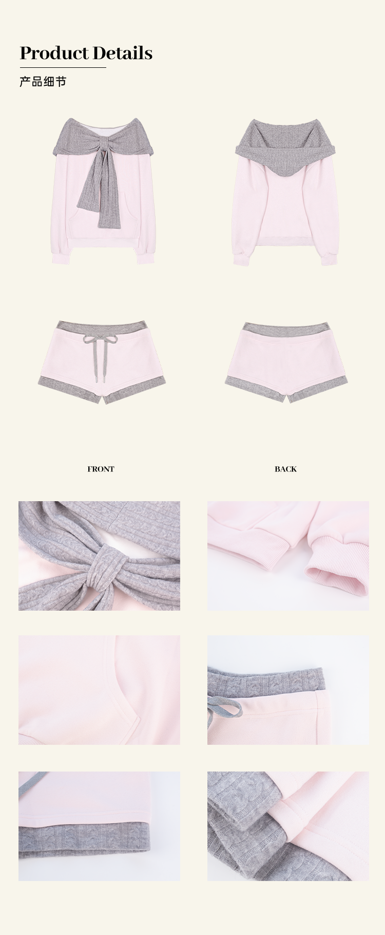雾港甜章 设计感撞色一字肩多穿连帽宽松加绒卫衣短裤套装秋冬 [Original Page Link]