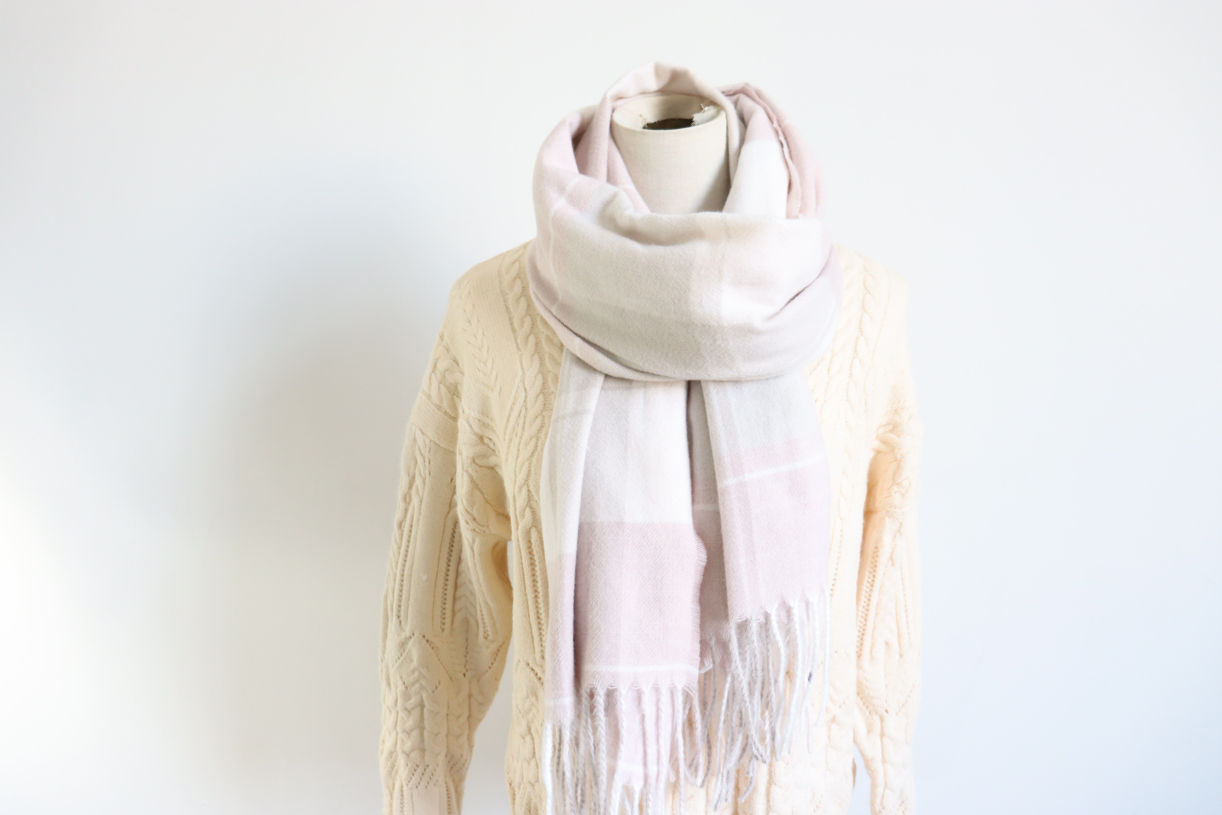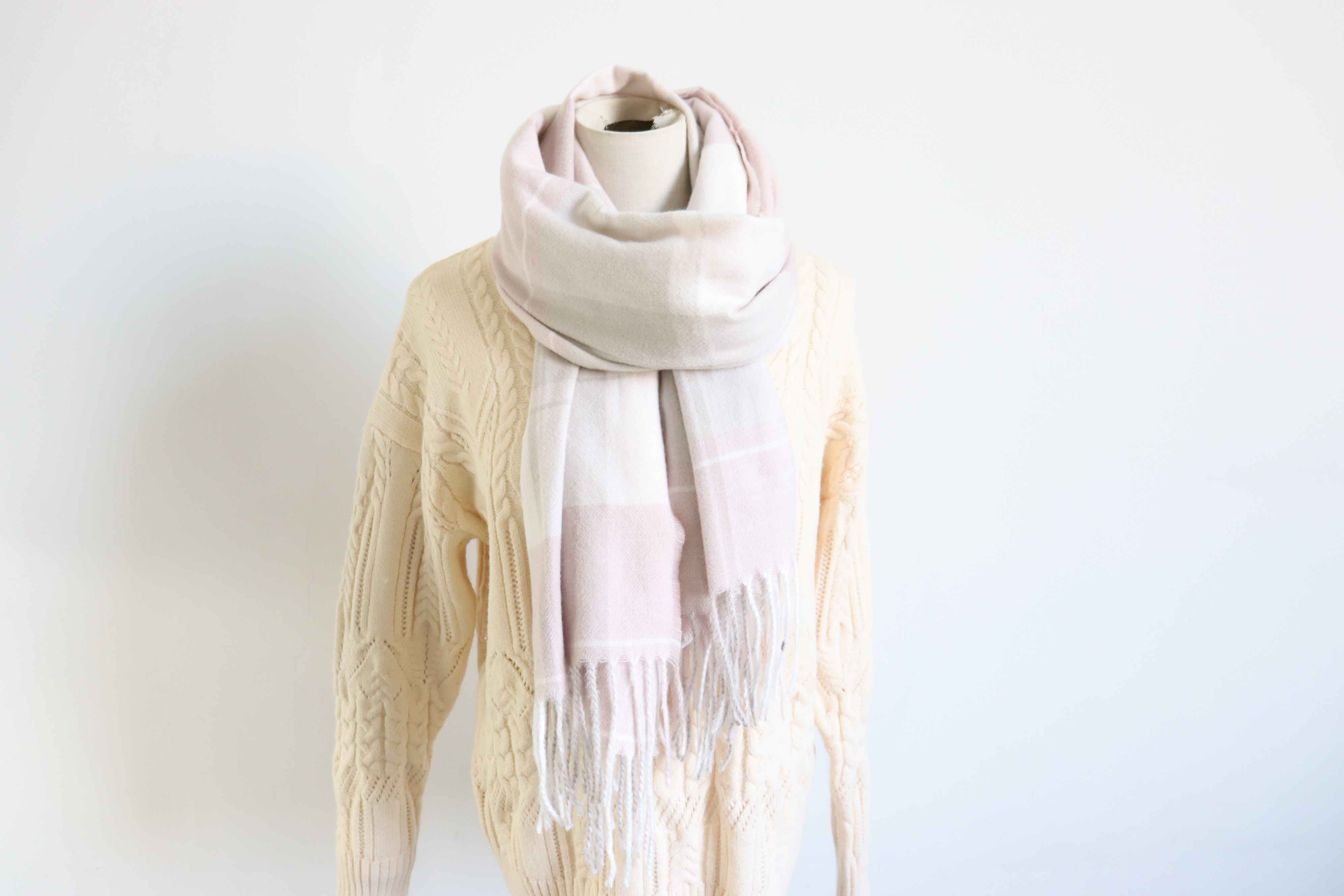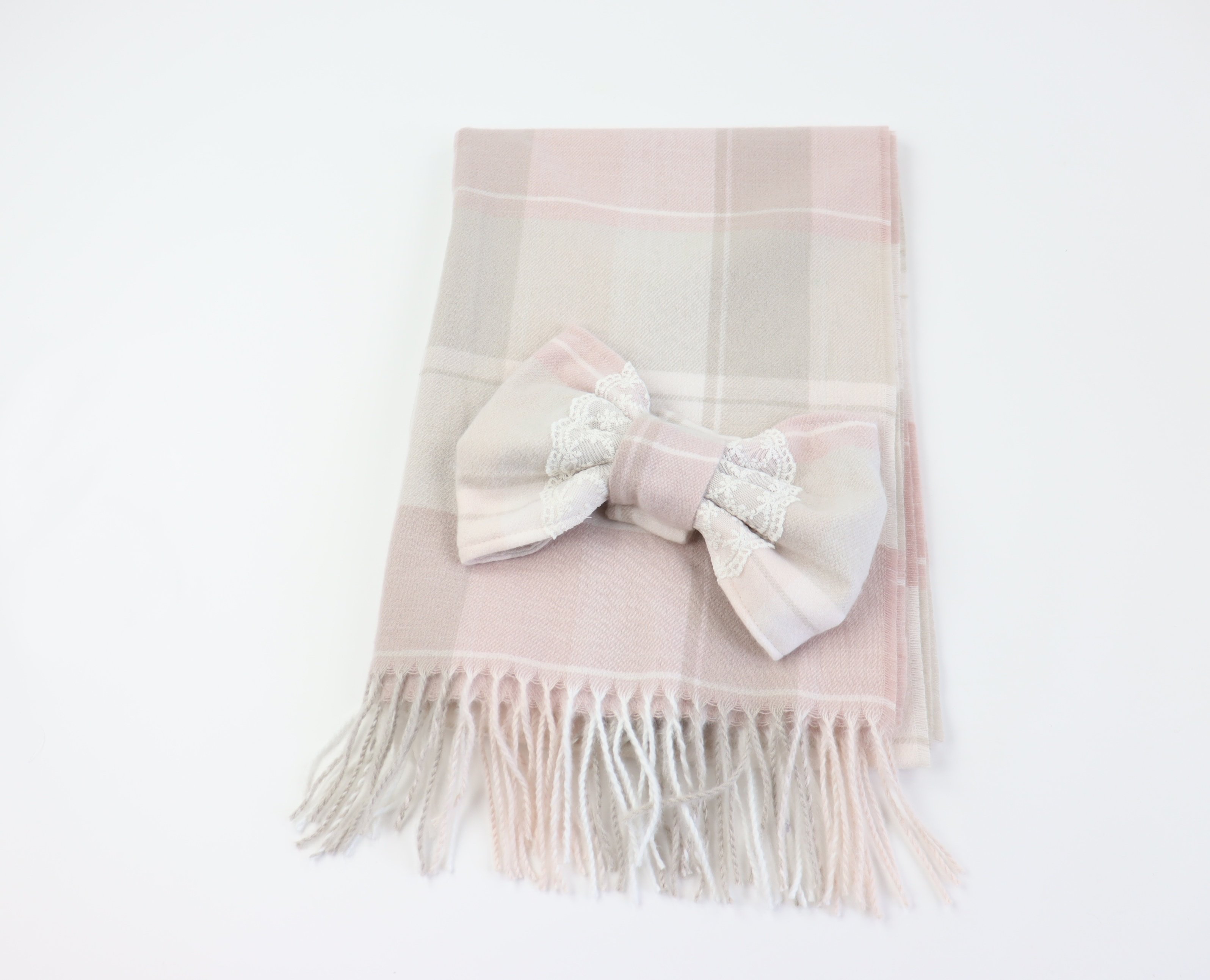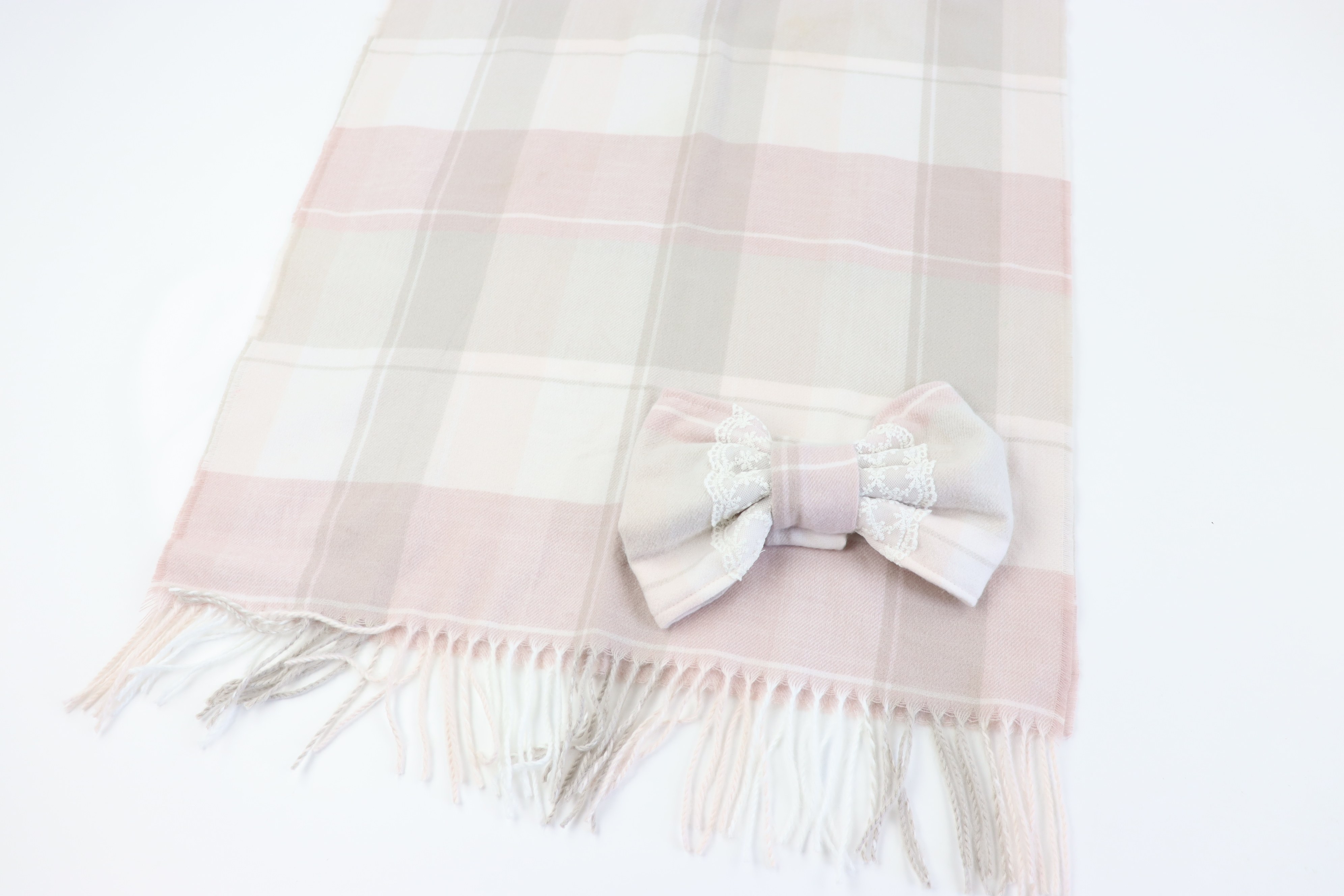 Grayish pink bow scarf plaid shawl women's tassel sweet soft Lolita lace cute scarf Japanese style