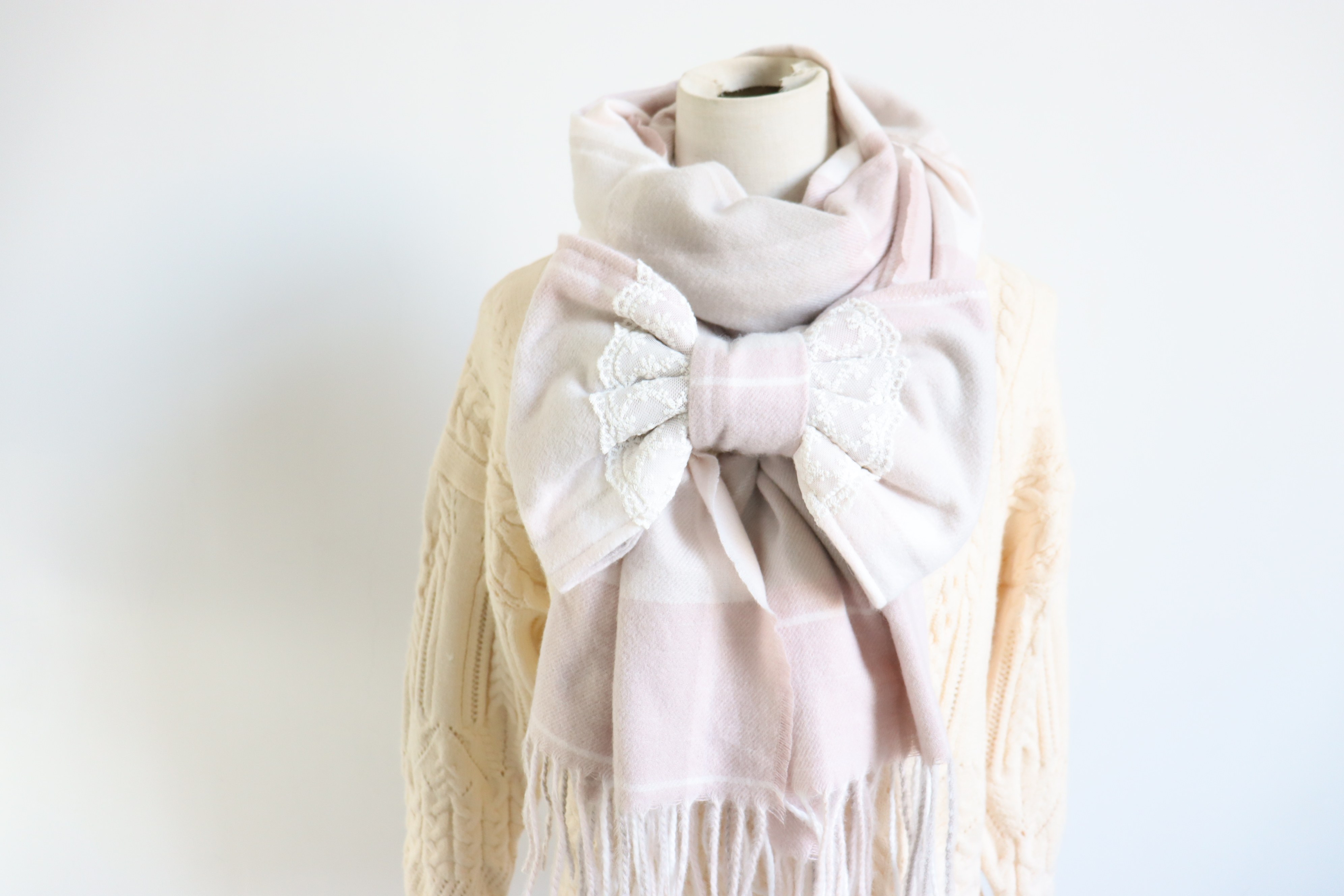 灰粉色蝴蝶结围巾格子披肩女流苏甜美软糯洛丽塔蕾丝可爱围脖日系 [Original Page Link]