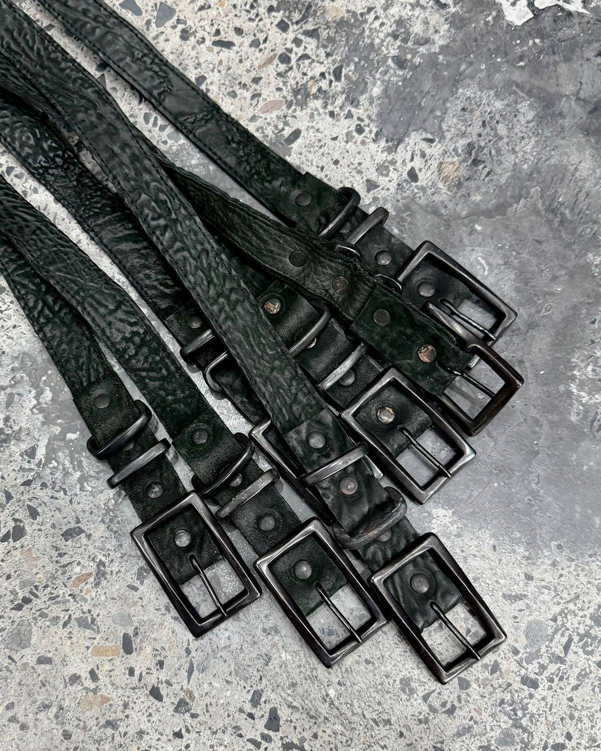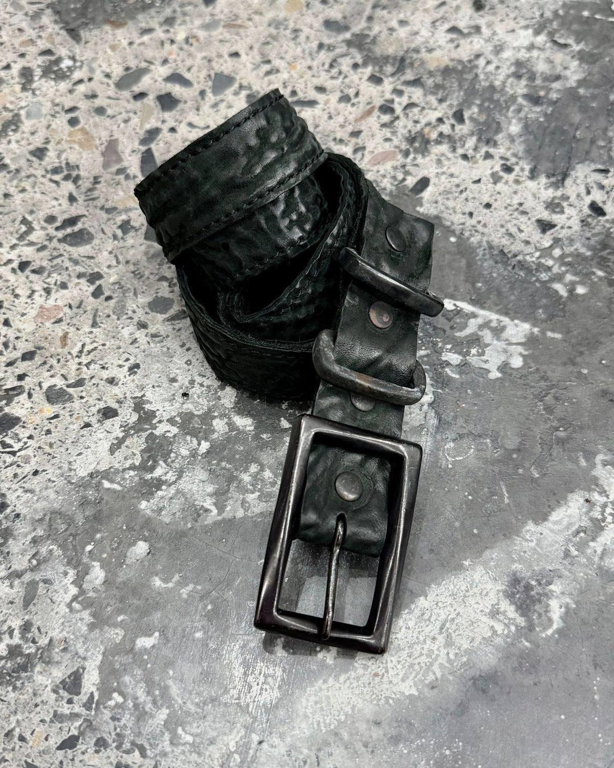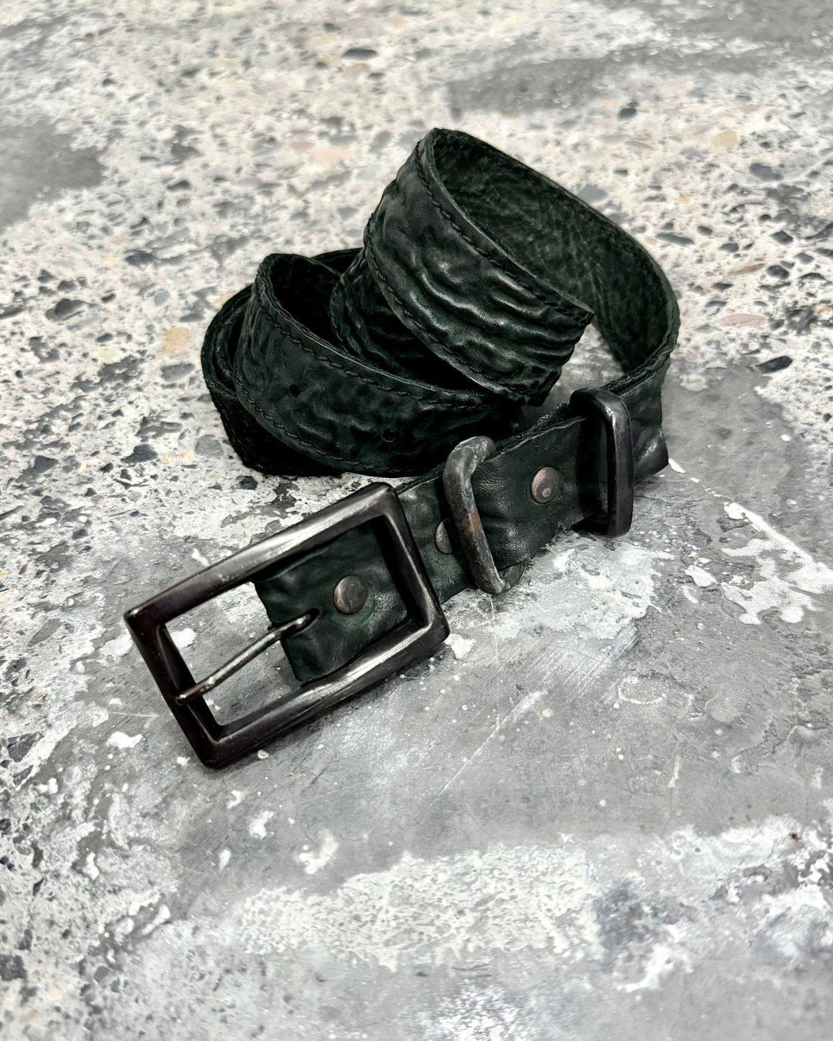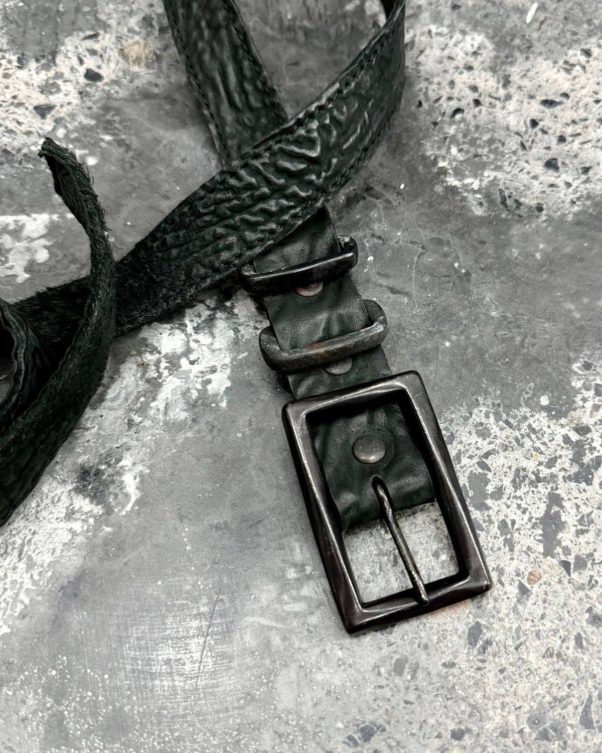 Scarred and shrunk horsehide dark avant-garde artisan bronze buckle belt