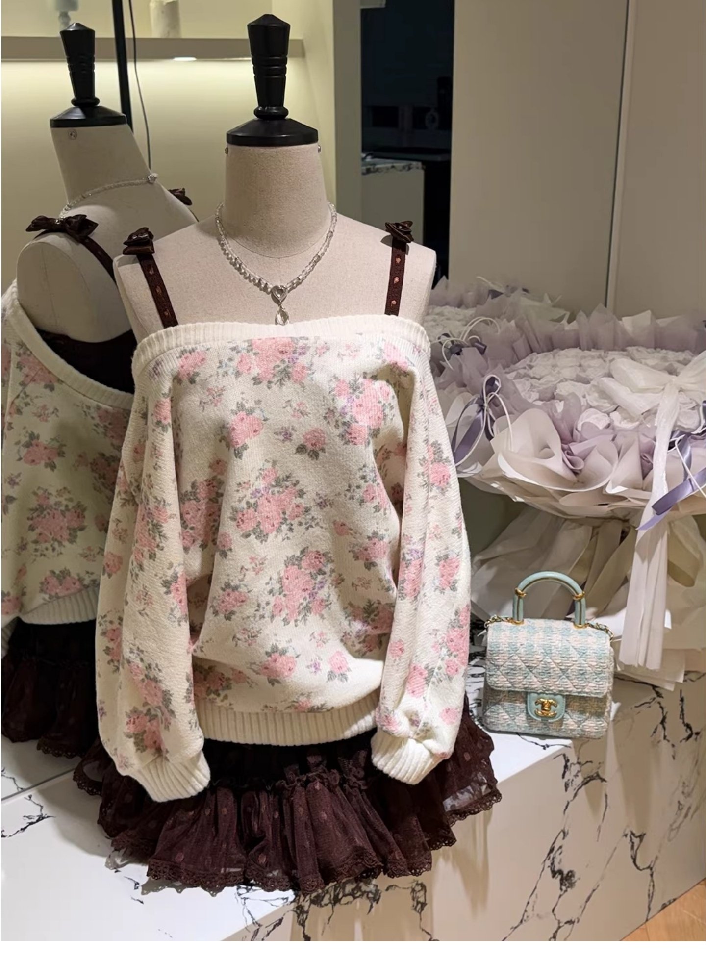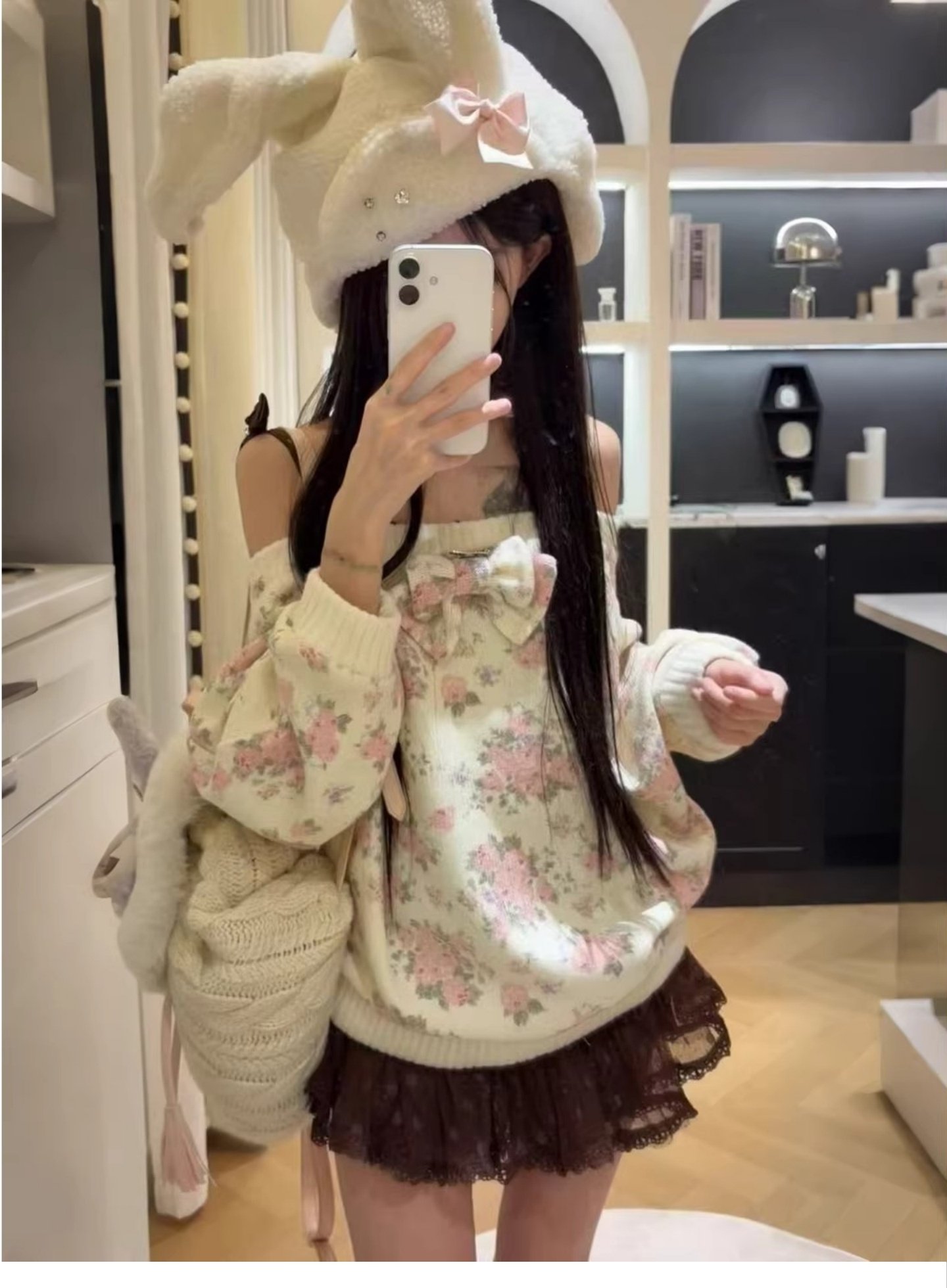 一字肩蝴蝶结碎花长袖针织毛衣女装秋冬季慵懒宽松设计感小众上衣 [Original Page Link]