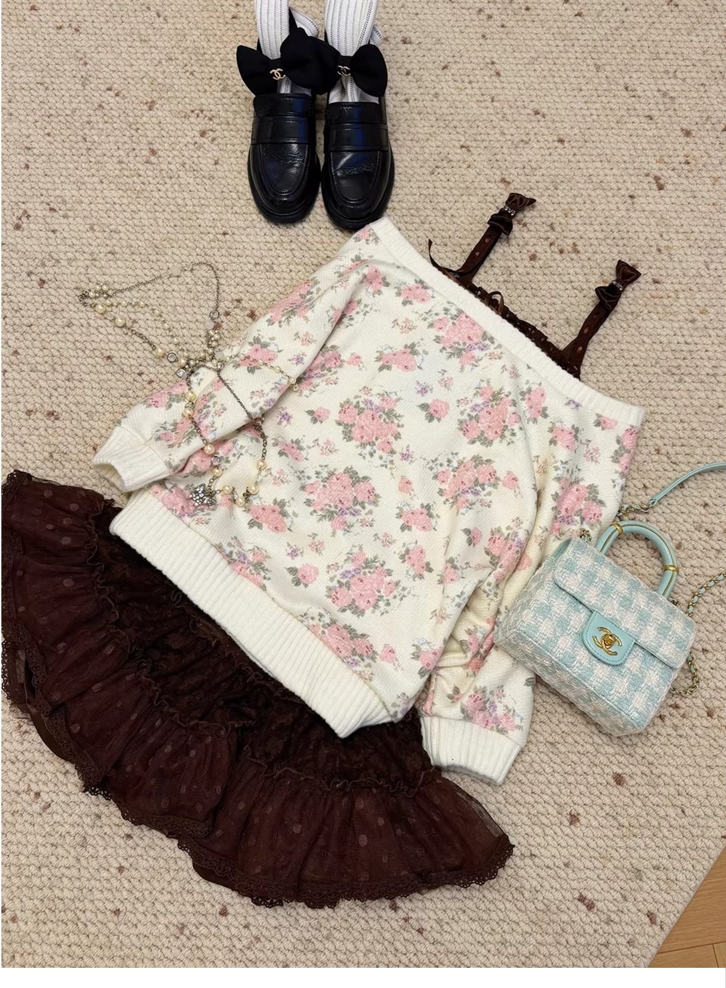 Off-the-shoulder floral print long-sleeved knit sweater for women, perfect for autumn and winter, featuring a relaxed, loose fit and unique design.