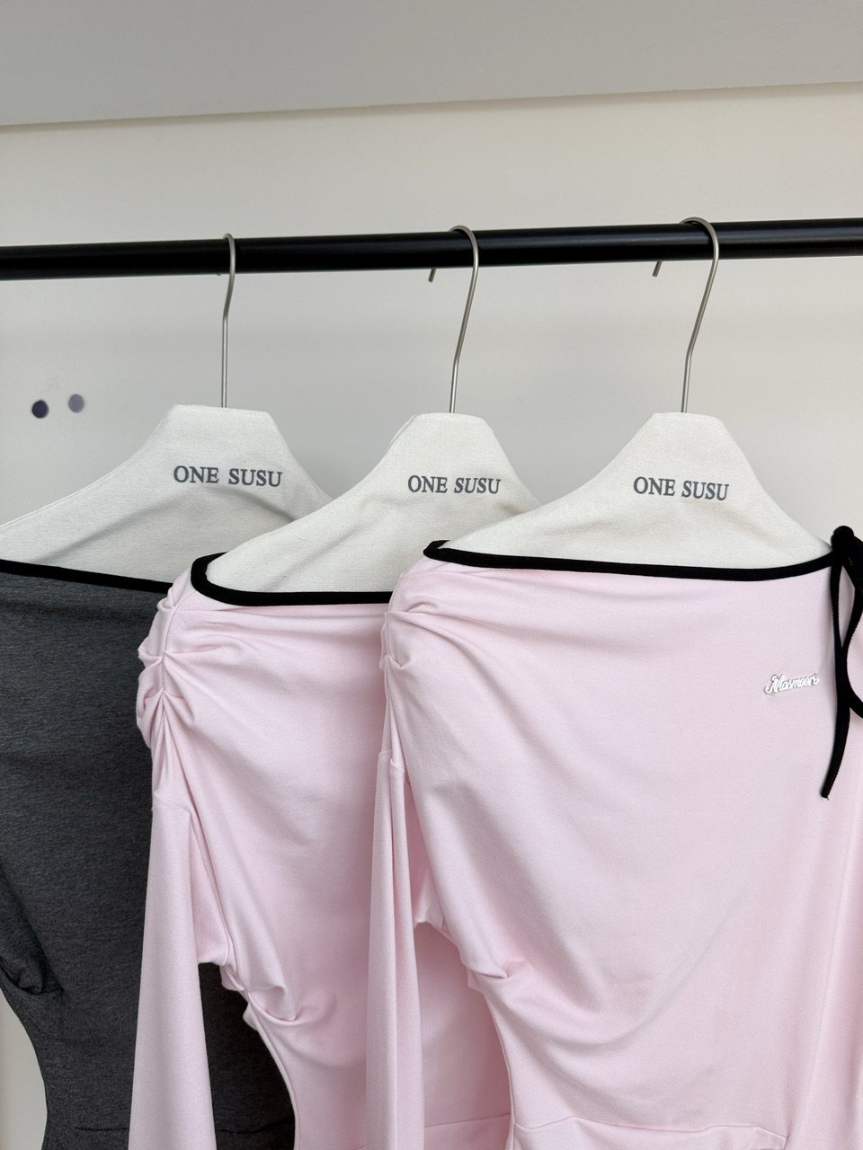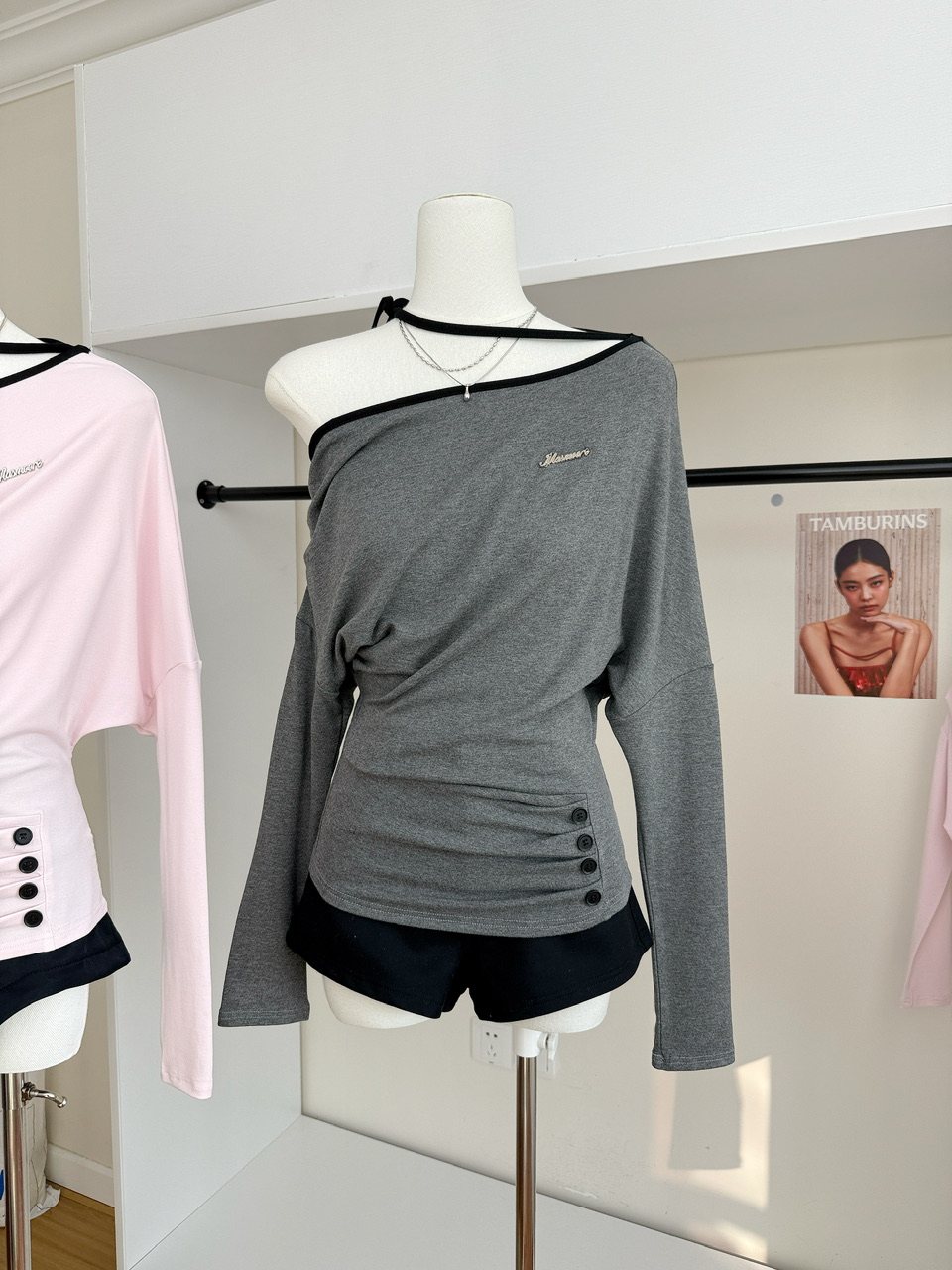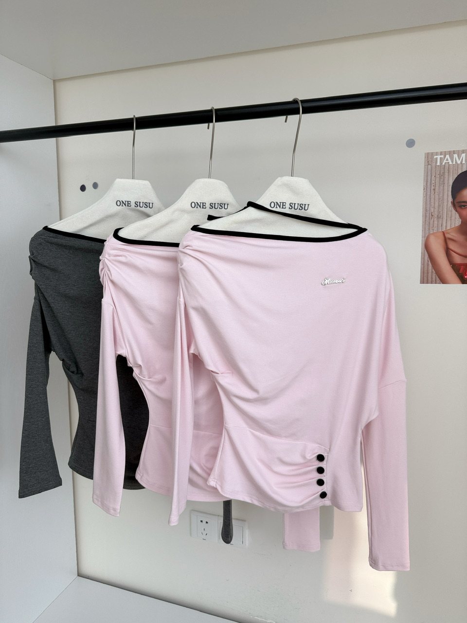 ArouRee, a K-pop trainee, wears a Korean-style long-sleeved off-shoulder halter neck T-shirt in autumn, a versatile pink top.