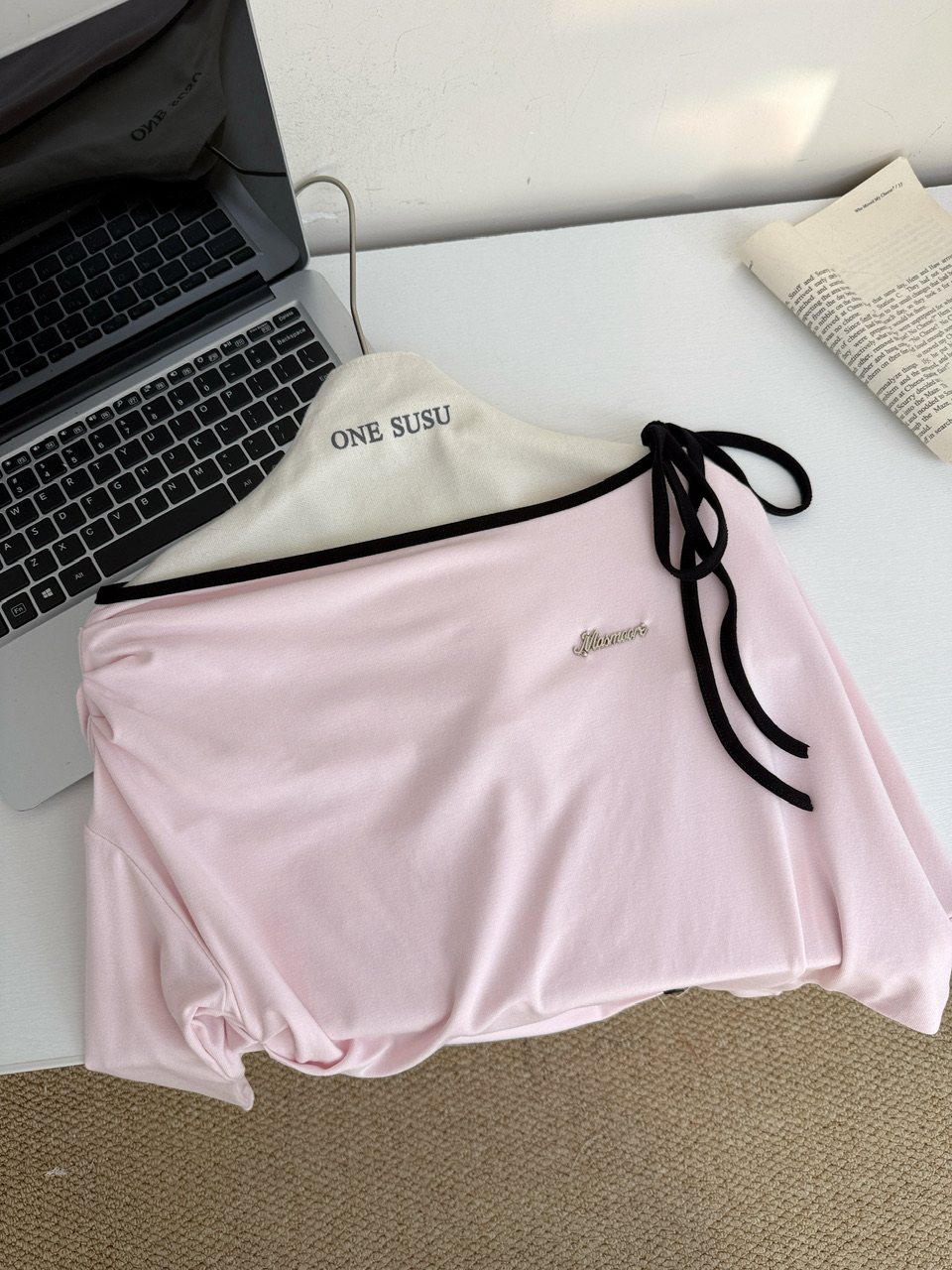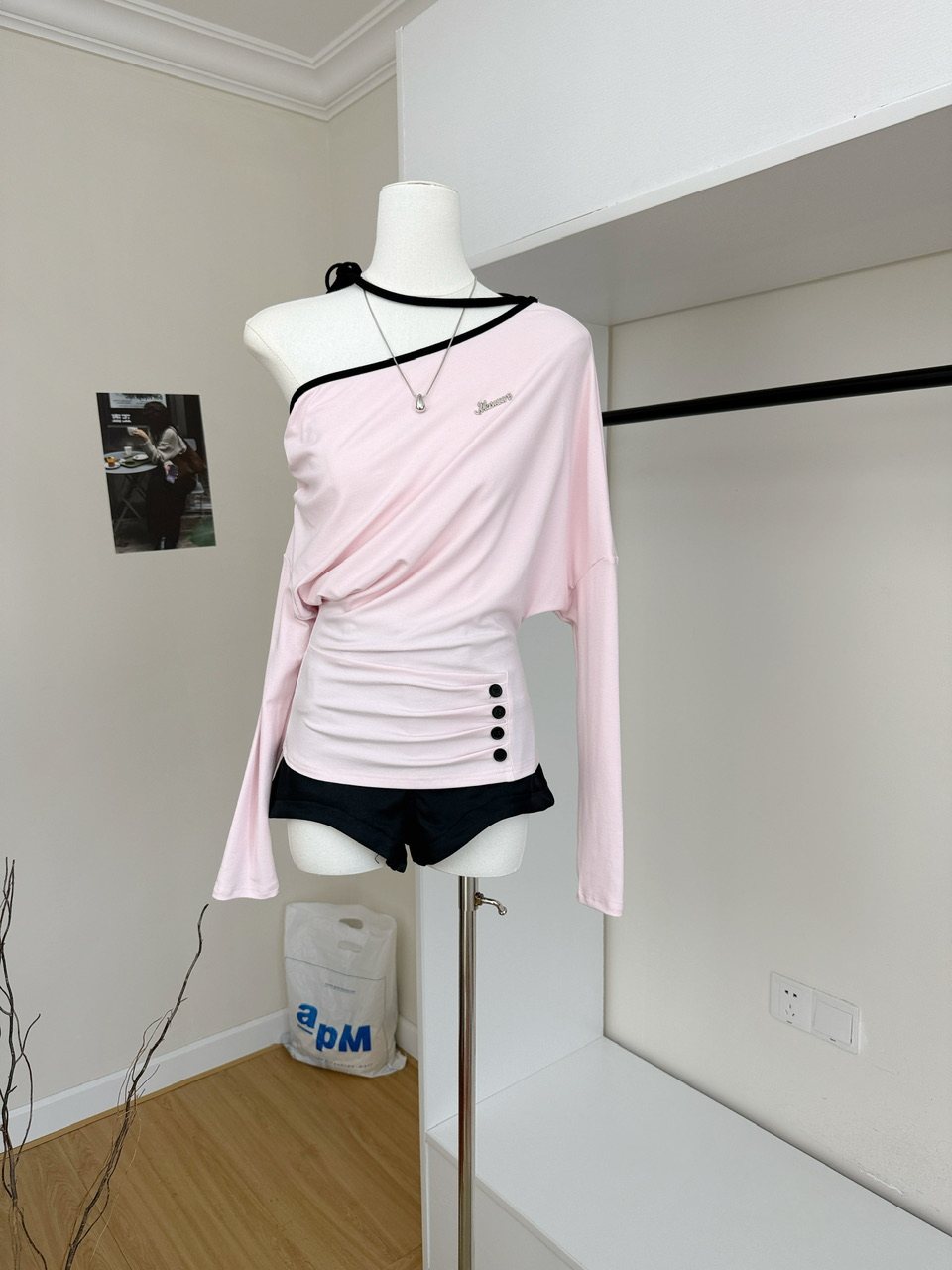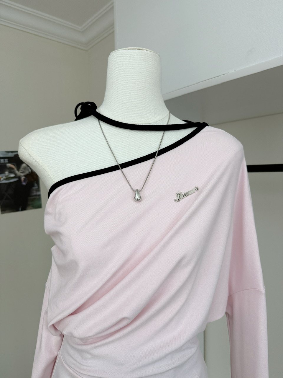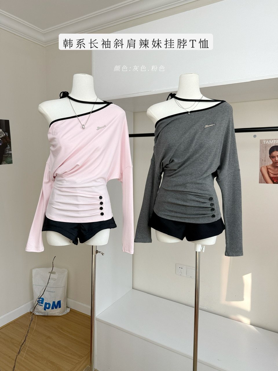 阿肉Ree 韩团练习生 %韩系长袖斜肩辣妹挂脖T恤女秋粉色百搭上衣 [Original Page Link]