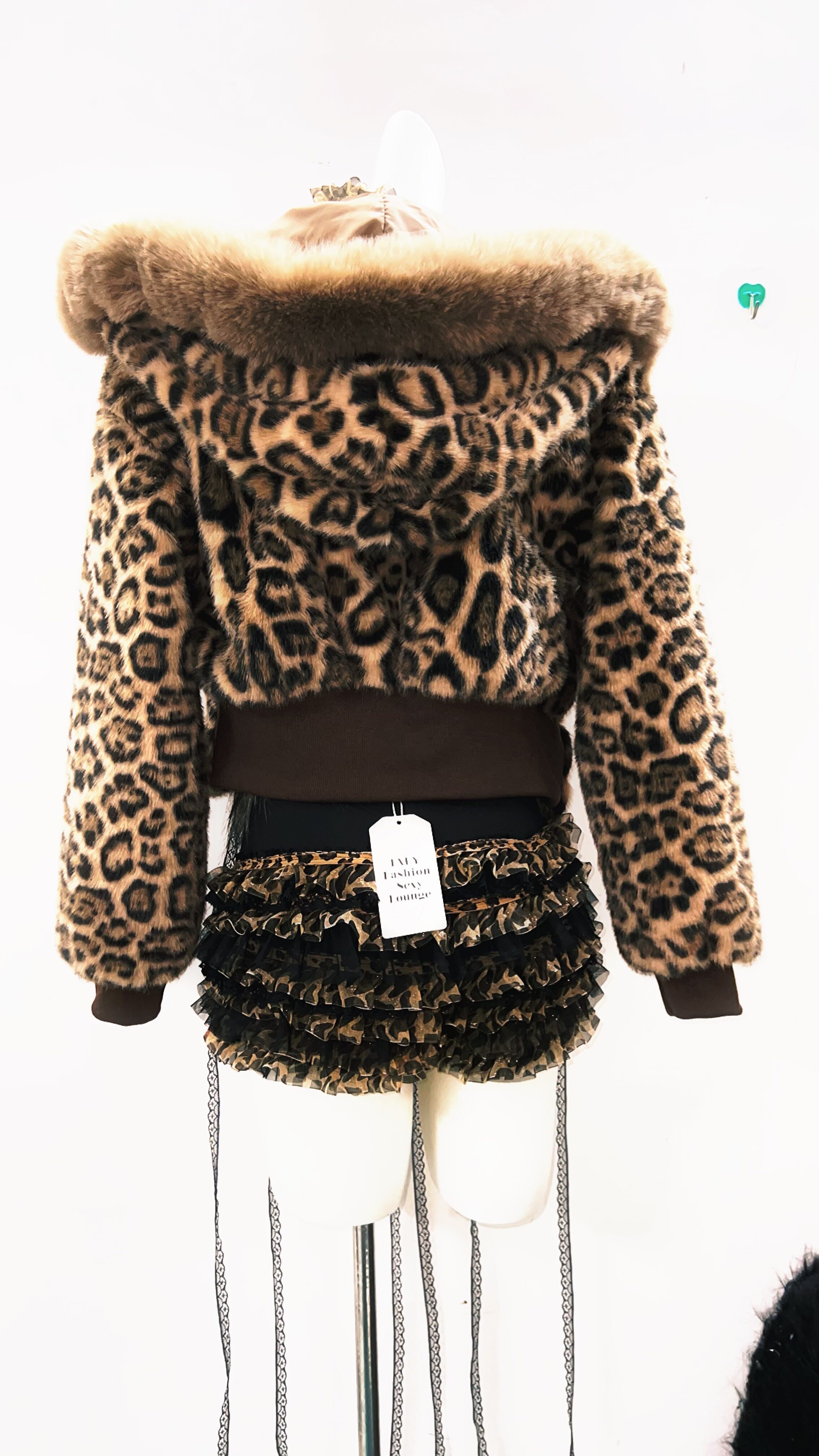GR Original Shibuya Vintage Suits, Leopard Print Jacket, Brown Fur Collar, Retro Y2K Visual Style Hooded Women's Clothing