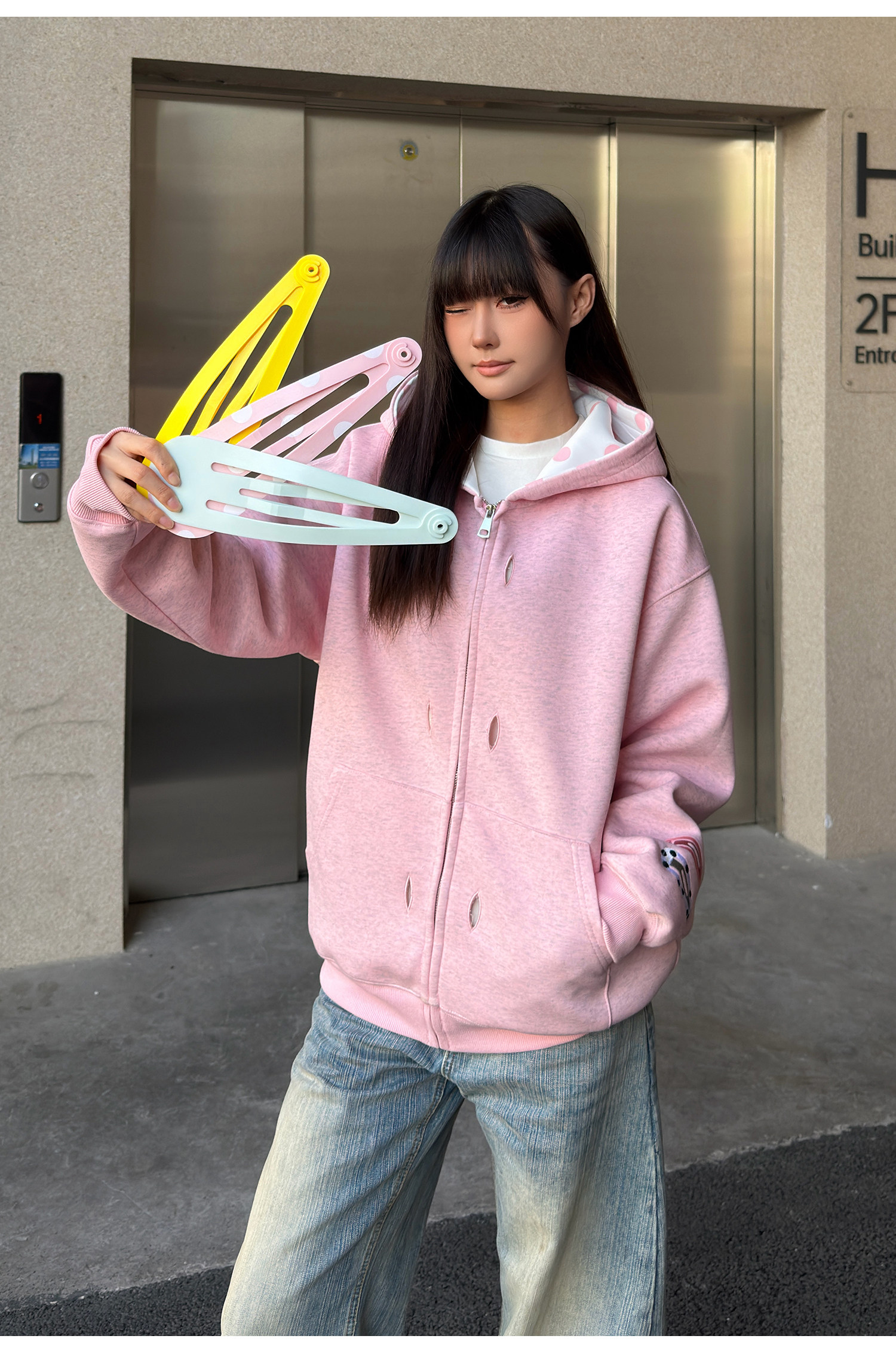 SREK's new design hair clip printed hooded sweatshirt, unisex long-sleeved loose-fitting oversized zip-up cardigan jacket.