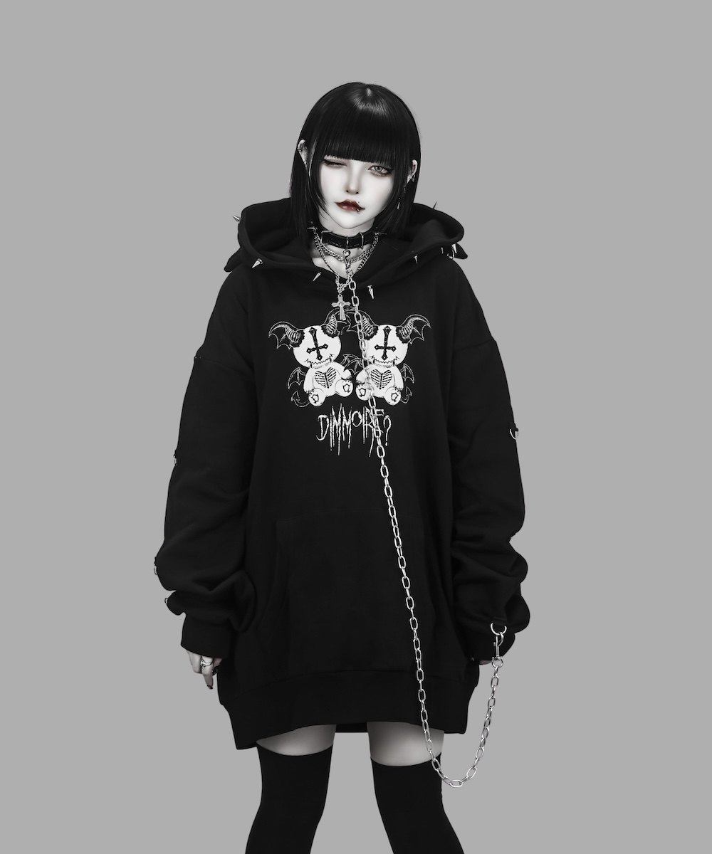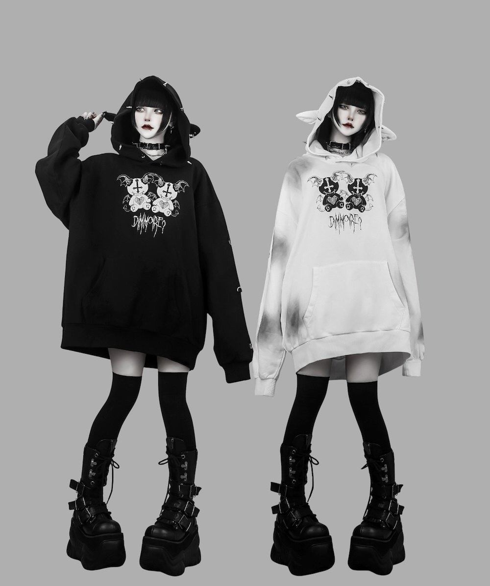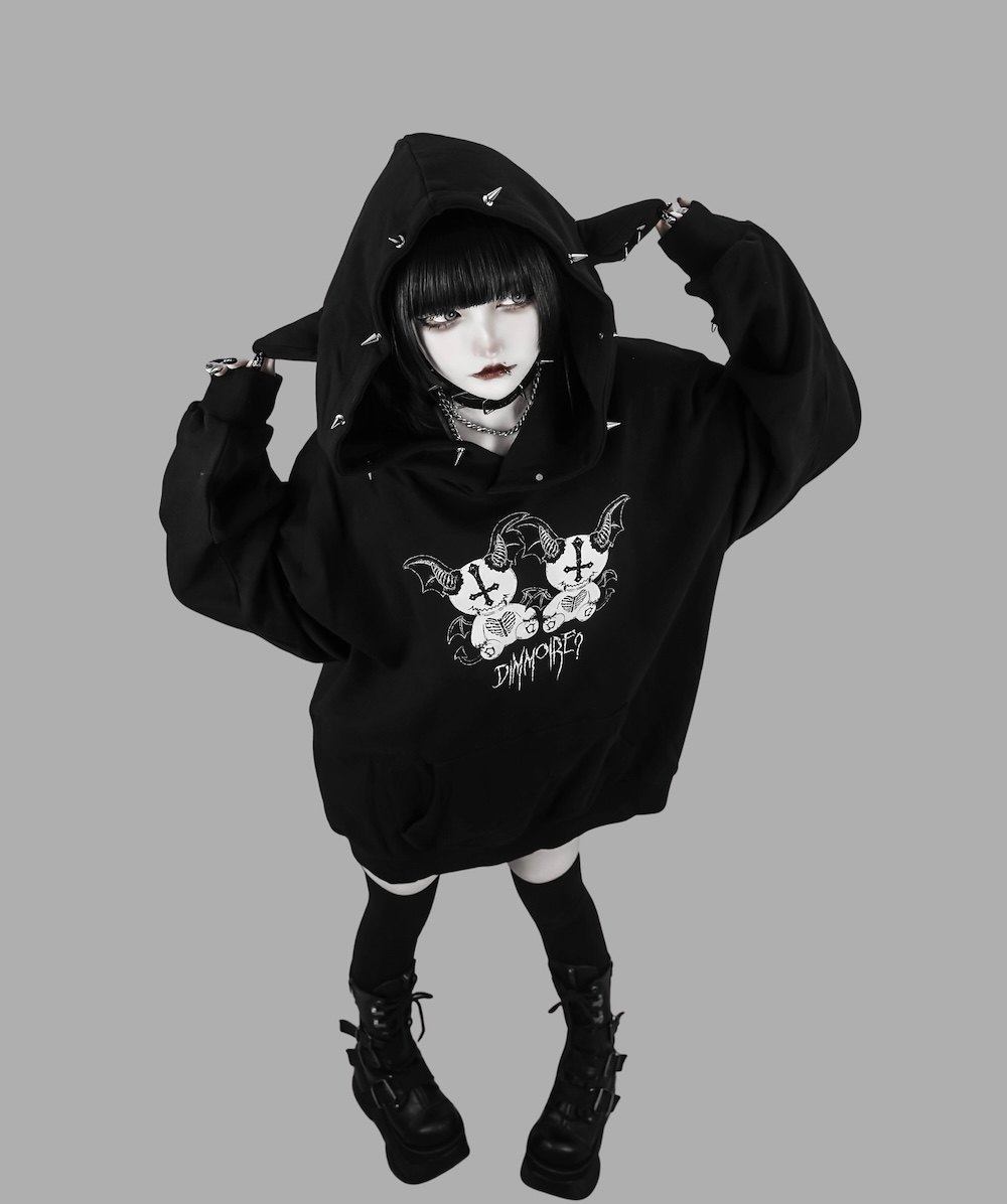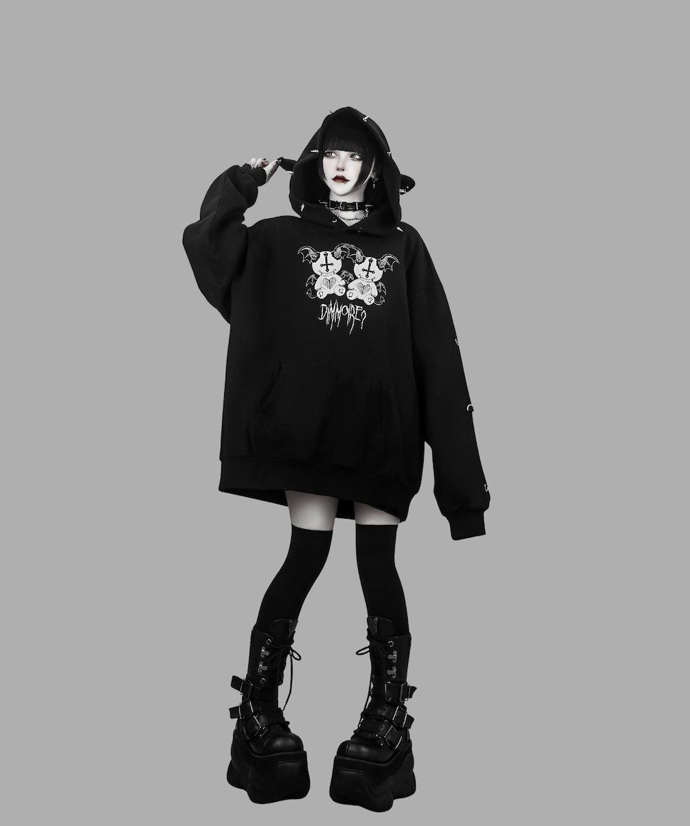 D. 日系原宿风 恶魔小熊印花 铆钉装饰 哥特朋克风宽松连帽衫卫衣 [Original Page Link]