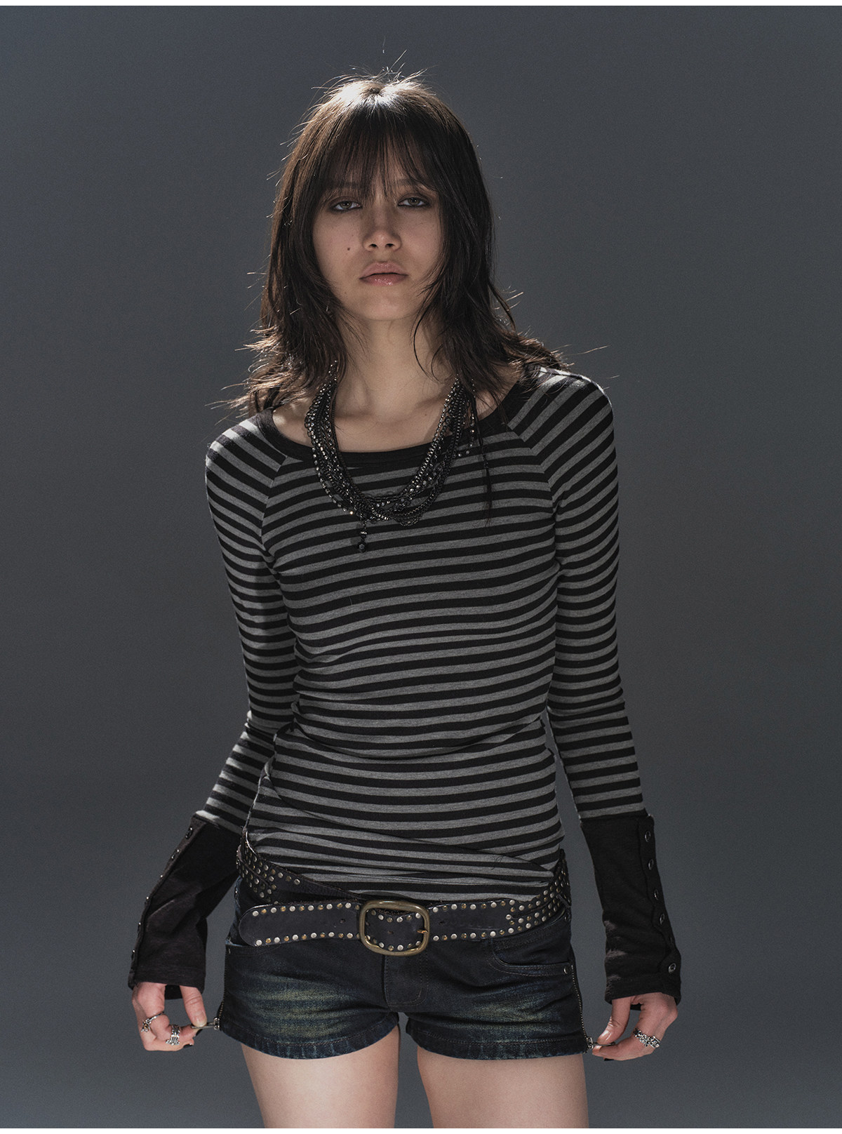 WearAndtear Black and Grey Striped Punk-Style Long-Sleeve T-Shirt with Button-Down Cuffs and Elastic Raglan Sleeves