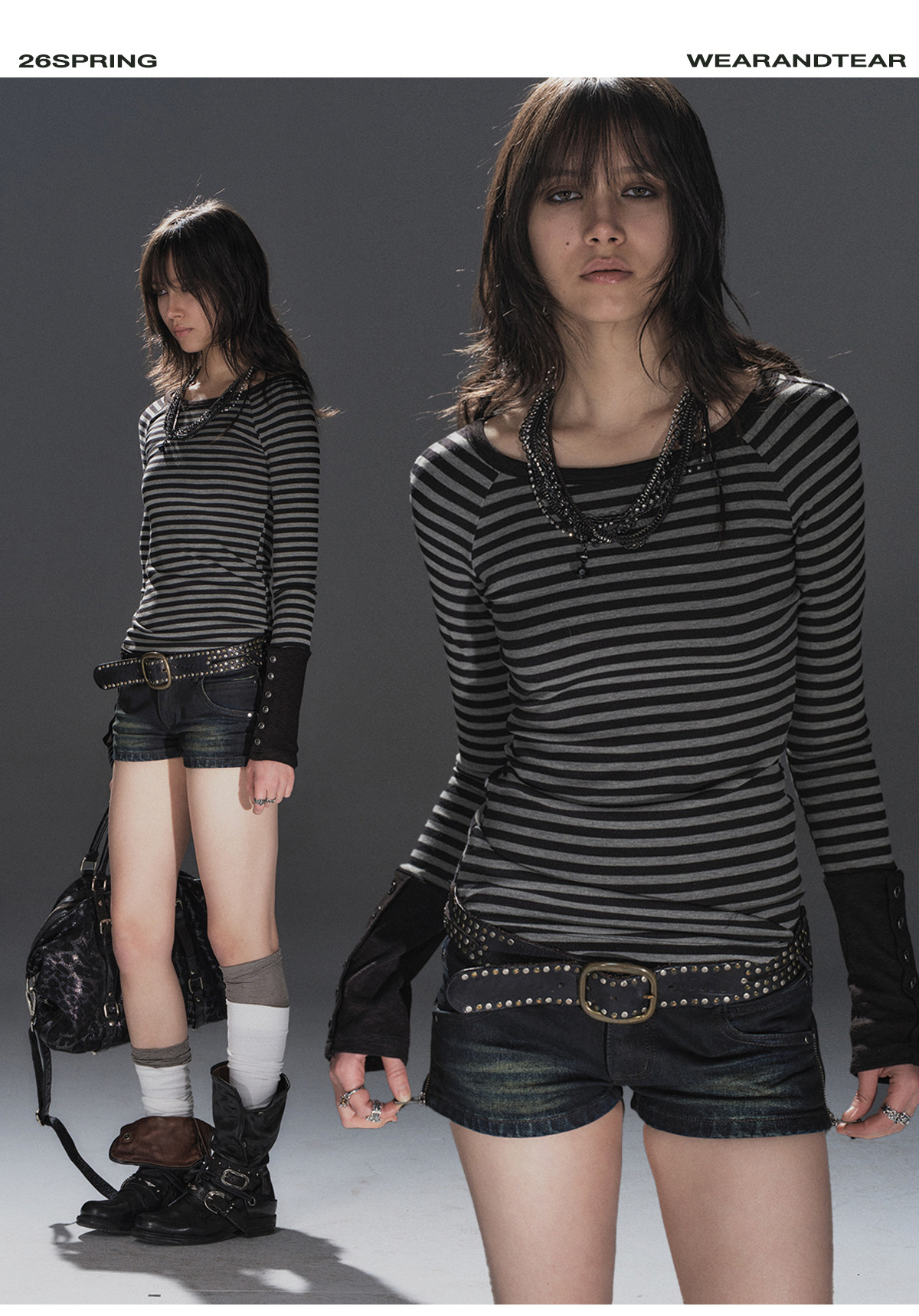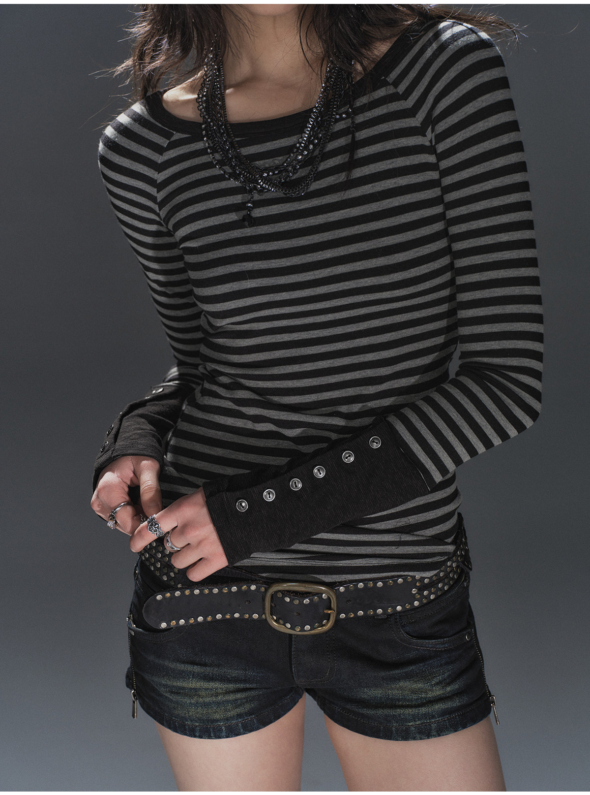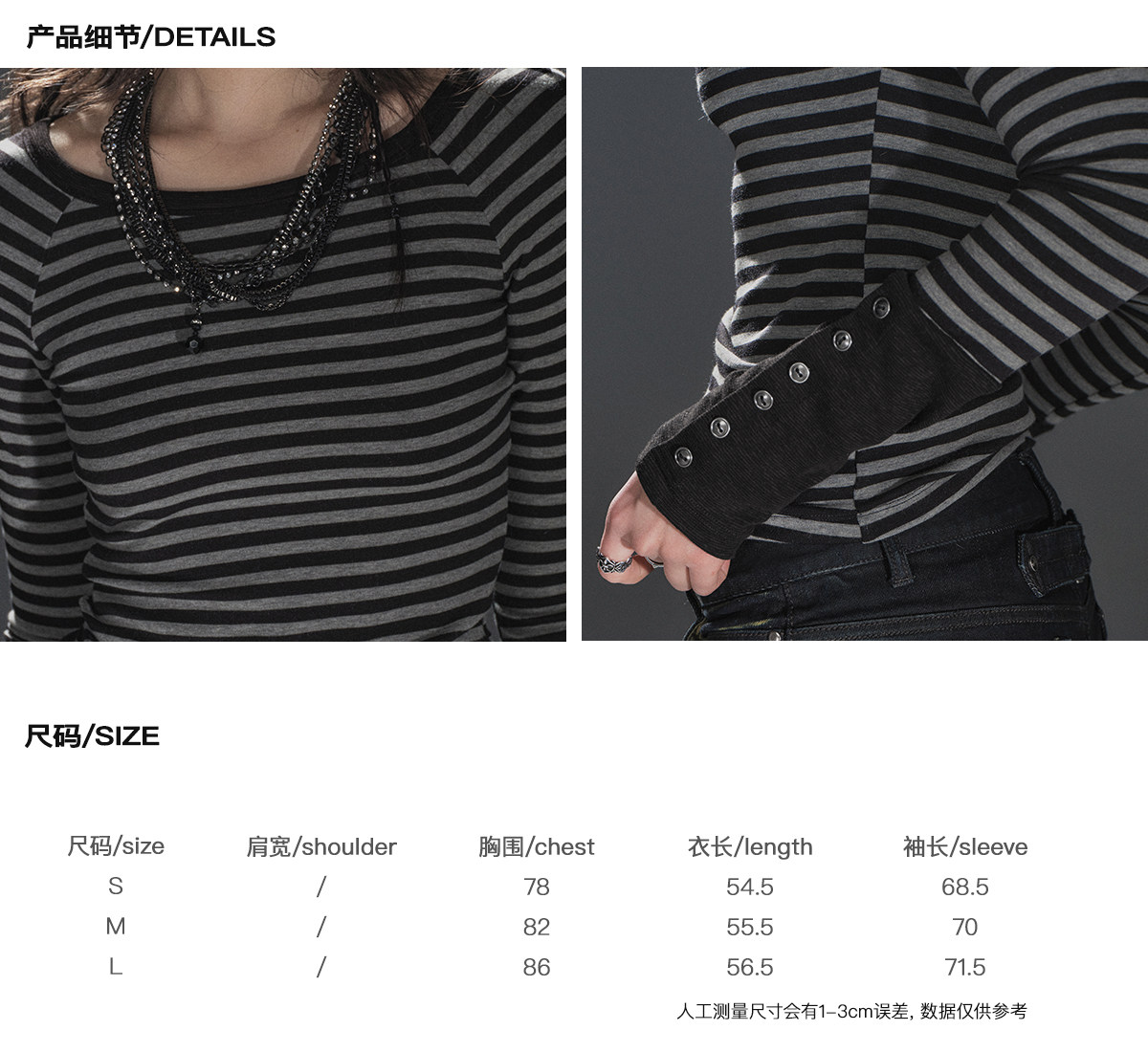 wearAndtear黑灰条纹拼接袖纽扣装饰修身朋克弹力插肩袖长袖T恤 [Original Page Link]