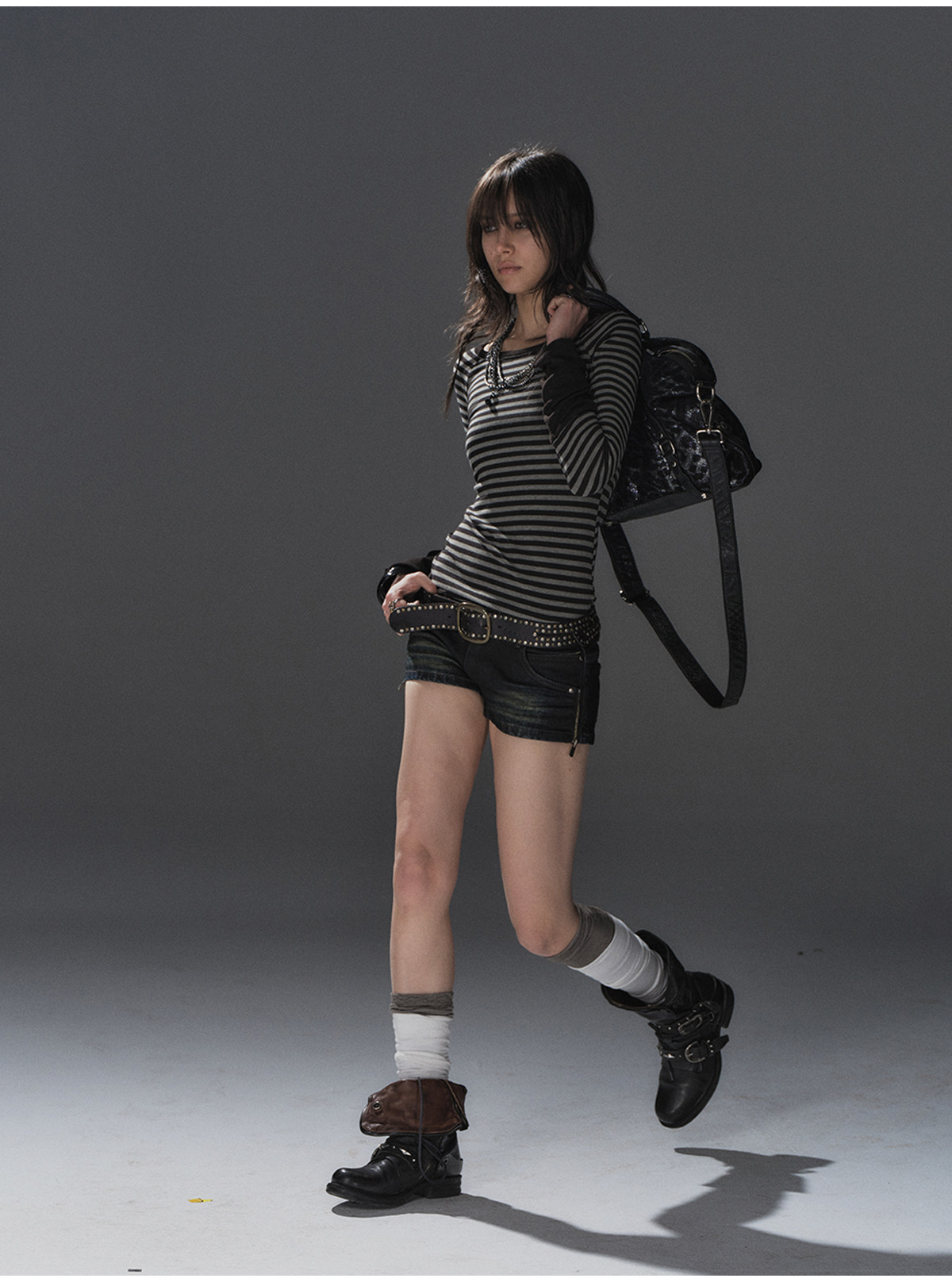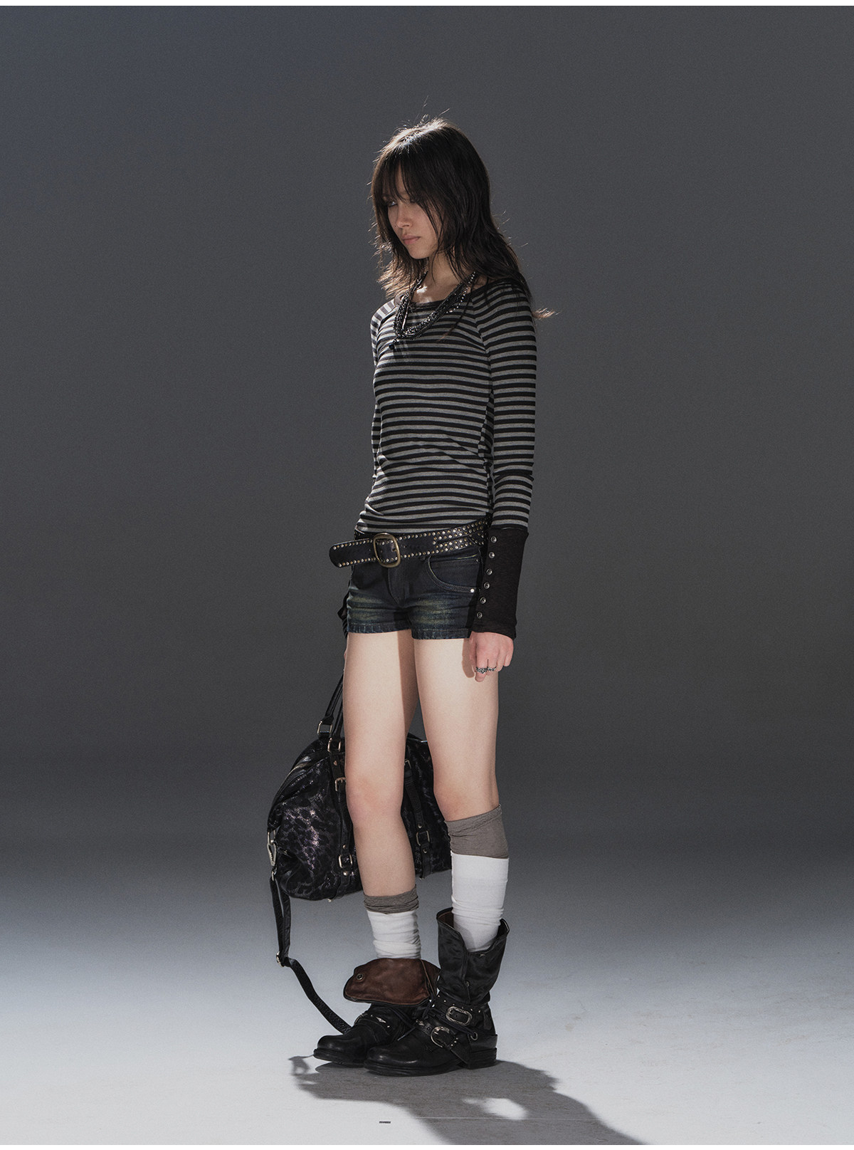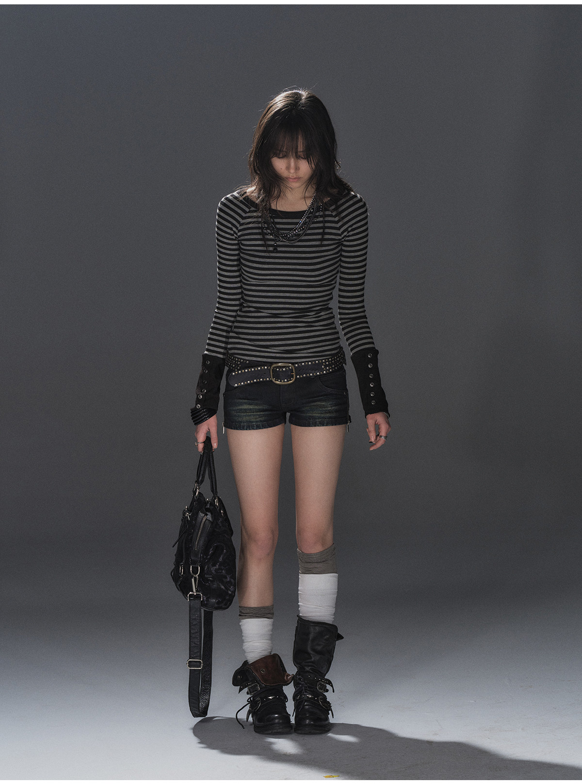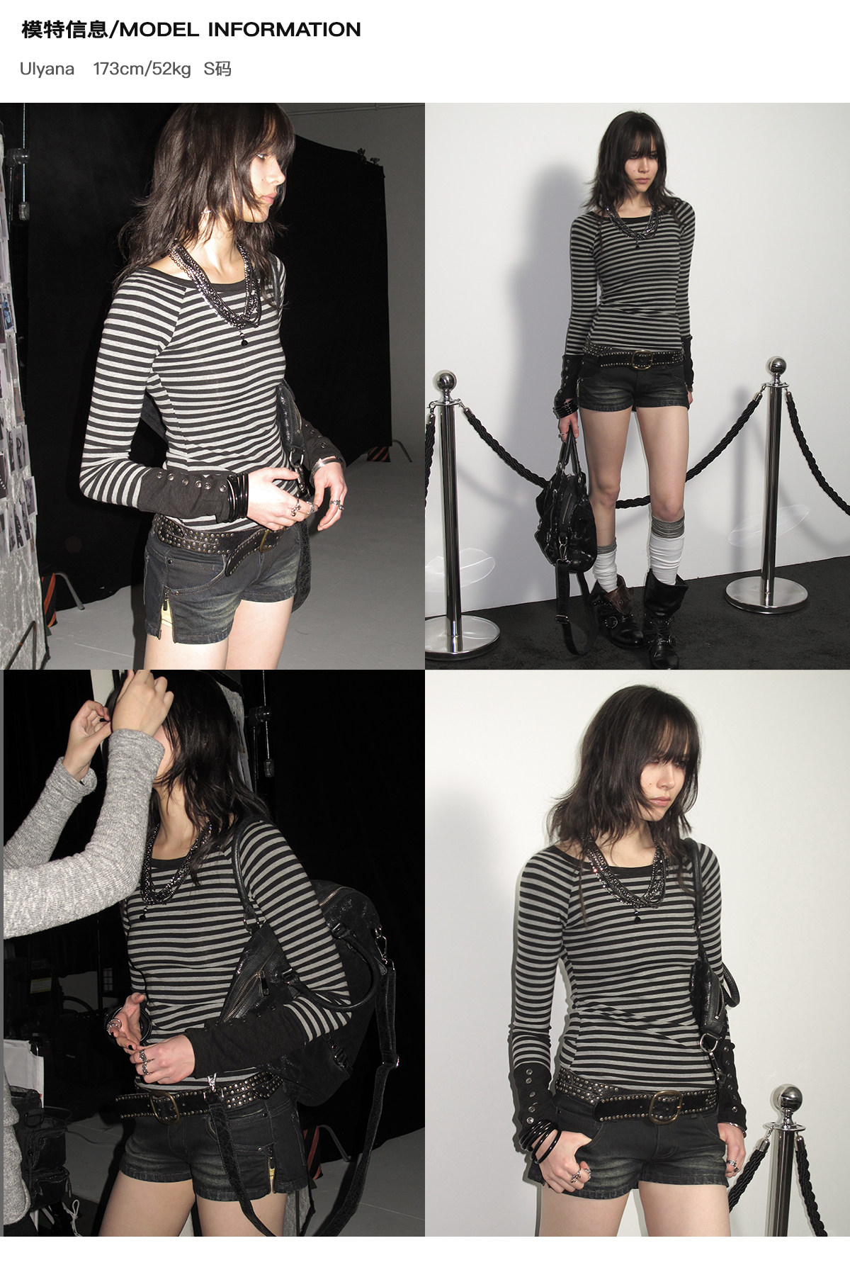 wearAndtear黑灰条纹拼接袖纽扣装饰修身朋克弹力插肩袖长袖T恤 [Original Page Link]