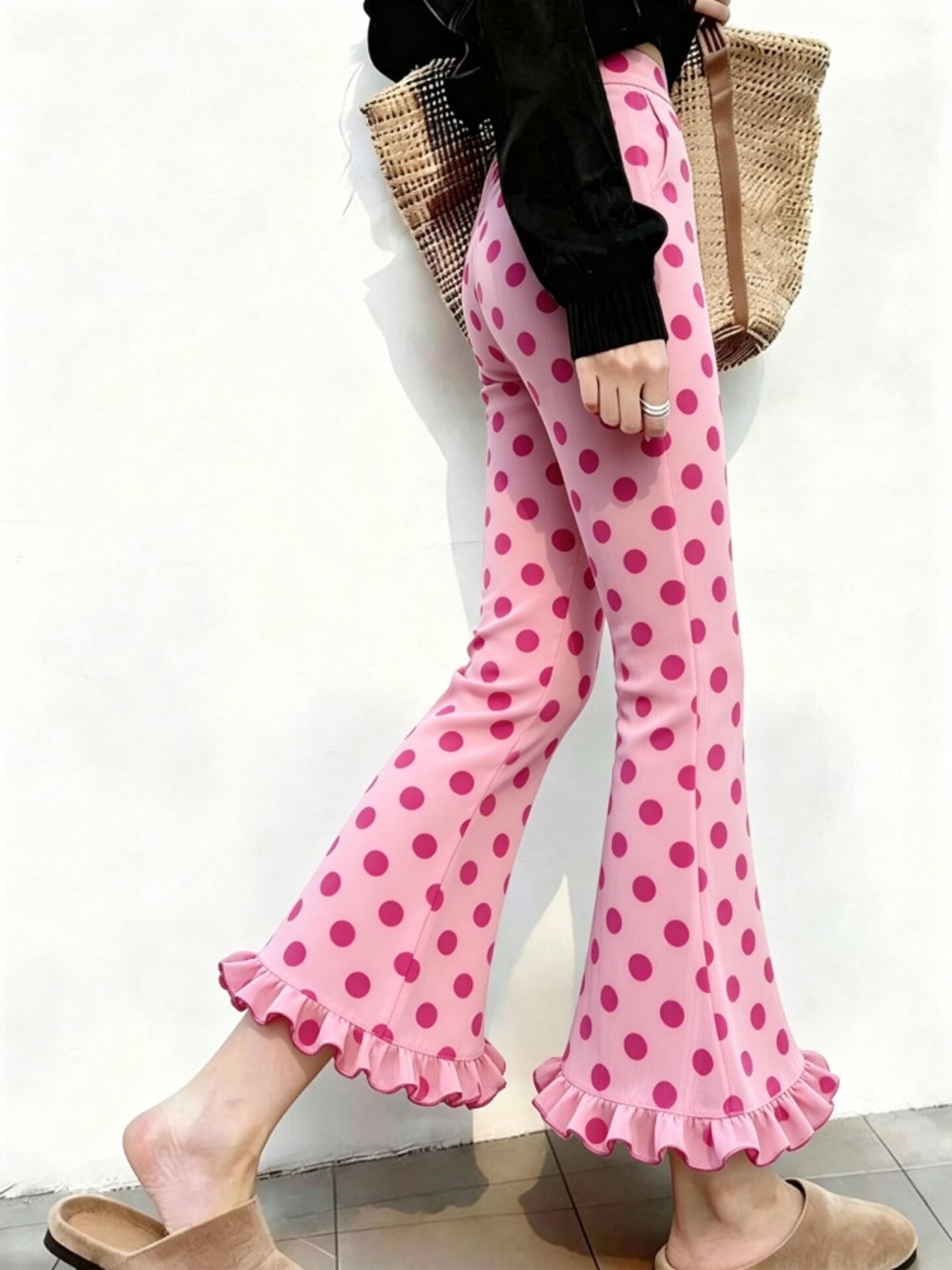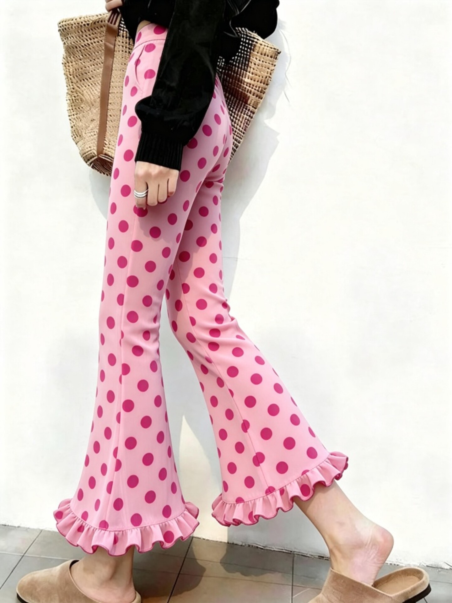 粉色波点木耳花边裤子2026新款今年流行爆款微喇裤高腰窄版九分裤 [Original Page Link]
