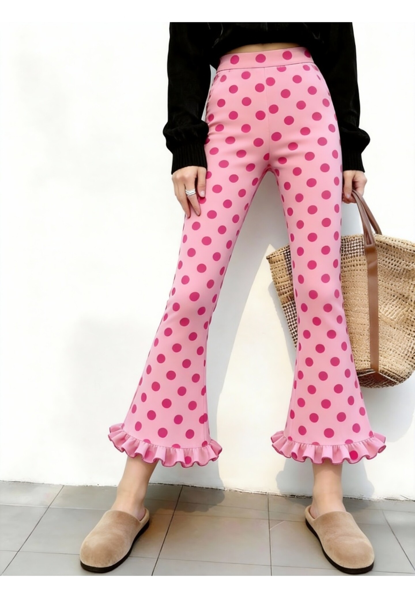 Pink polka dot ruffled trim pants, 2026 new style, trendy and popular this year, high-waisted slim-fit cropped pants.