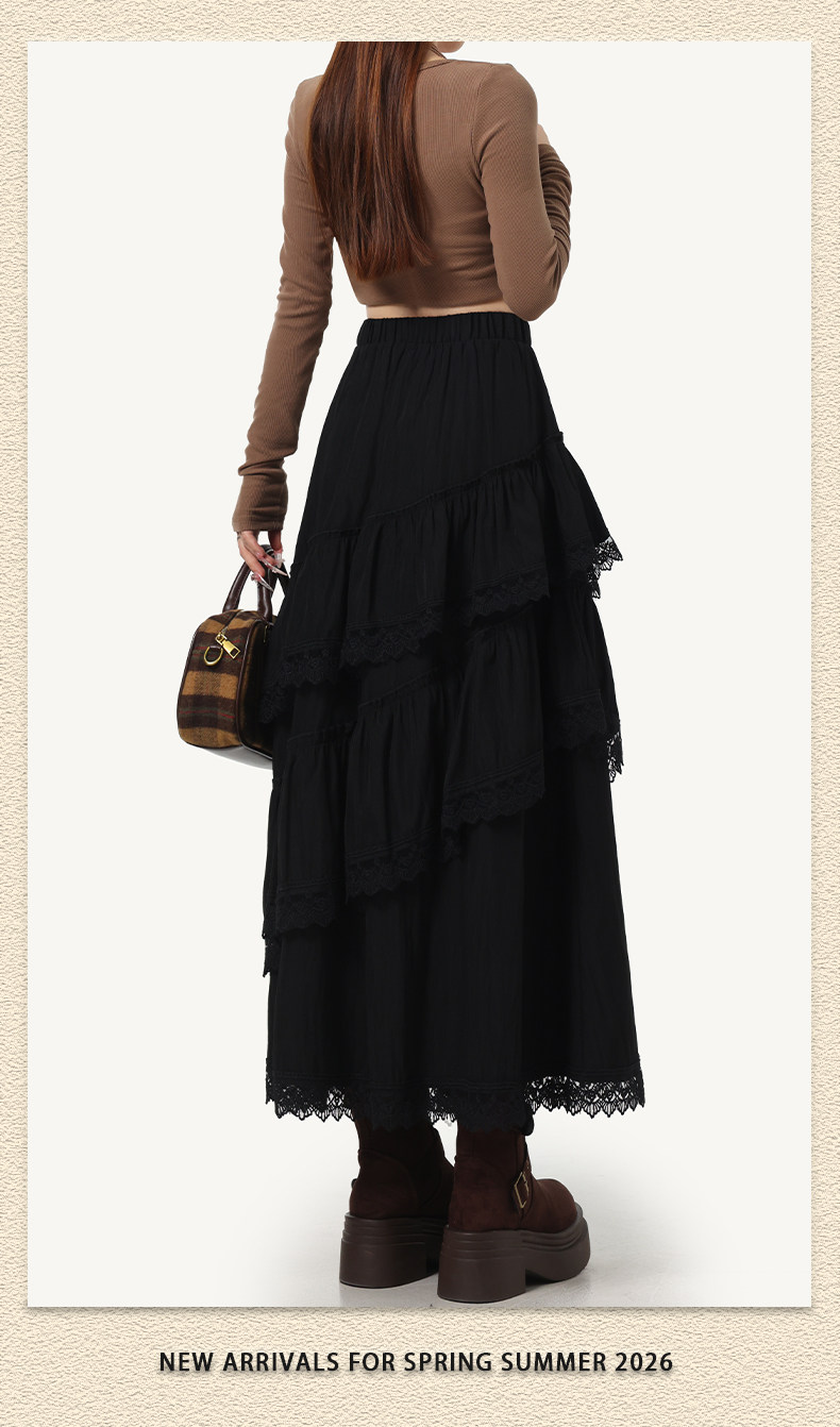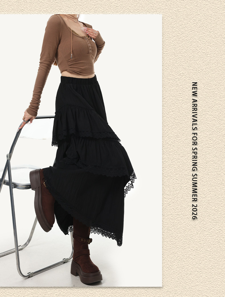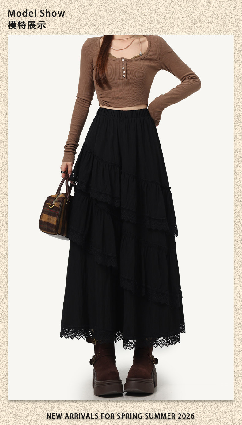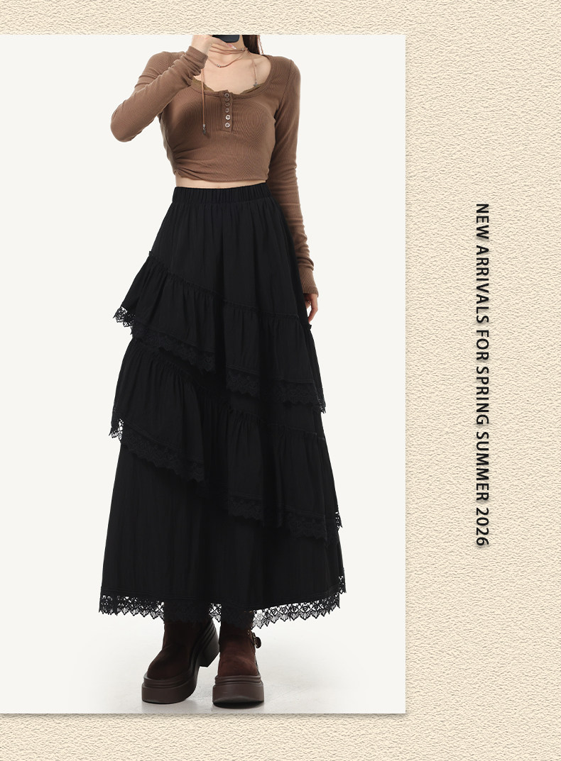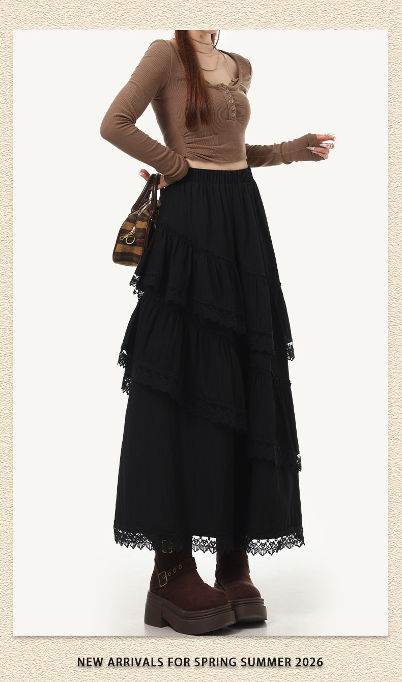 Dickies Black Lace Trim Cake Skirt for Women, 2026 New Summer High-Waisted A-Line Maxi Skirt