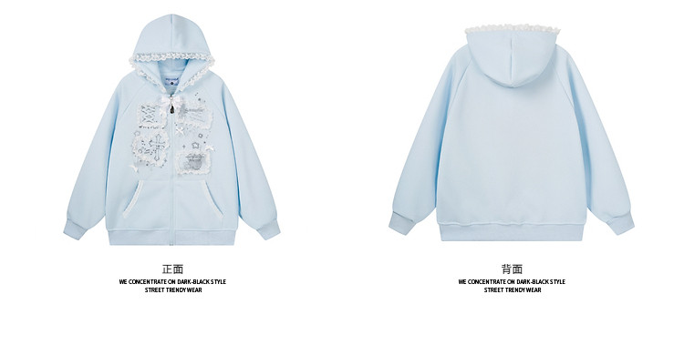 Light blue lace-trimmed hooded cardigan sweatshirt for women, 2026 new style, loose fit, slimming, youthful, versatile and super stylish outerwear.