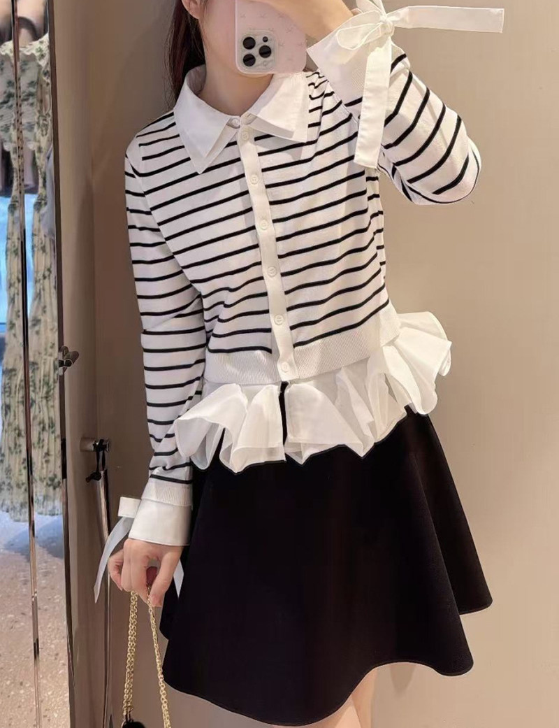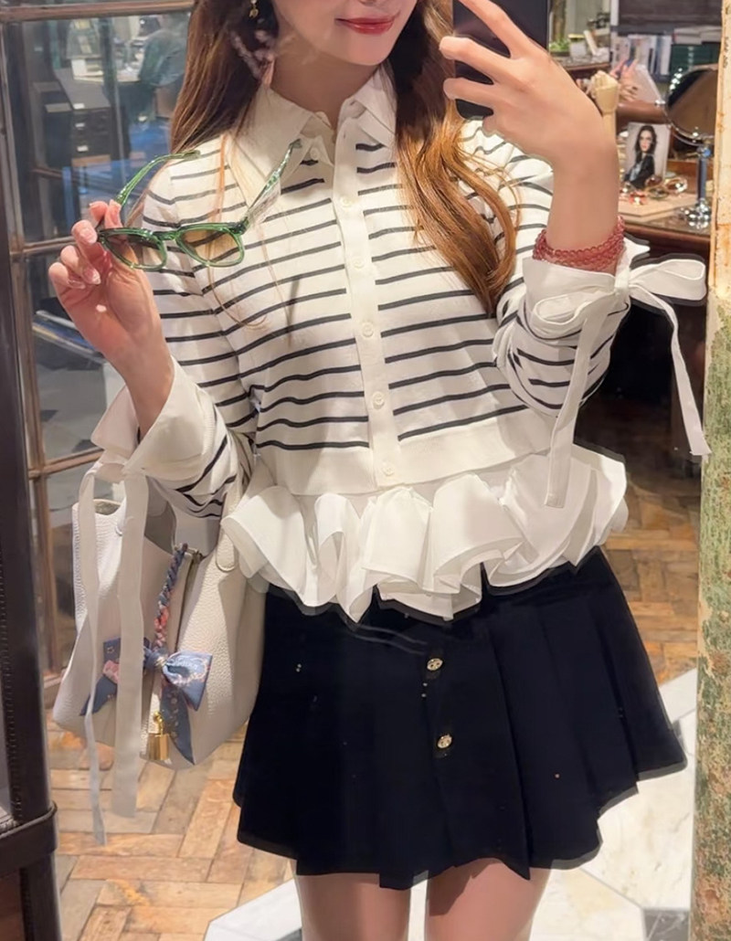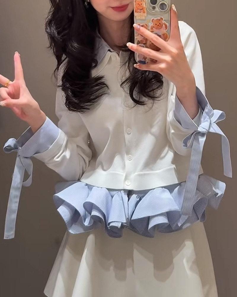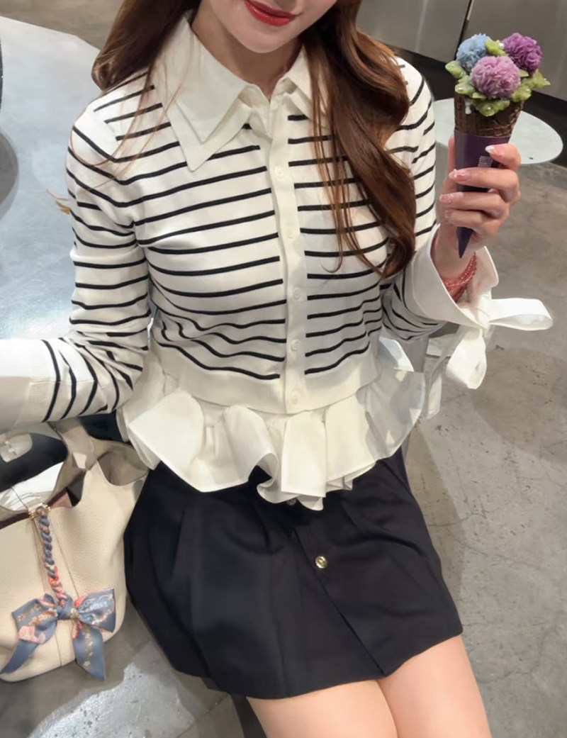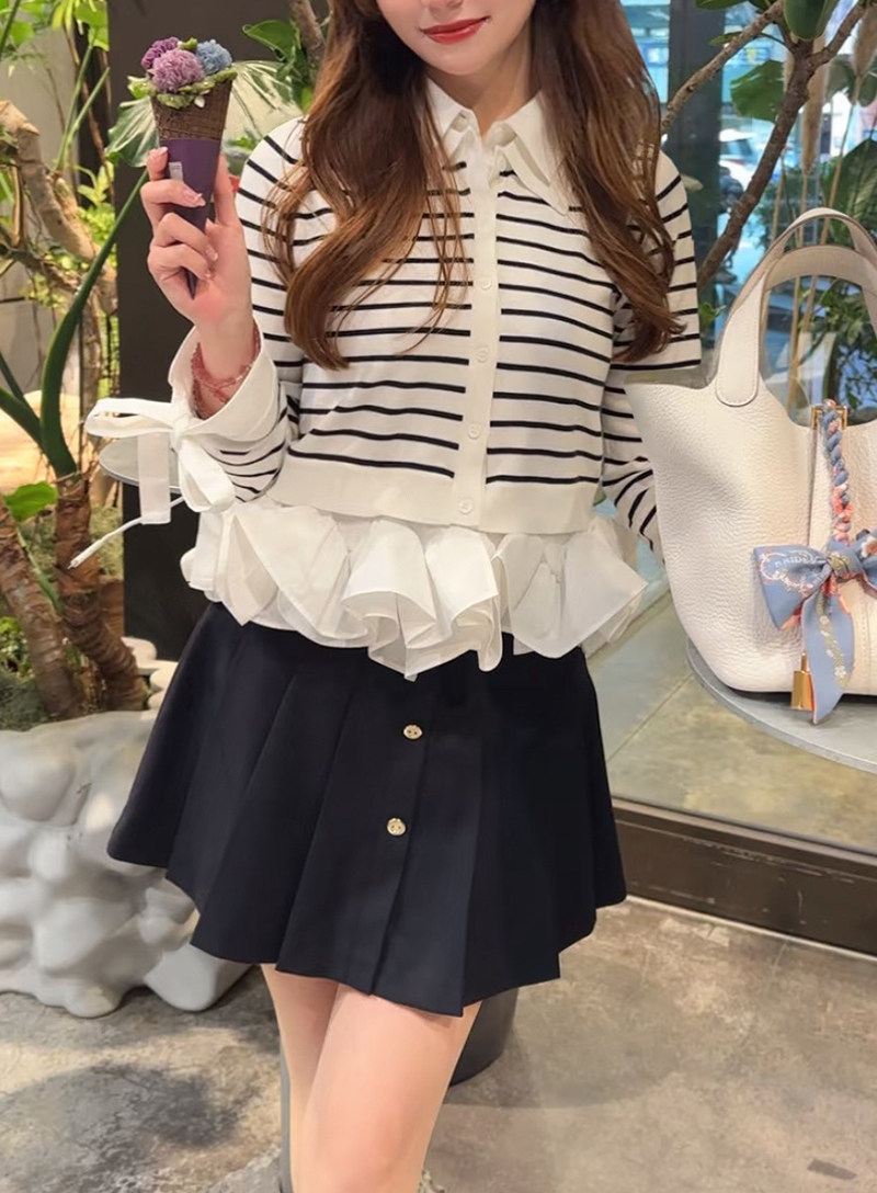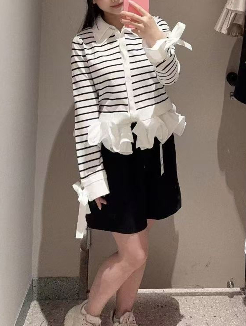 月牙美26春夏新品翻领拼色蝴蝶结荷叶边下摆针织衫A25243 [Original Page Link]