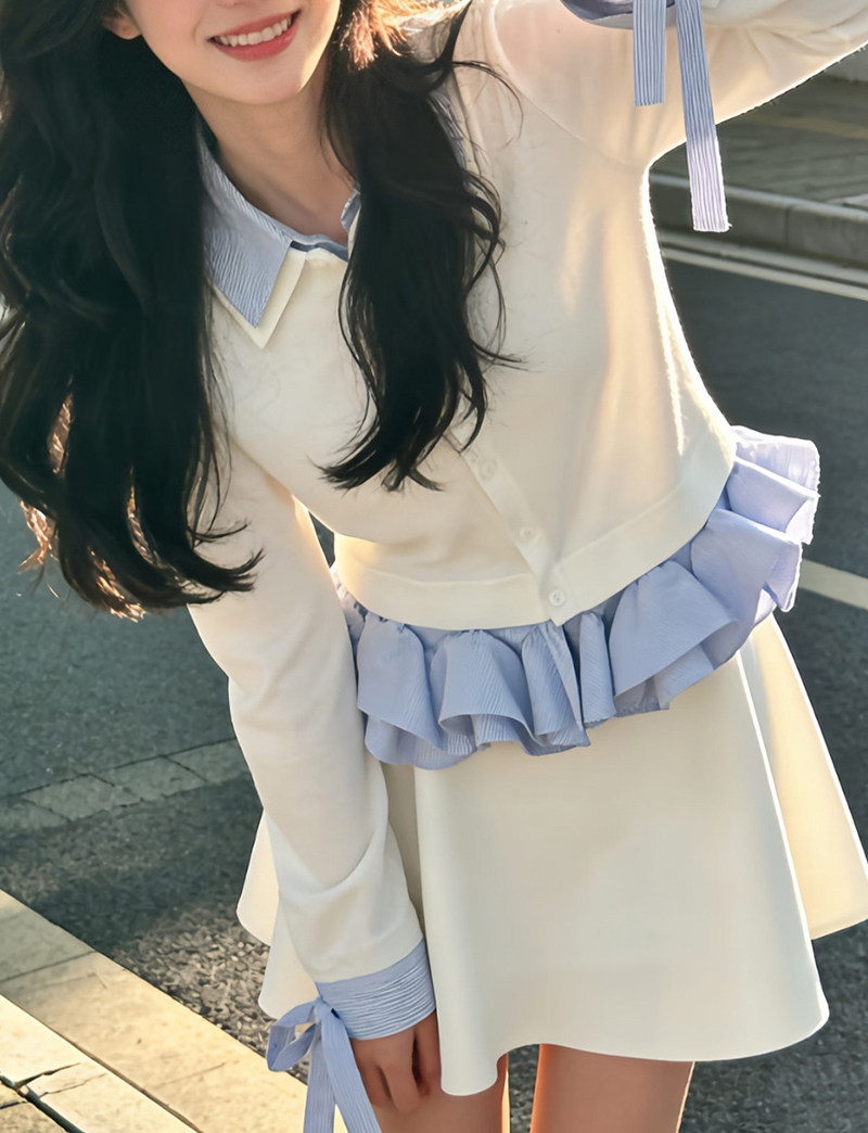 Crescent Moon Beauty Spring/Summer 2026 New Arrival: Collared Color-Blocked Bow Ruffled Hem Knit Sweater A25243