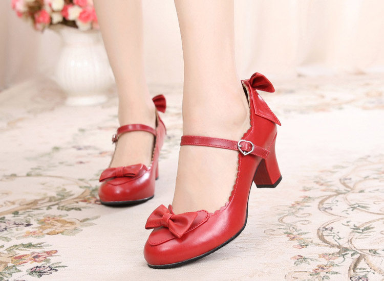 [Round Crimson Sound] Original daily round head cute heart bow high thick heel simple handmade small leather shoes Lolita