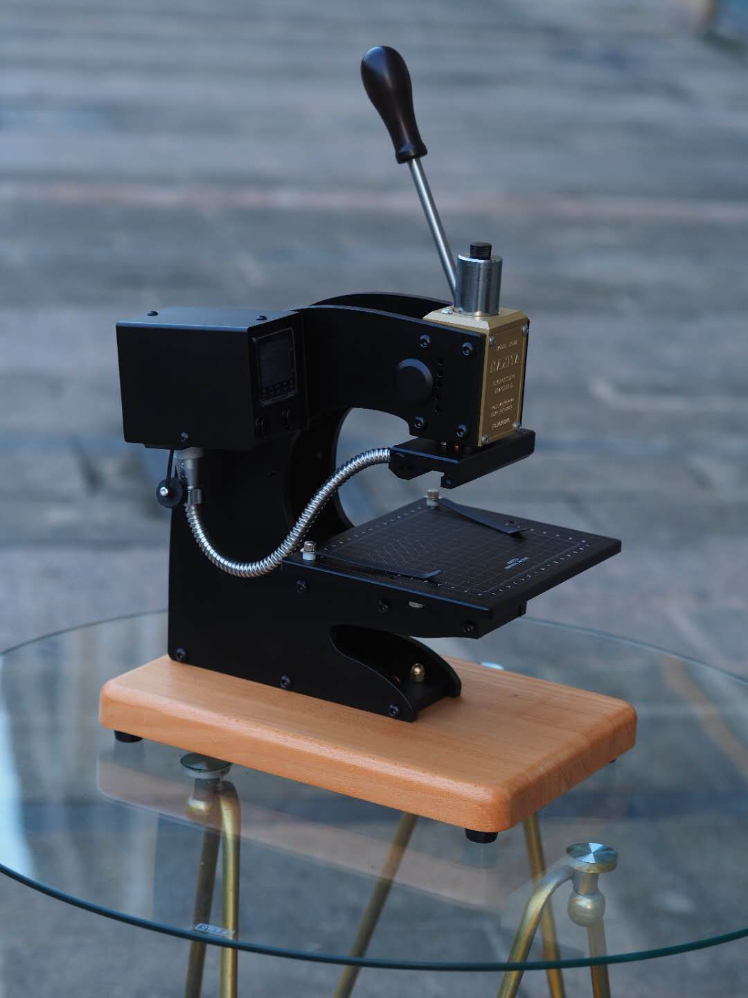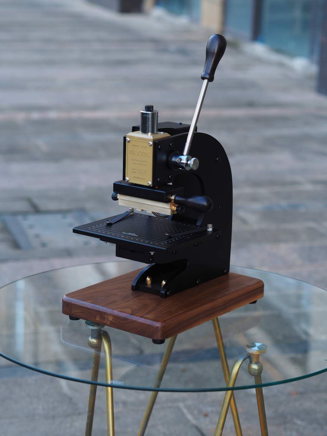 MAXITA fourth-generation hot stamping machine for handmade leather goods, copper mold embossing for business cards and leather embossing, EC-27 with black walnut base.