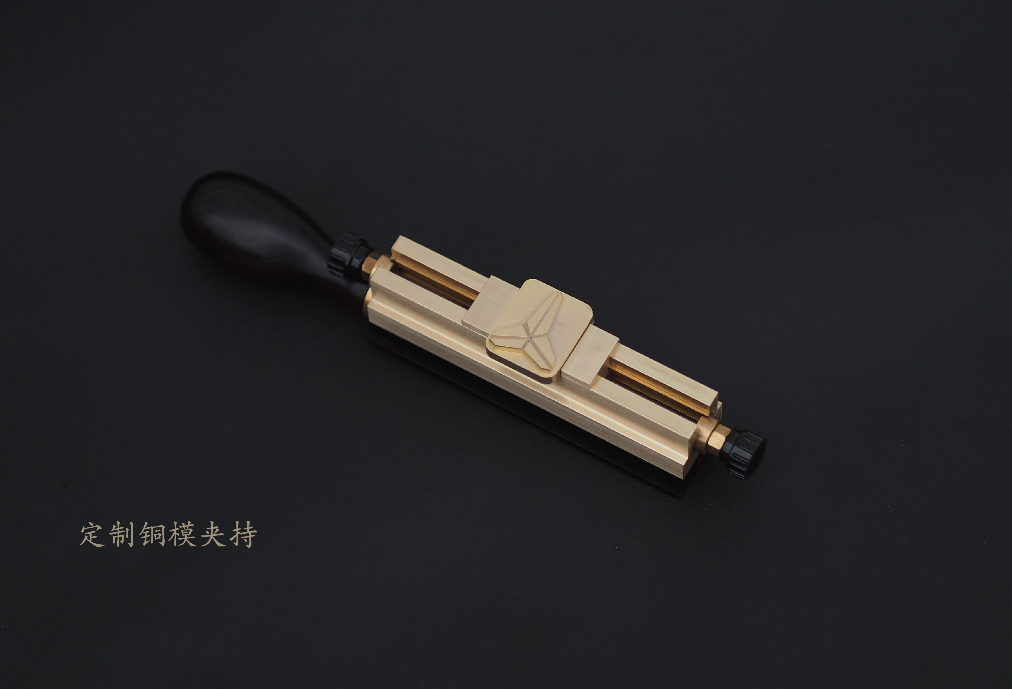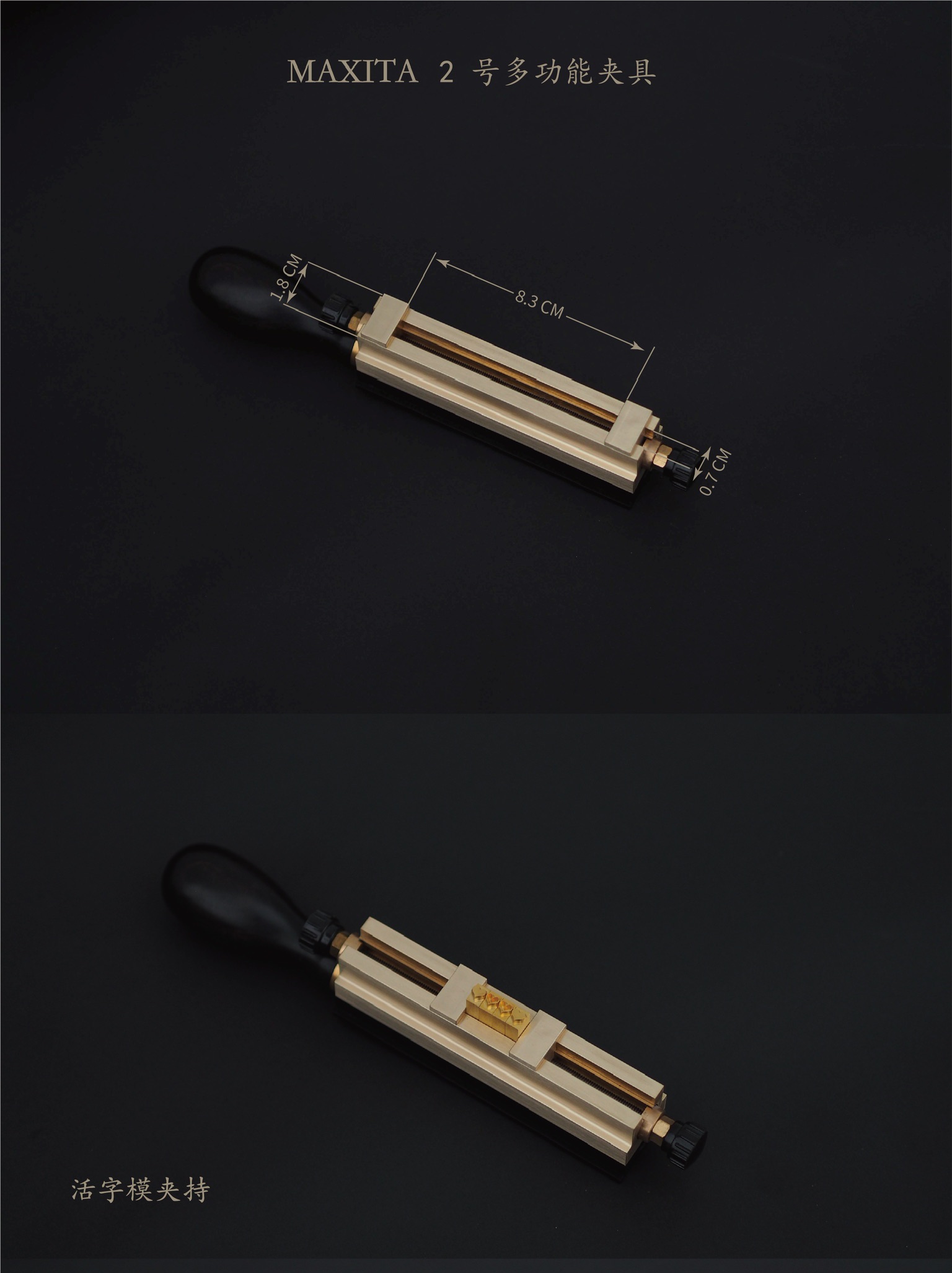 b.二号铜模夹具:用于使用单个雕刻铜模,另可装配MAXITA单排活字模,以及自动对中功能,(单个定制铜模可夹持最大至6*8厘米),超大尺寸铜模使用方法详询客服