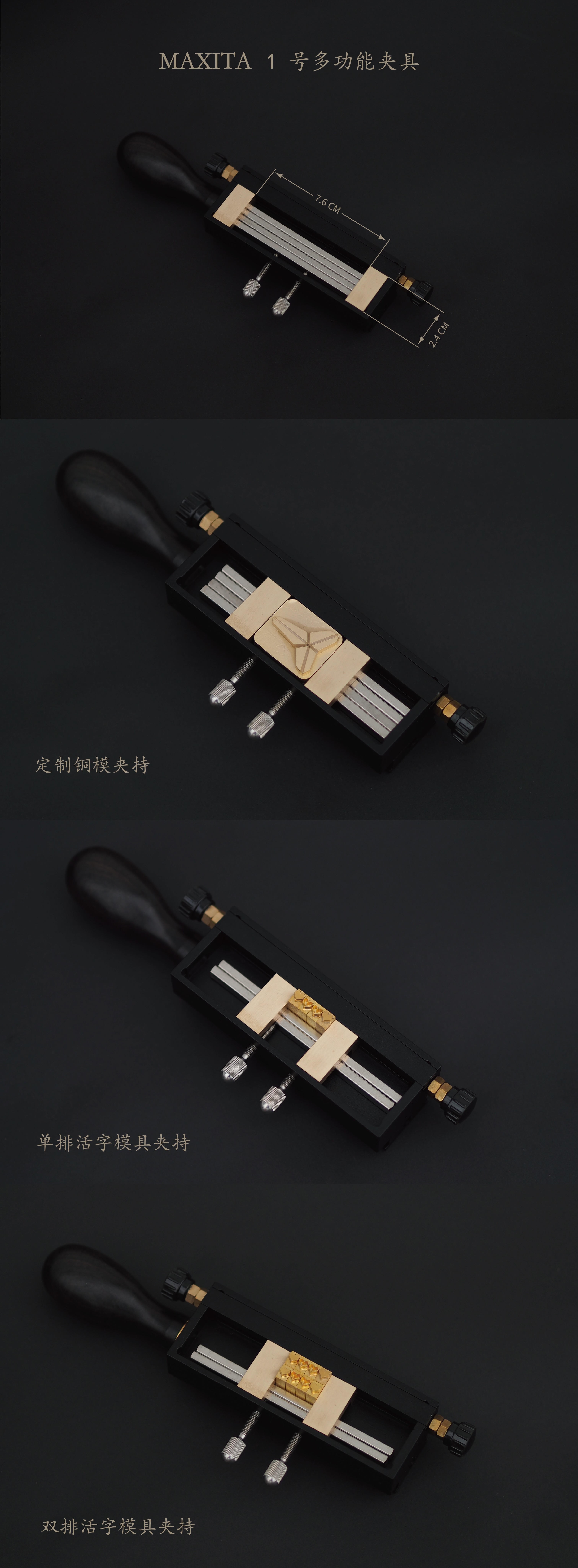 a.一号活字模夹具:可使用国内外多个品牌活字模,另可装配MAXITA单排、双排活字模,及自动对中功能,(单个定制铜模可夹持最大至2.4*7.7厘米),其他品牌字模可兼容尺寸详询客服