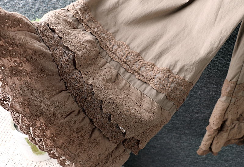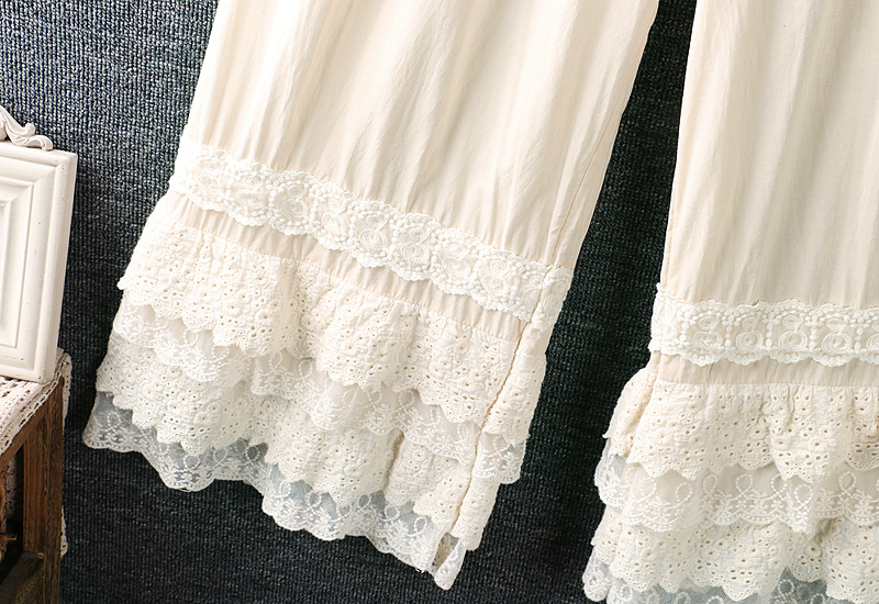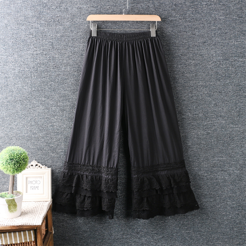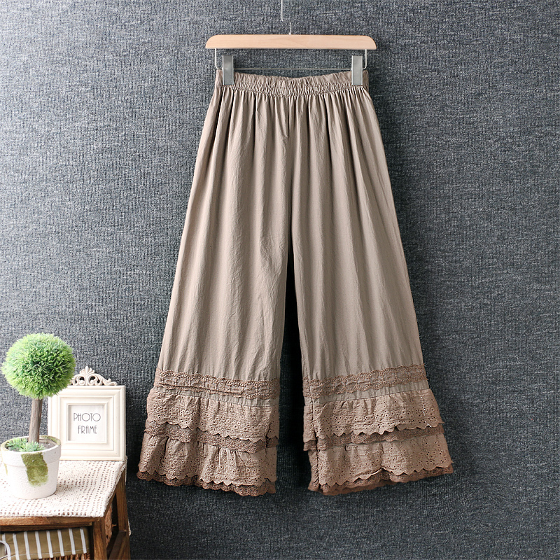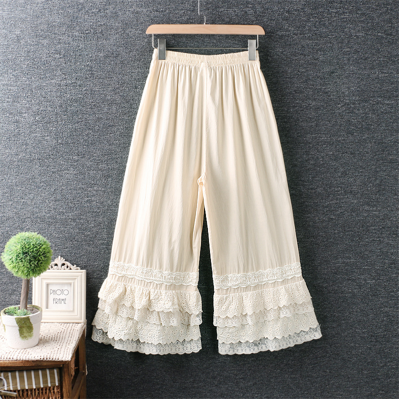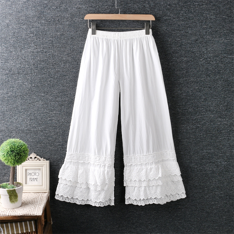Spring New Women's Artistic Fresh Elastic Waist Solid Color Cotton Linen Cropped Pants Lace Wide Leg Pants Underpants