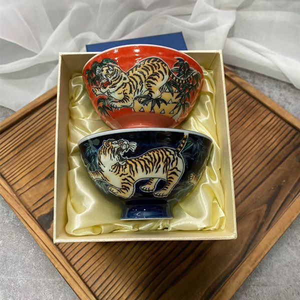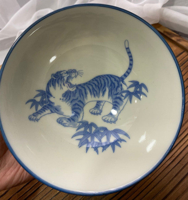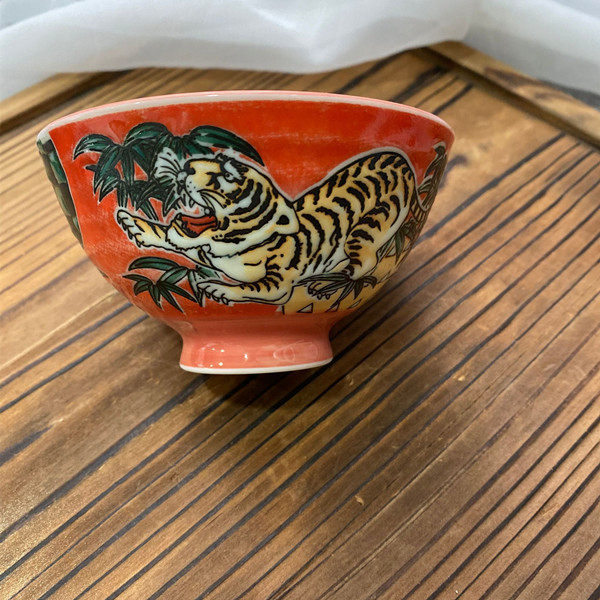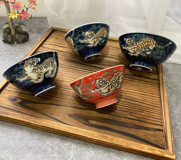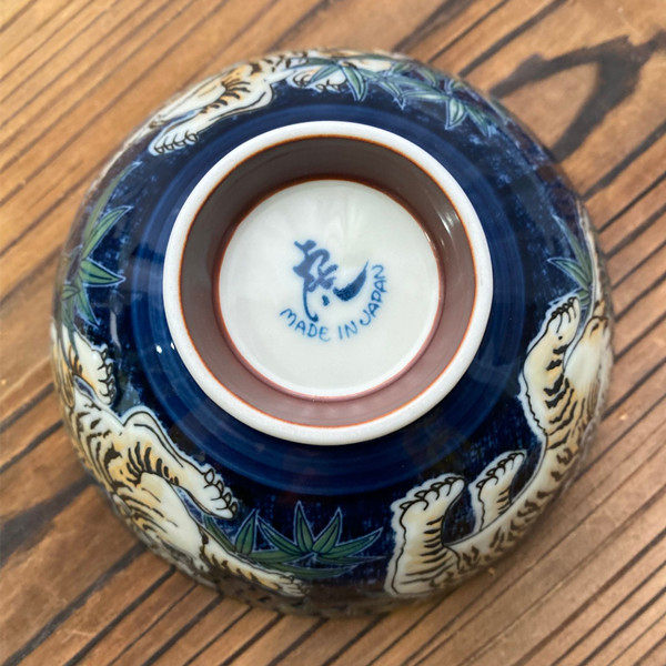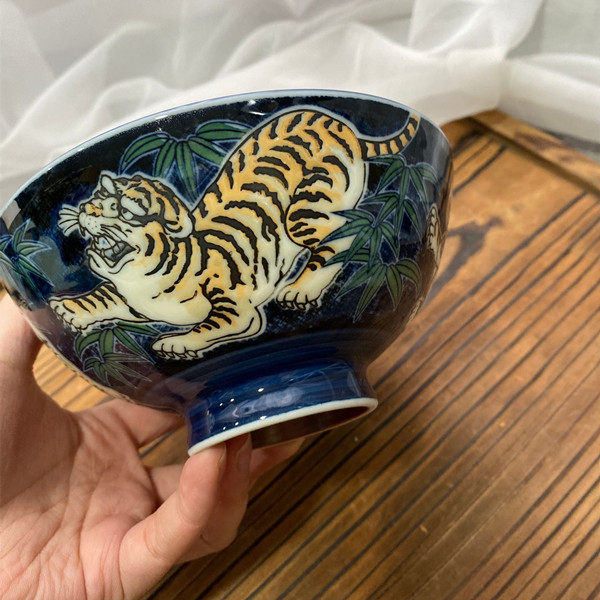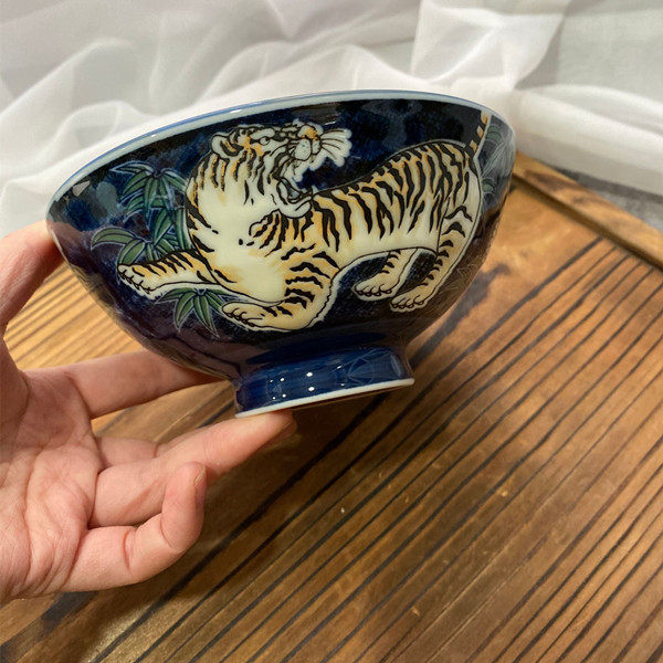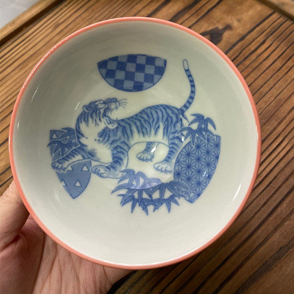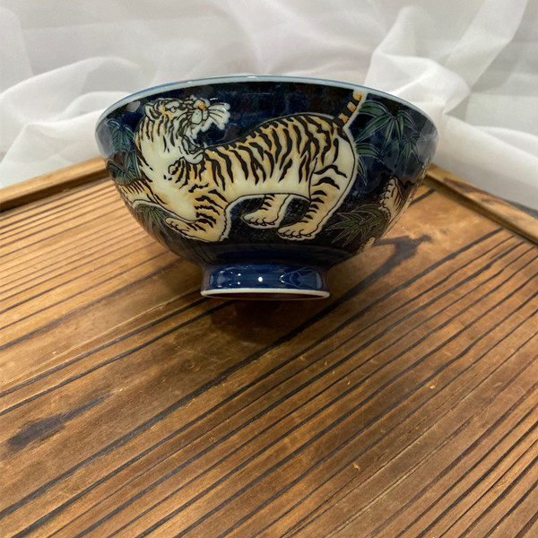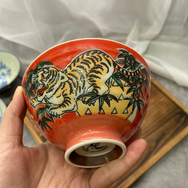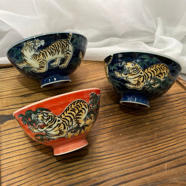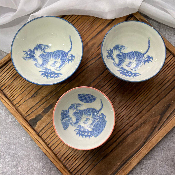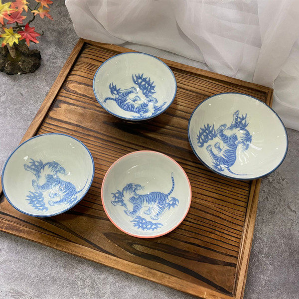 Ceramic tableware: Japanese imported Mino ware underglaze tiger-pattern rice bowl and small soup bowl