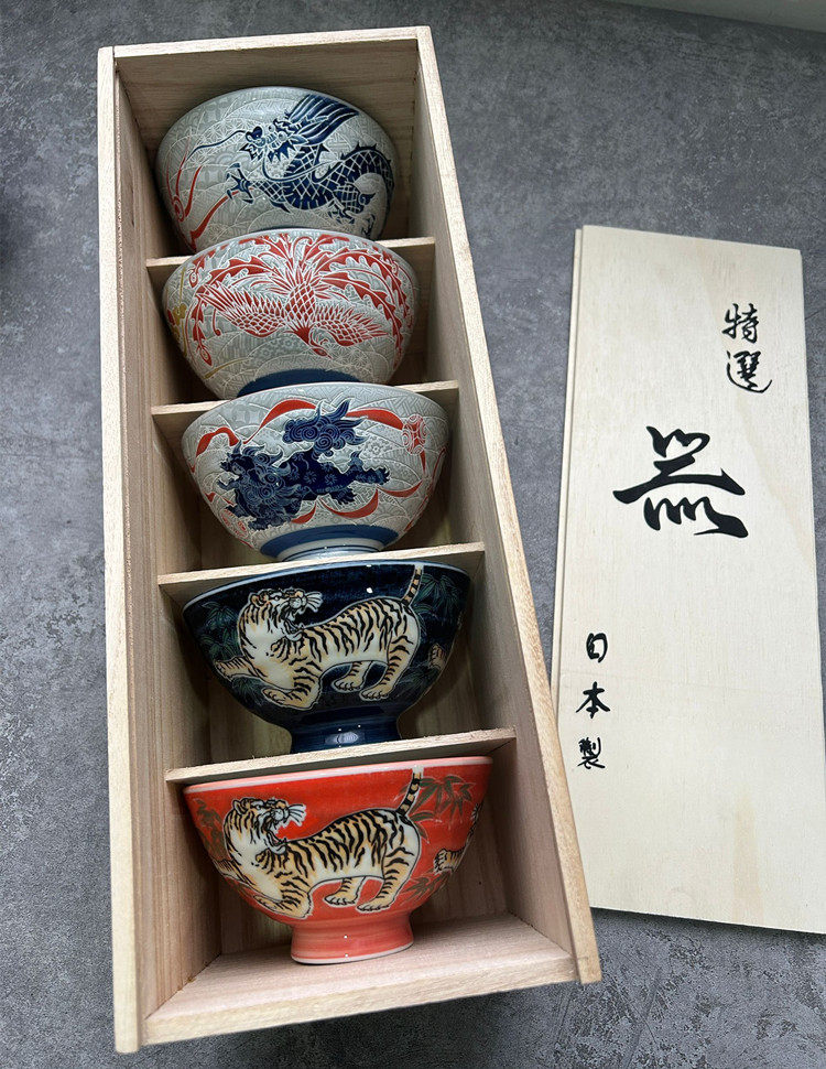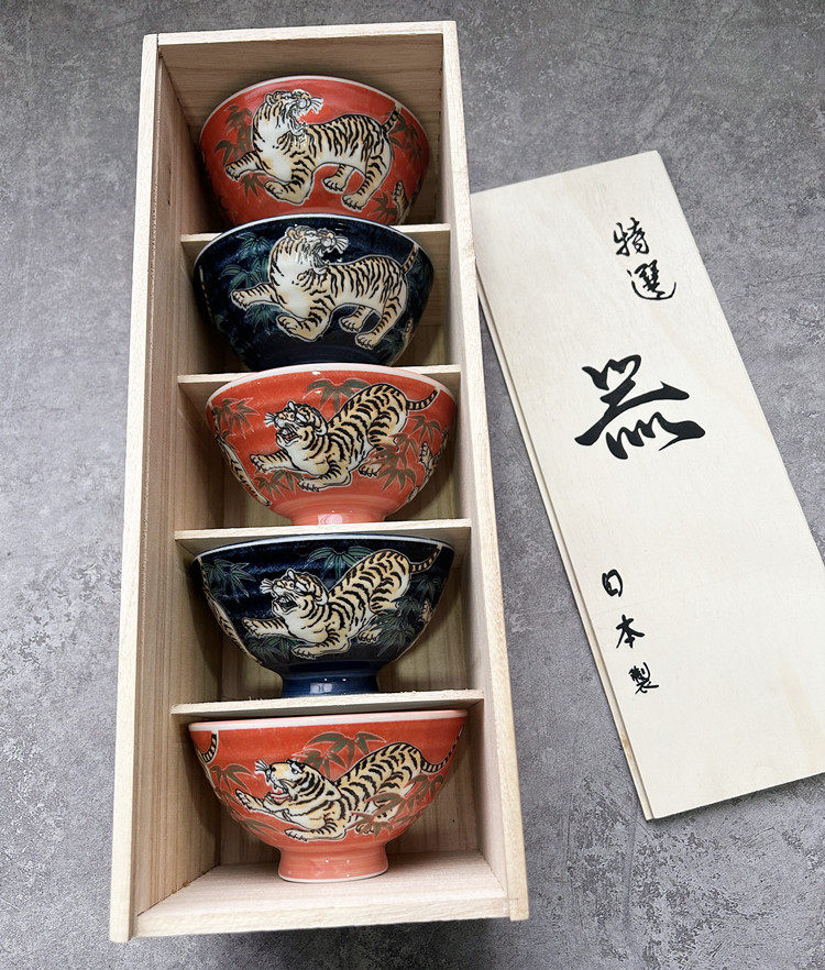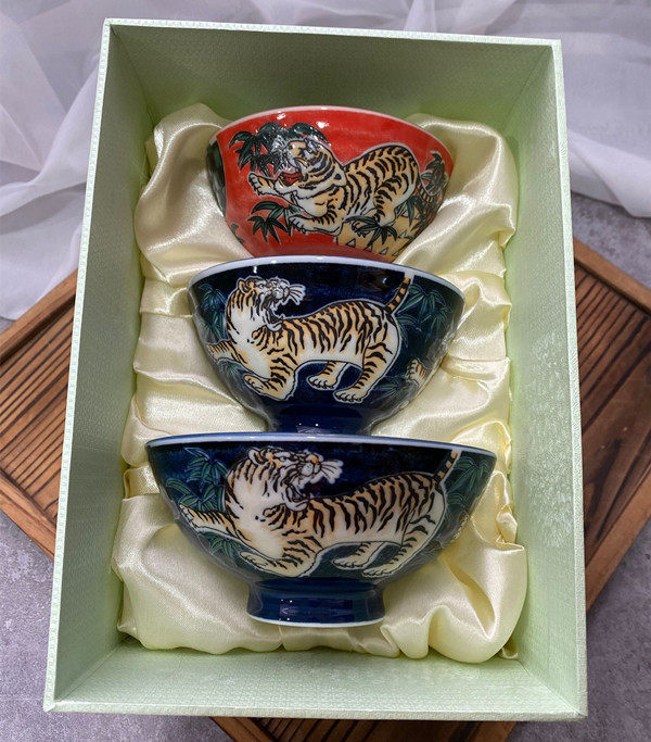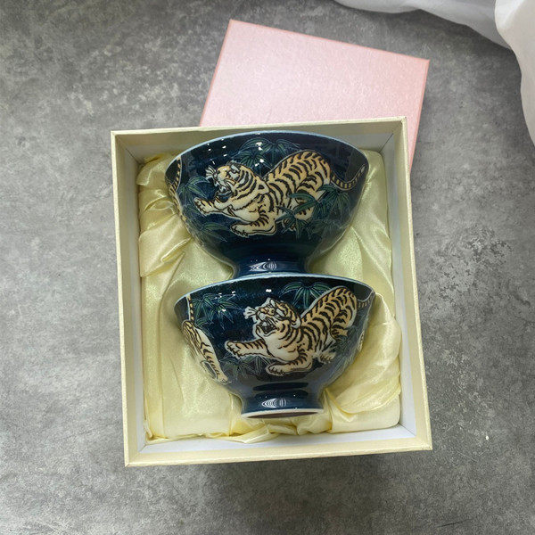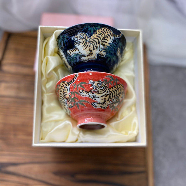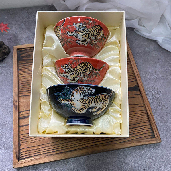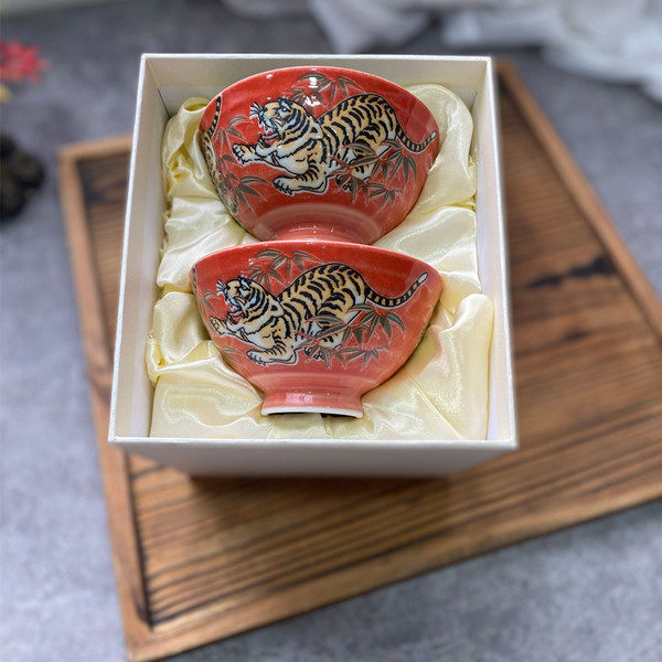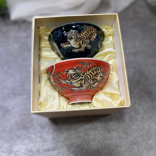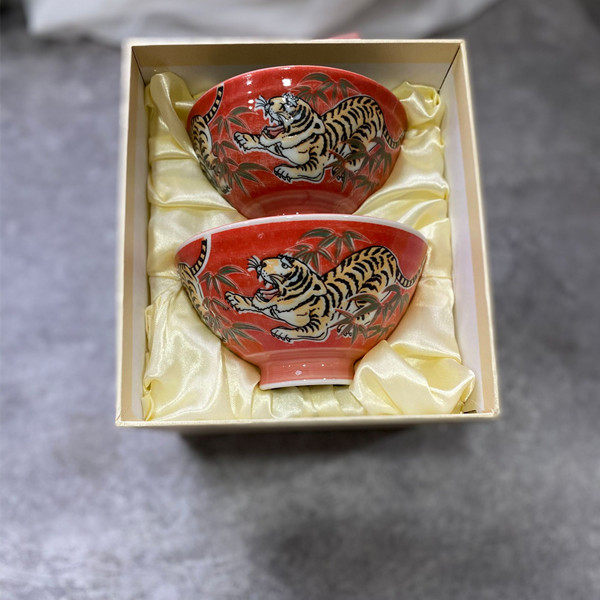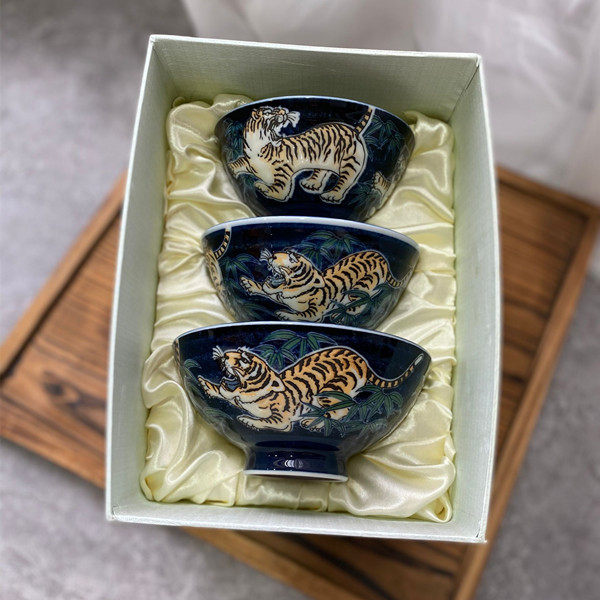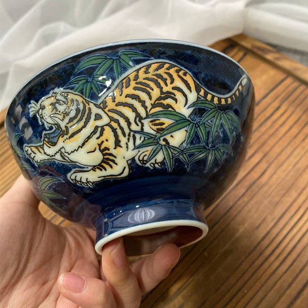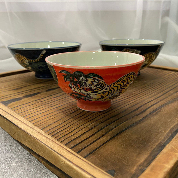 Ceramic tableware: Japanese imported Mino ware underglaze tiger-pattern rice bowl and small soup bowl