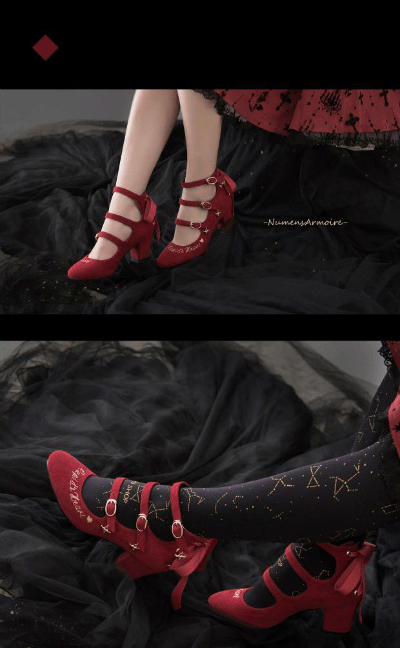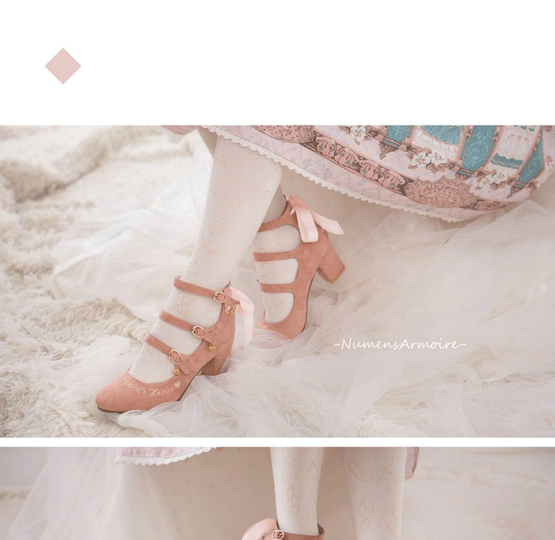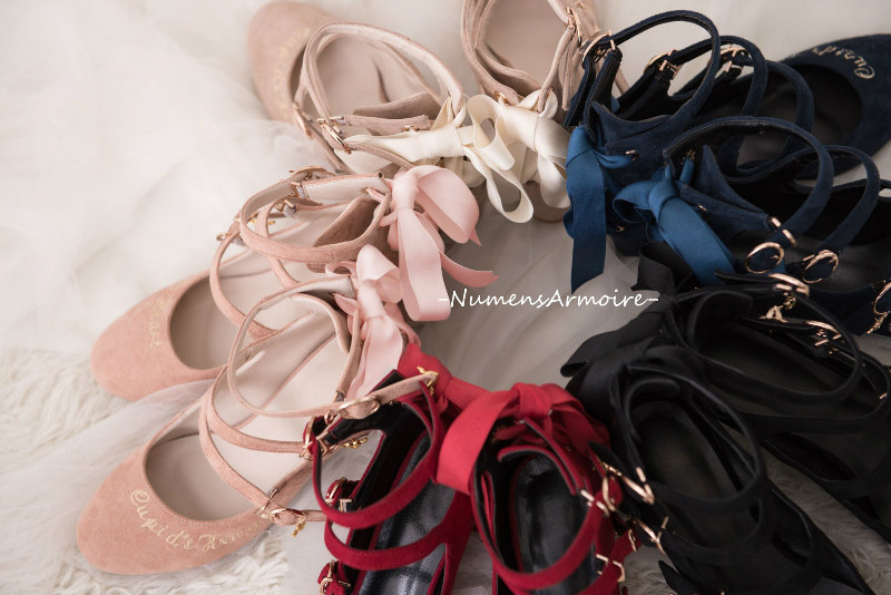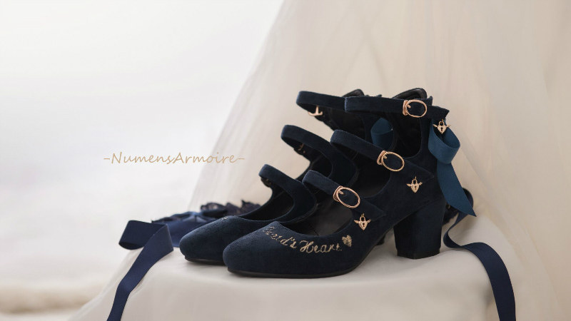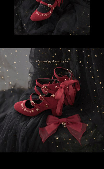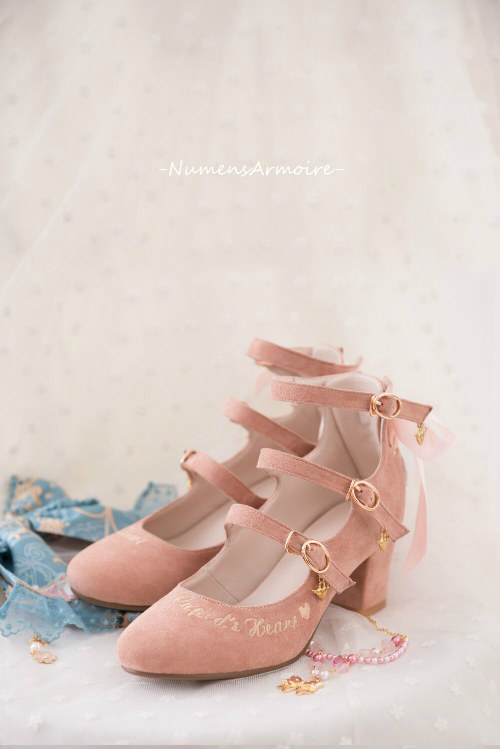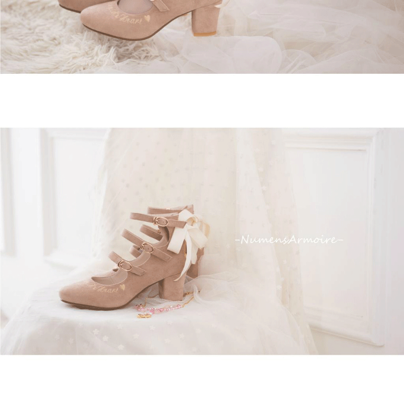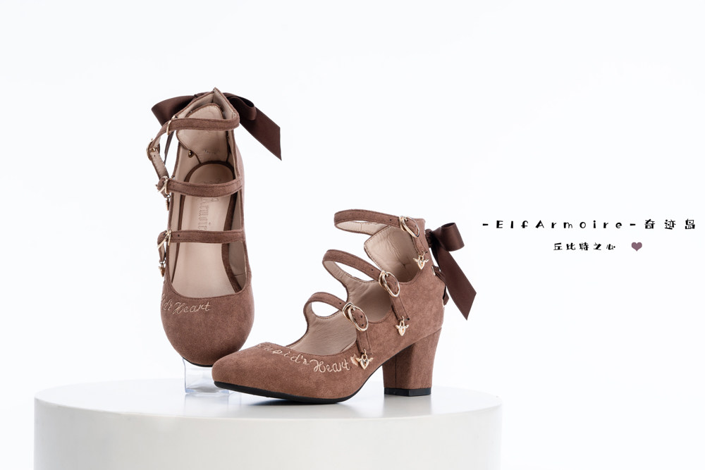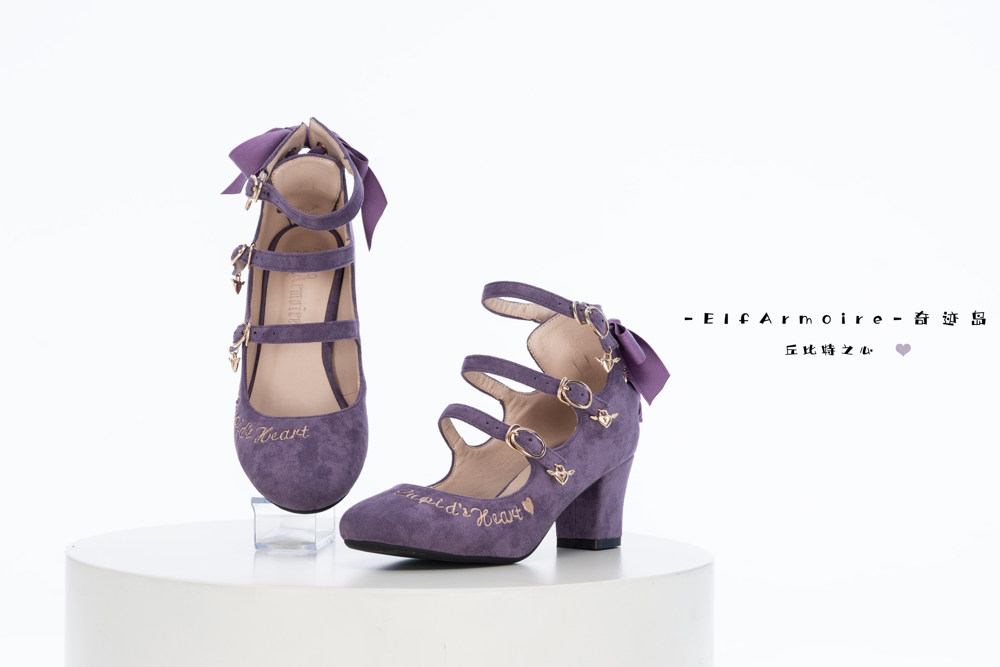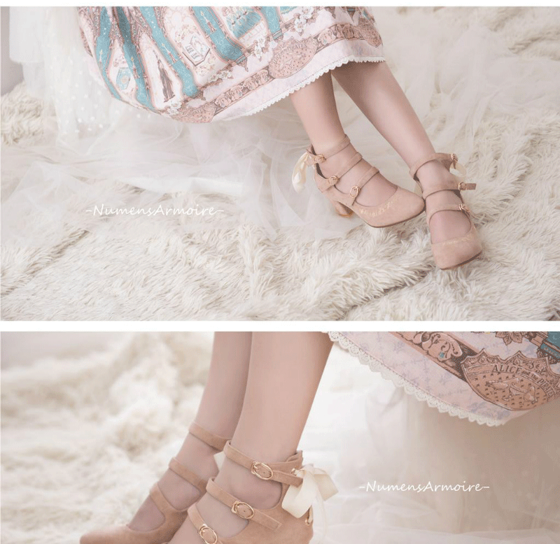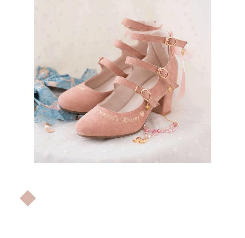 Miracle Island* in stock. Suede Cupid's Heart Lolita Shoes, Mary Jane with Three Buckles, Elegant Style.