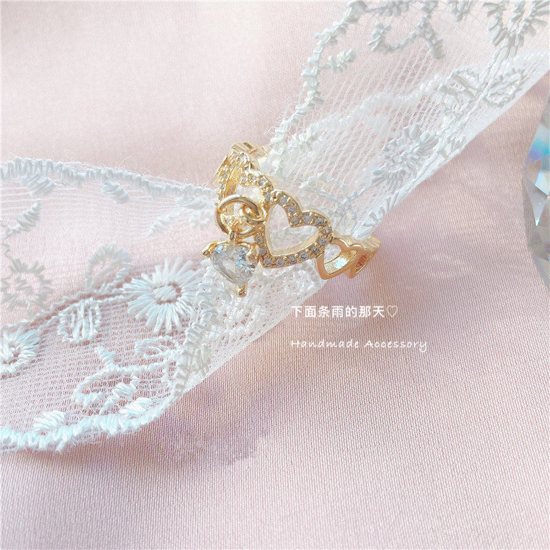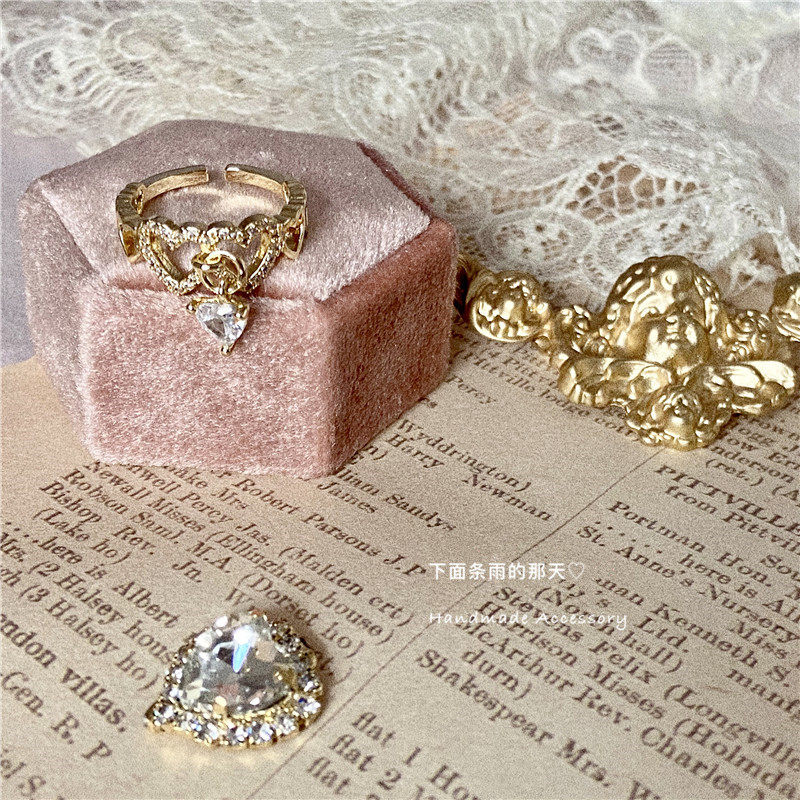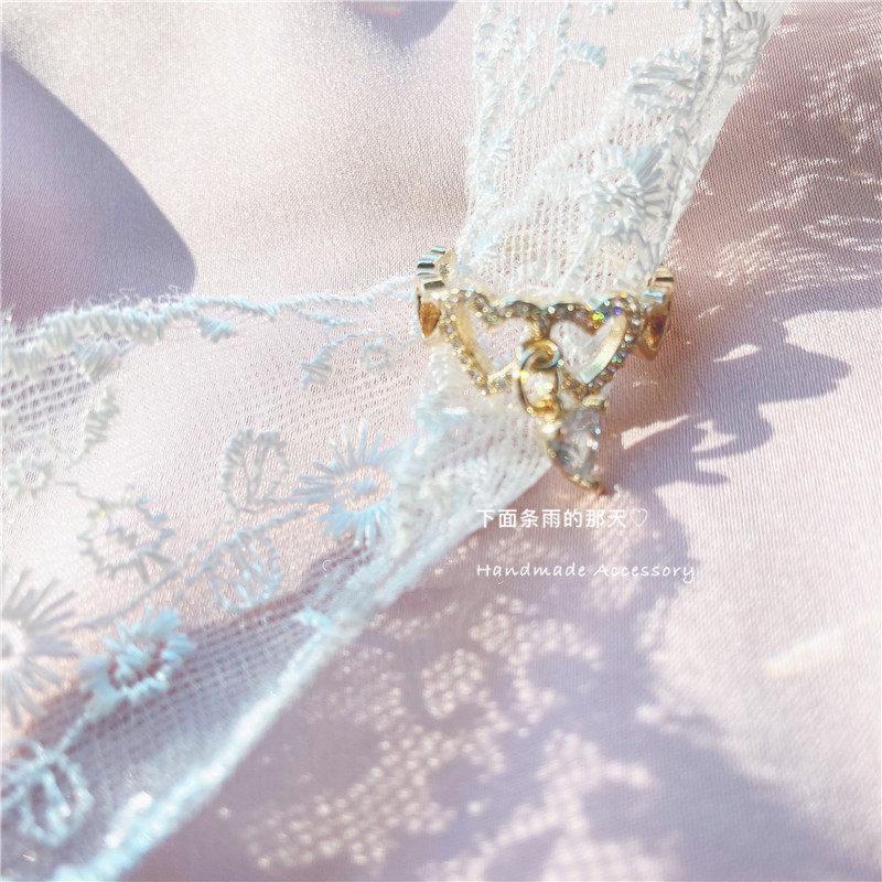 Japanese-style openwork heart pendant ring for women, adjustable opening, gold heart-shaped zircon ring, teardrop-shaped diamond setting.
