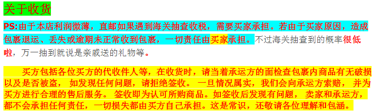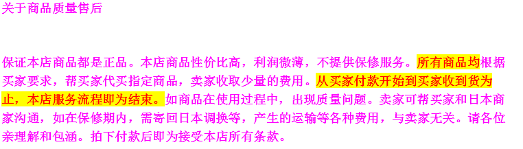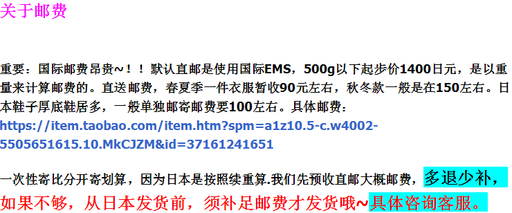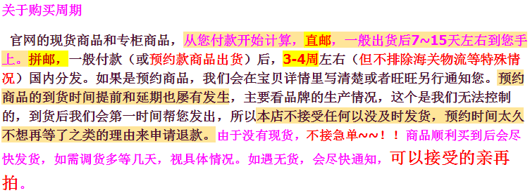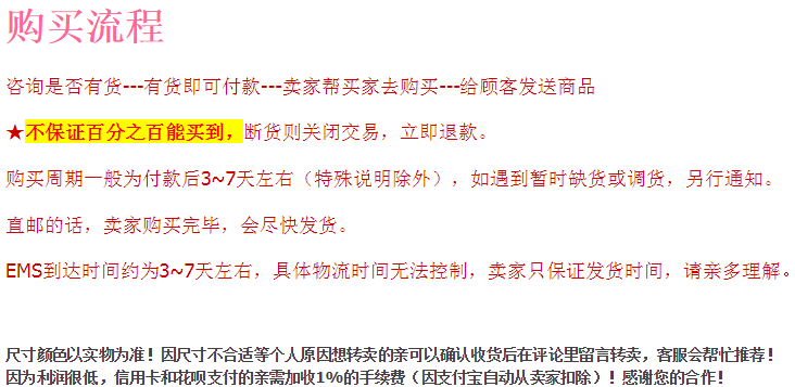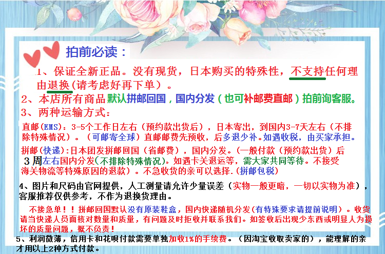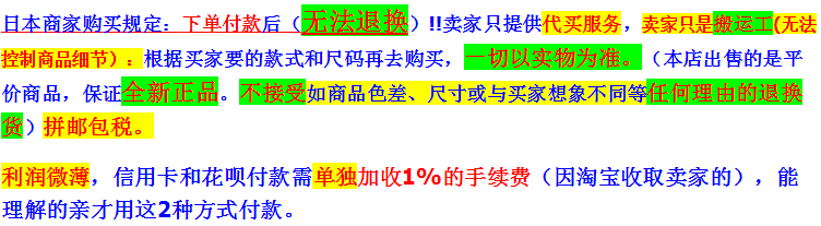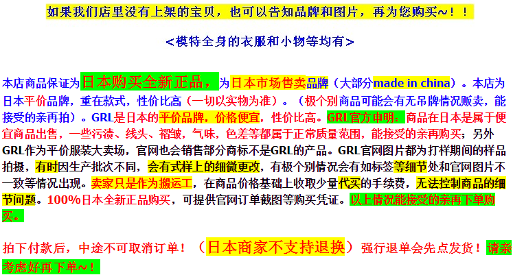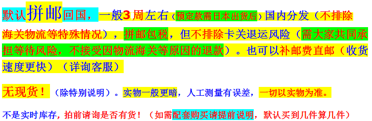 由于是日本购买,日本这边商家不给我们退换货的,所以一律不退不换~~!!为了尽量避免买家在购买时的不便,请您在购买前联系客服,咨询商品是否有货和具体邮费。付款前请想好确定要的,再付款,付款后不接受任何理由退款。请珍惜我们的劳动成果!!没有现货,购买商品也需要时间~!!付款后请勿反复催促,我们也想早点发货早点拿钱。我们到货了会第一时间发货的。