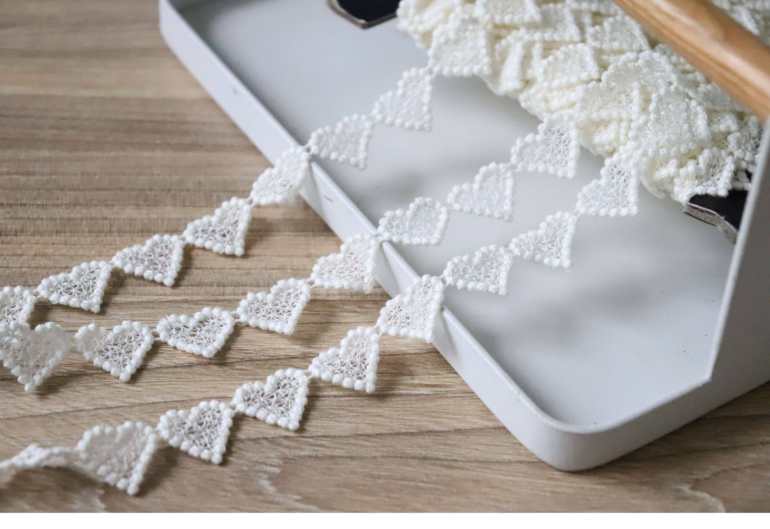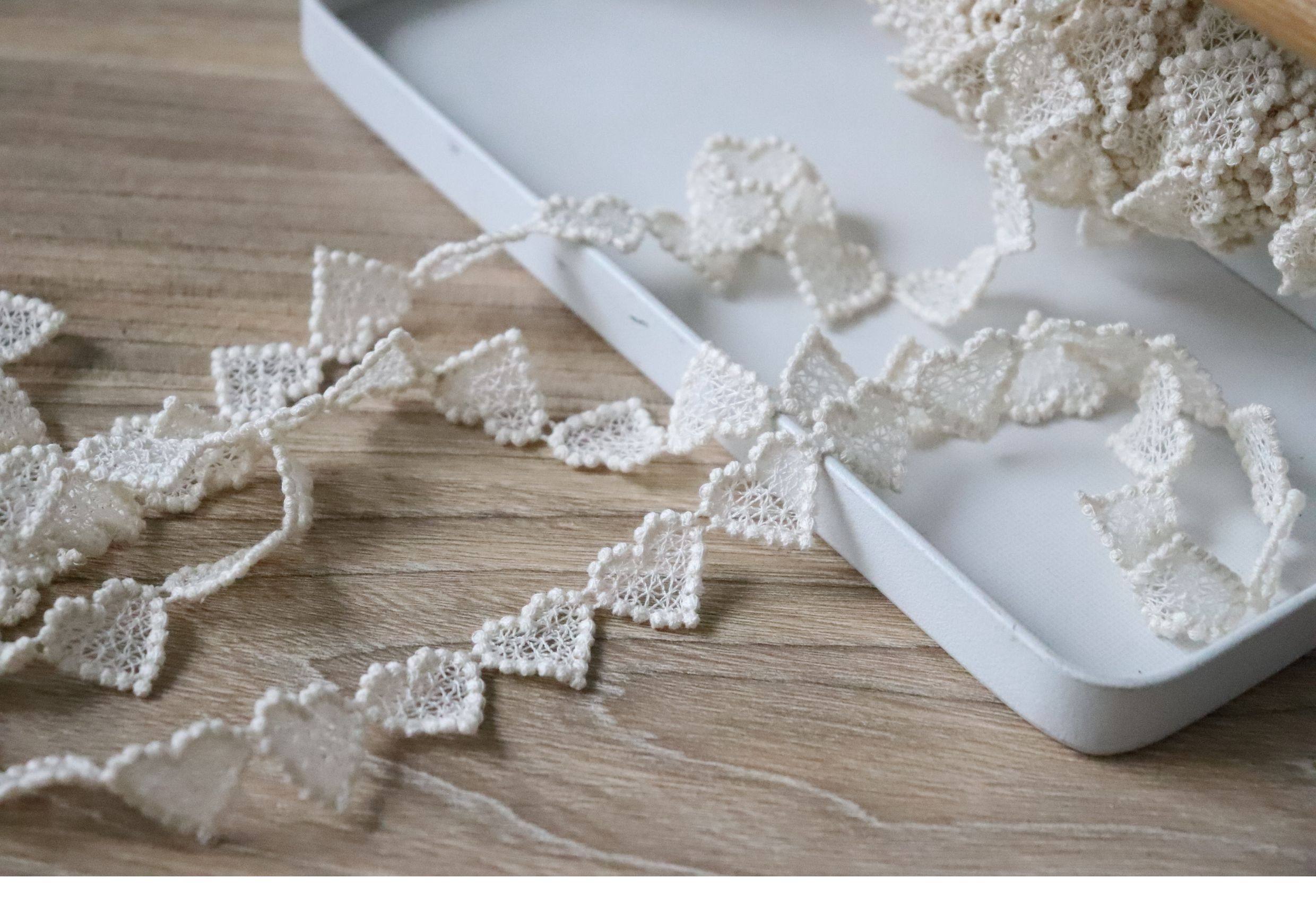 Made in Japan. Creamy yellow/beige. Fine cotton thread embroidery. Heart-shaped water-soluble lace trim, 1.5cm wide.