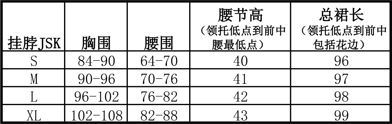 ■挂脖JSK尺码表■(单位:CM) 尺码表为成衣平铺尺寸,基础误差在2-3cm左右都是正常范围(特别是裙长)