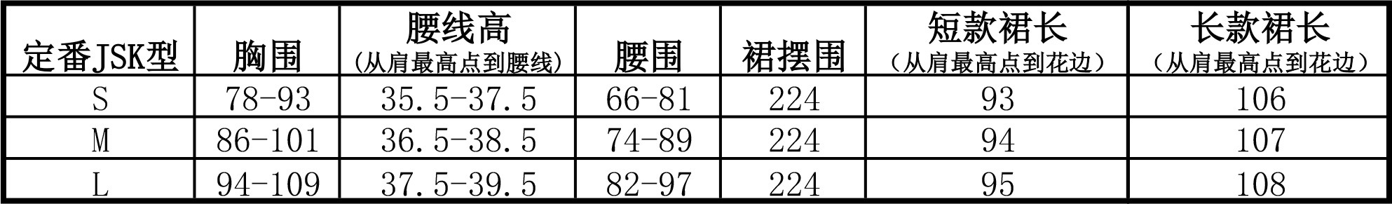 ■定番JSK尺码表■(单位:CM) 尺码表为成衣平铺尺寸,基础误差在2-3cm左右都是正常范围(特别是裙长)。