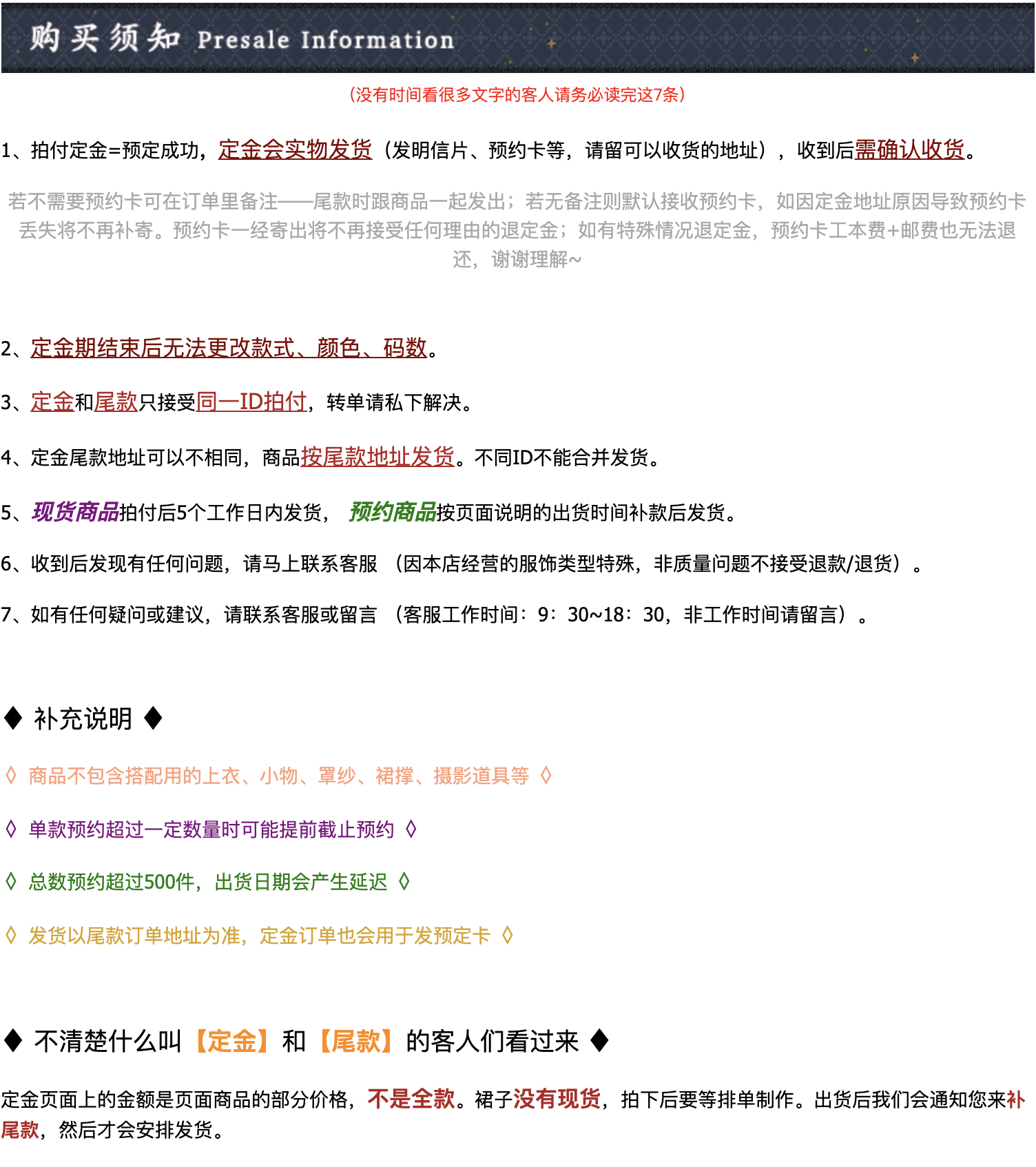 尾款通知:请宝们收藏一下汇总页面,并点击尾款提醒选项的“到货提醒”,尾款时您的旺旺会收到“补货通知”。旺旺如果设置瞭非好友不能聊天的客人请先加我们客服的旺旺。尾款也会以短信形式通知,定金地址栏请填写一个可以接收信息的手机号并且不要勾选号码保护(勾选瞭号码保护系统无法发送短信,短信送达率不是100%,请务必留意其他社交平台的通知,不懂的话请随时敲客服)。