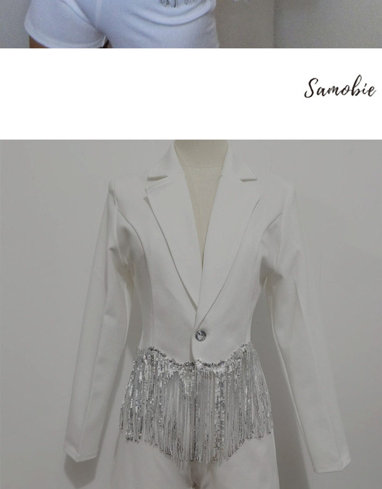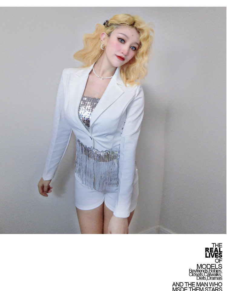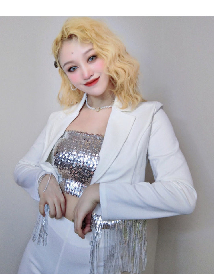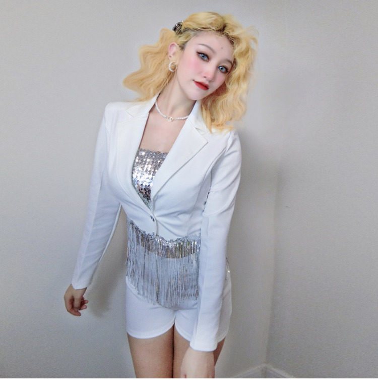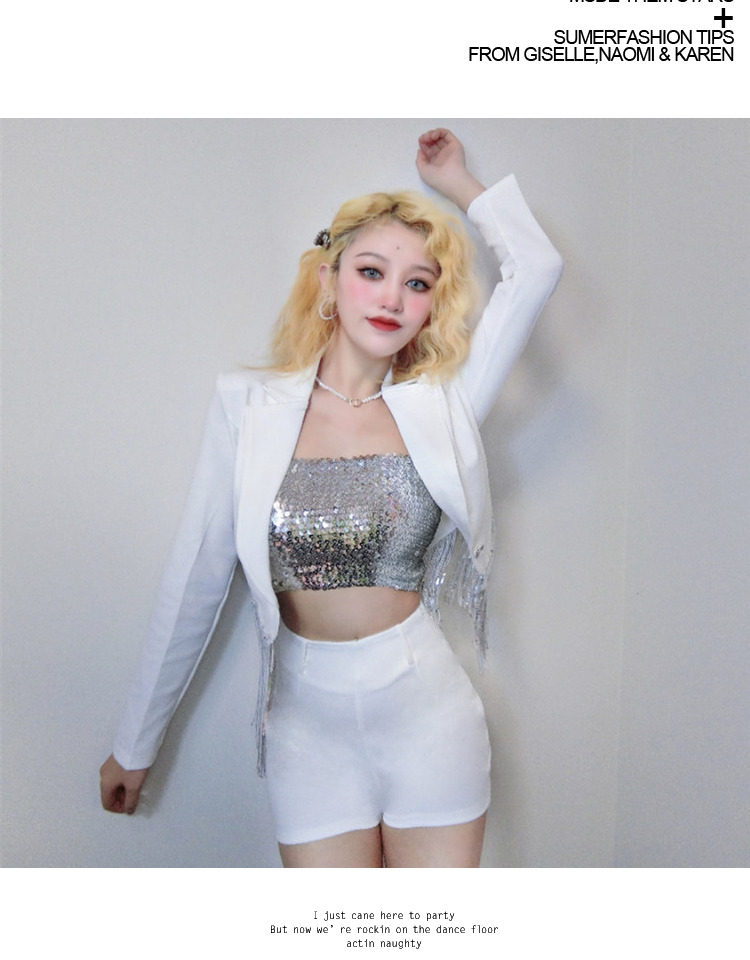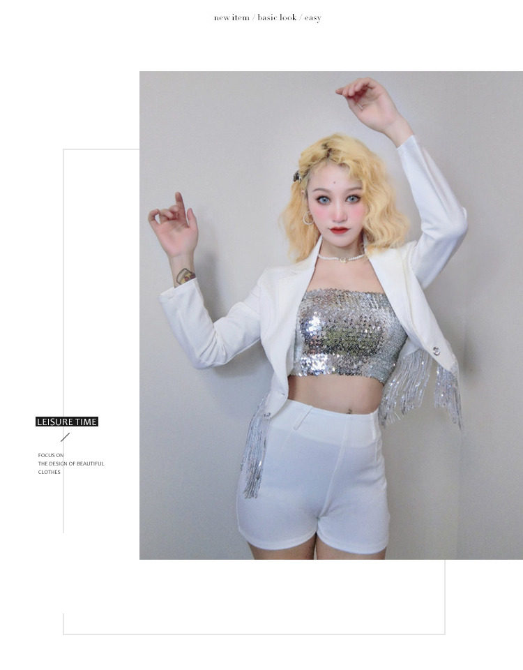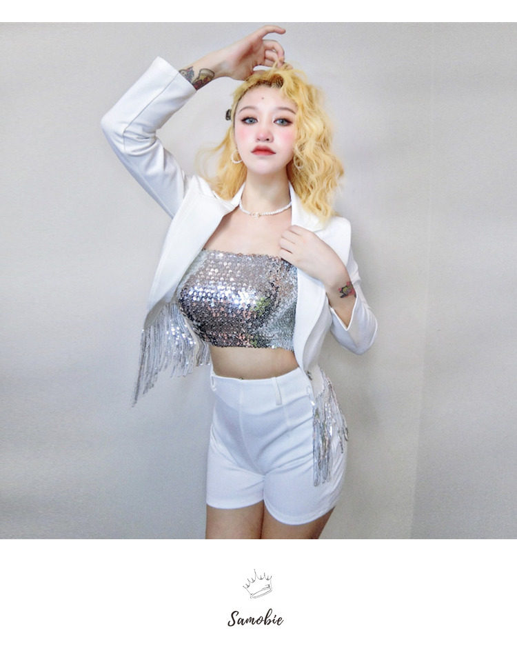Internet celebrity female anchor singer sparkling tassel top celebrity girl group performance outfit white suit shorts set