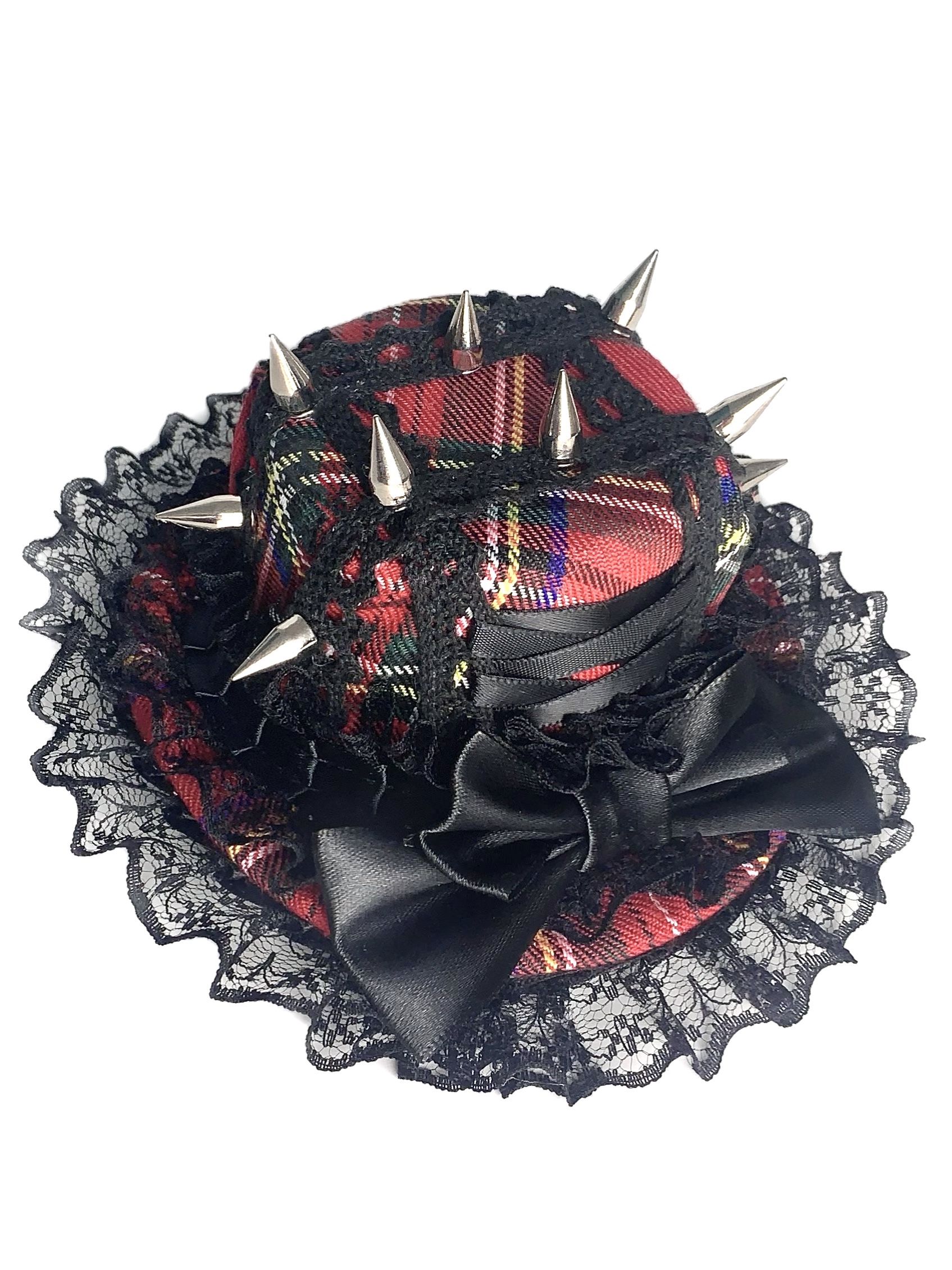 Black Bubble & Original Handmade Punk Black and Red Plaid Lolita Hat Headpiece Subculture Studded Lace