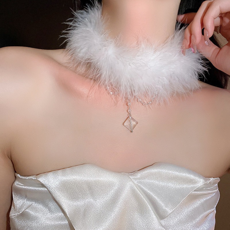 Ancient Pure Desire Fur Necklace with Crystal Tassels and Feathers, Short Necklace, Sweet and Cool Spicy Collarbone Necklace, Christmas Women's