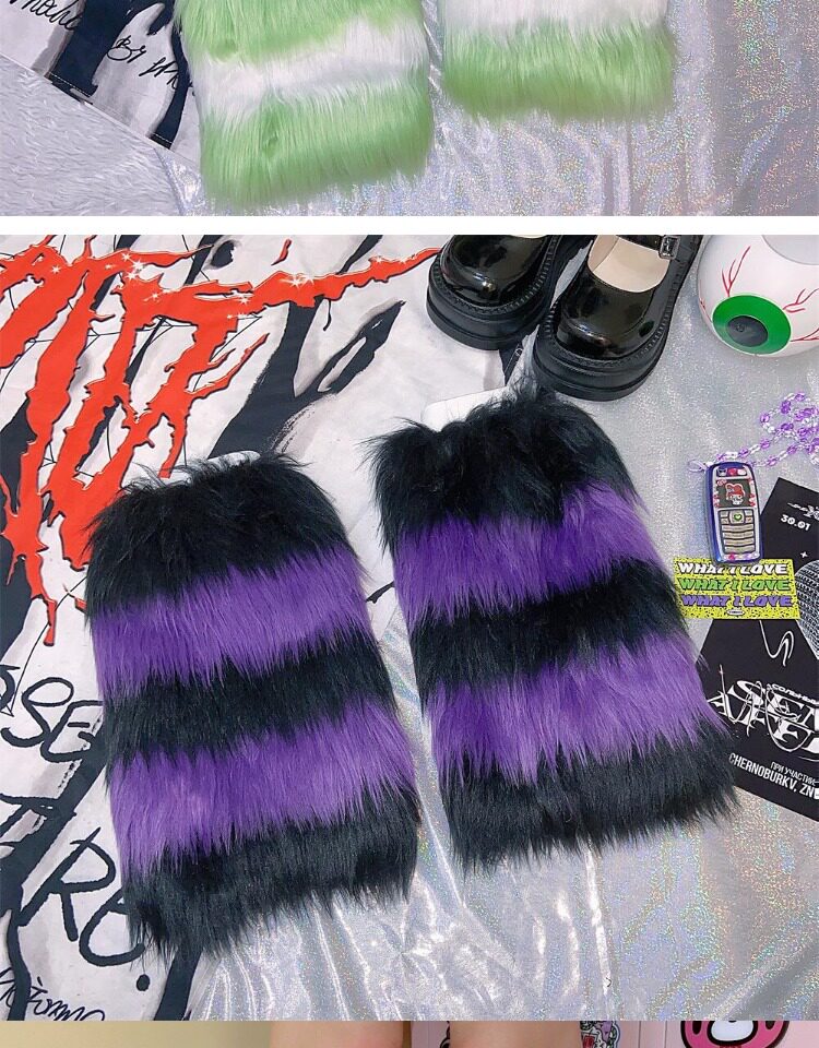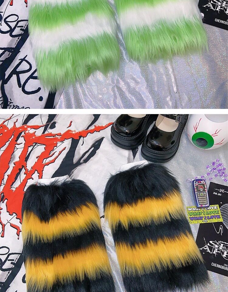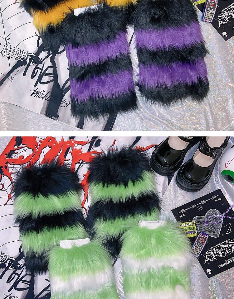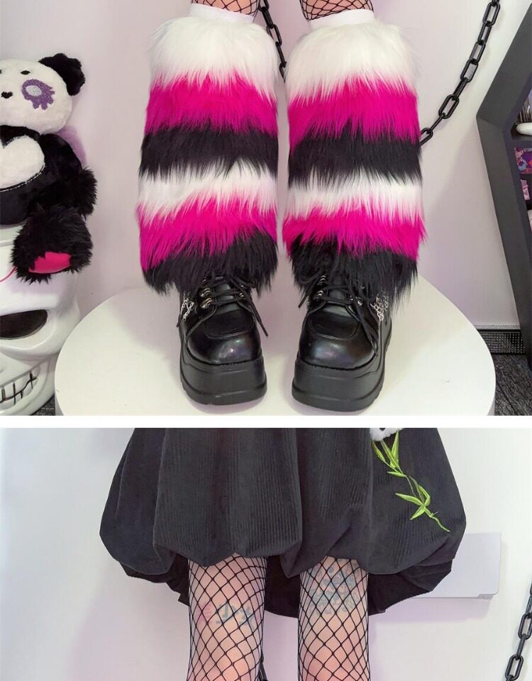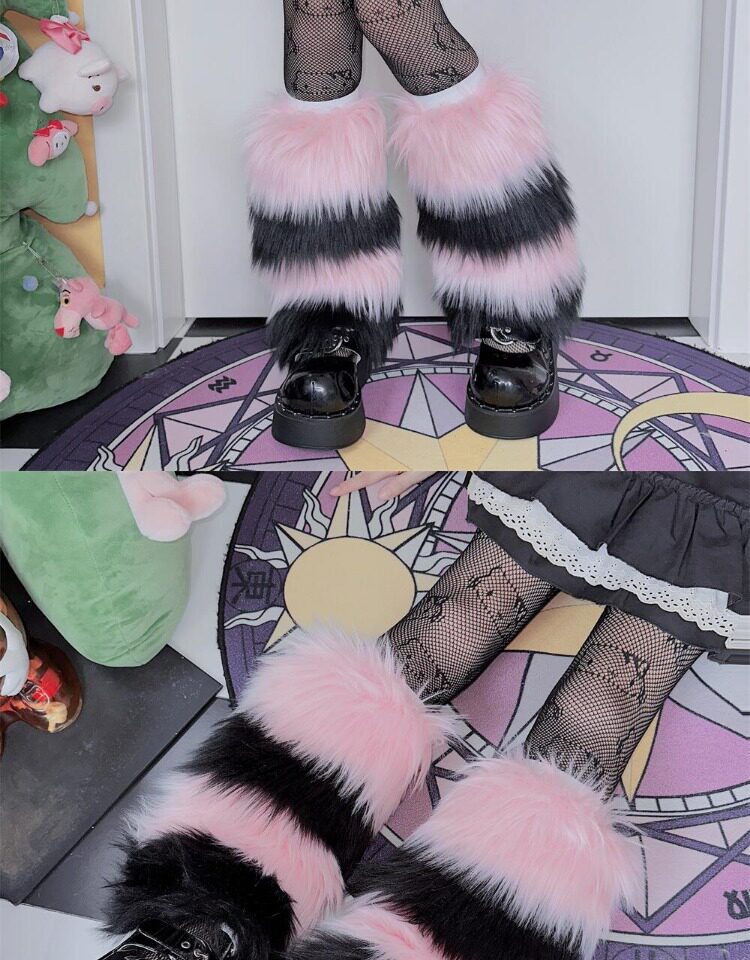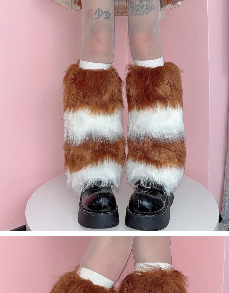 Japanese style Harajuku Y2K millennial glamorous subculture striped autumn/winter contrasting color fur warm faux fur socks leg warmers