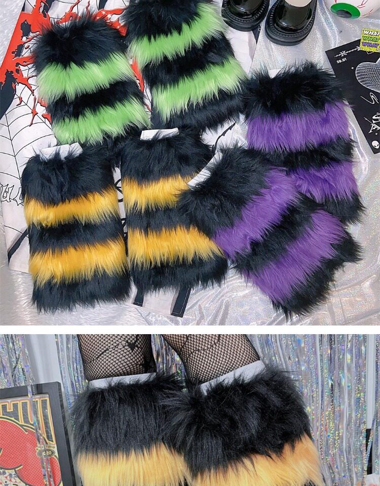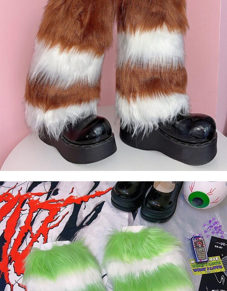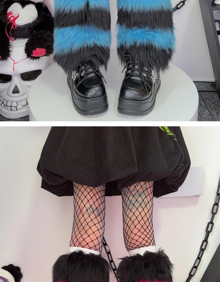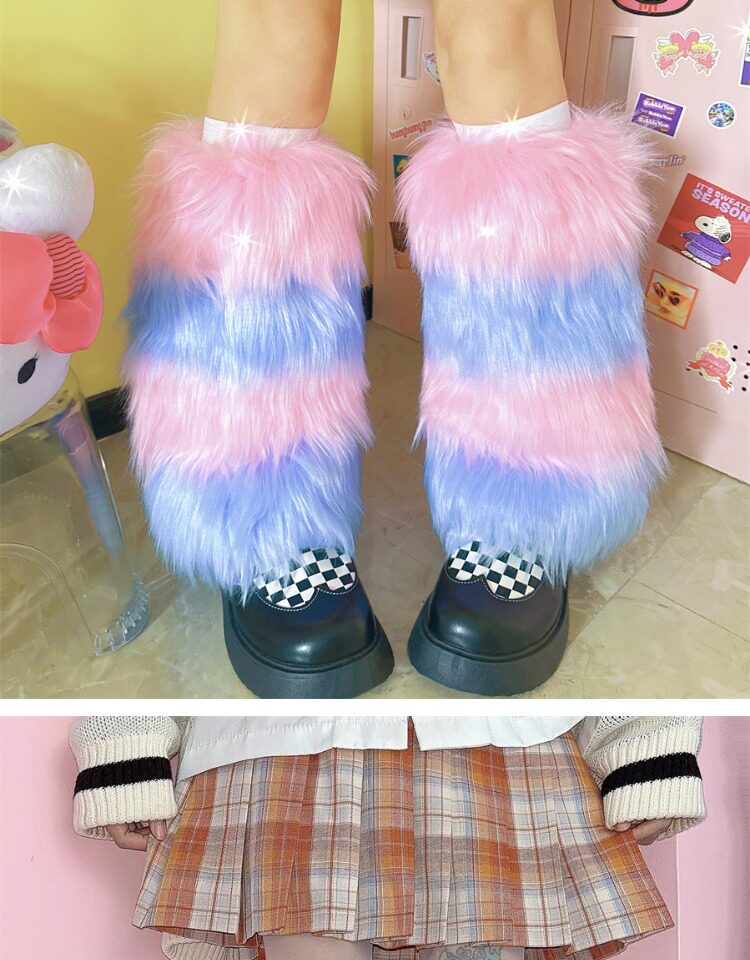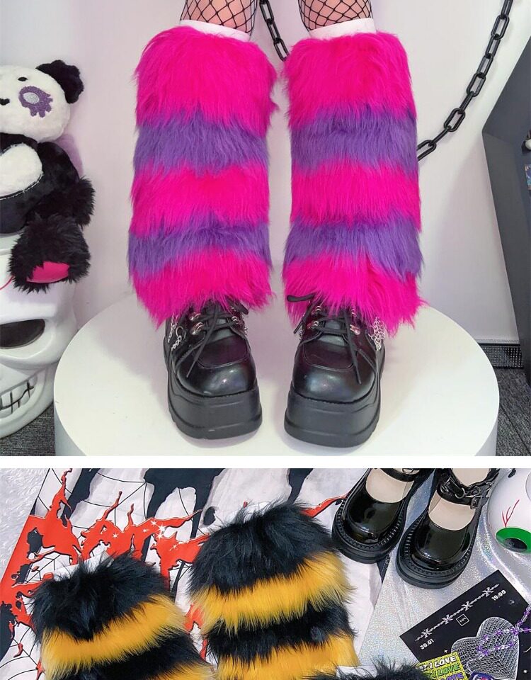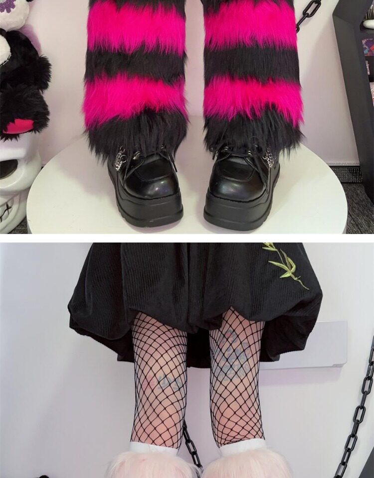 Japanese style Harajuku Y2K millennial glamorous subculture striped autumn/winter contrasting color fur warm faux fur socks leg warmers
