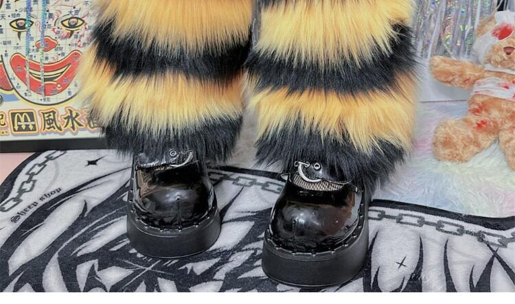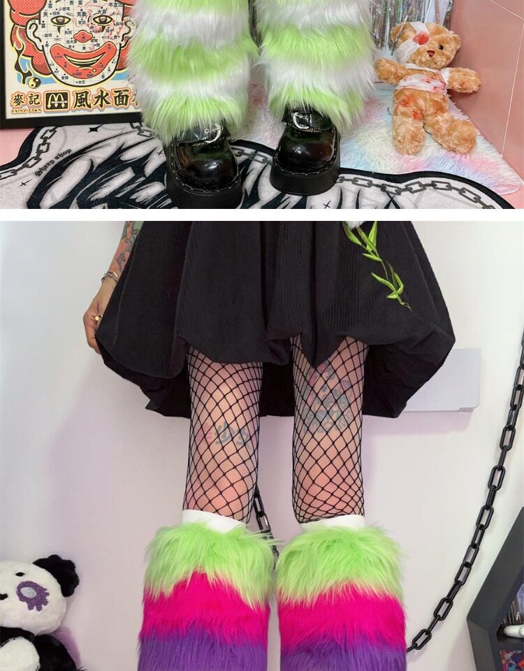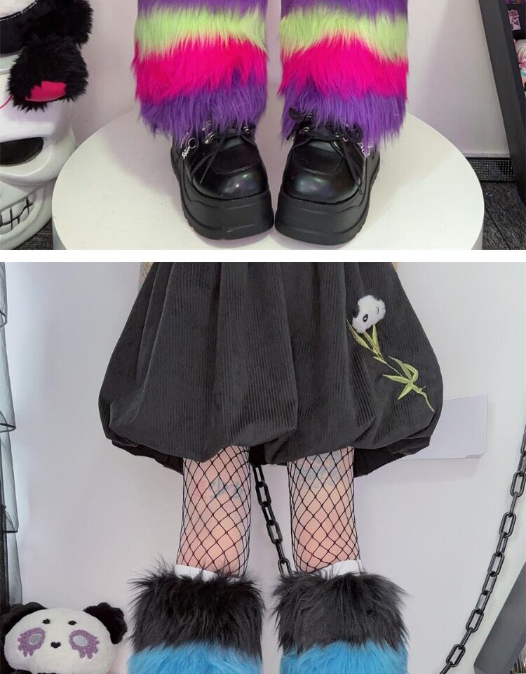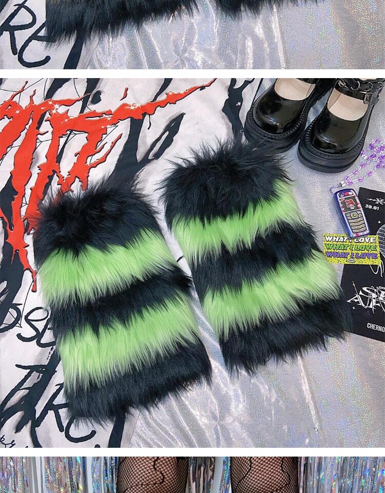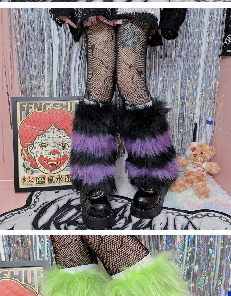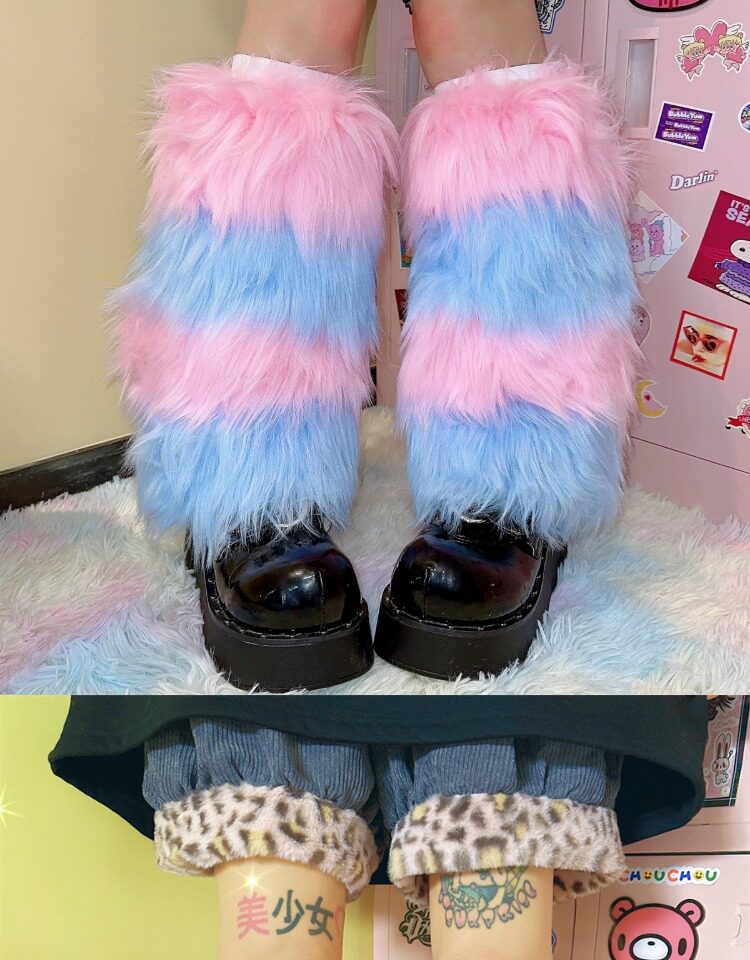 Japanese style Harajuku Y2K millennial glamorous subculture striped autumn/winter contrasting color fur warm faux fur socks leg warmers
