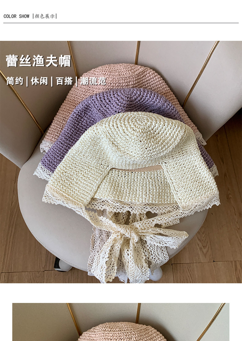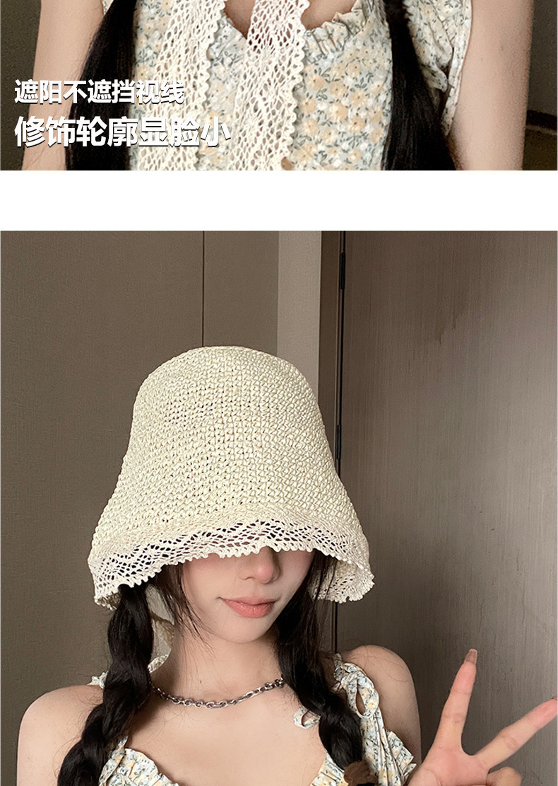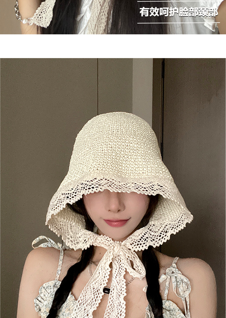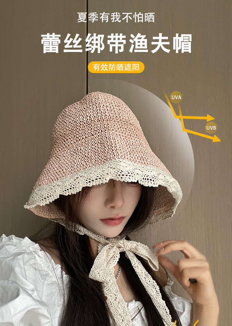 遮阳帽草帽女夏季蕾丝绑带渔夫帽子女海边沙滩防晒遮脸手工遮阳帽 [Original Page Link]