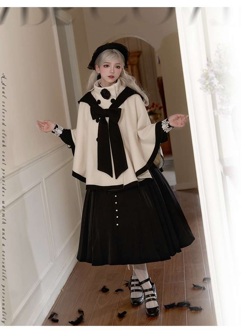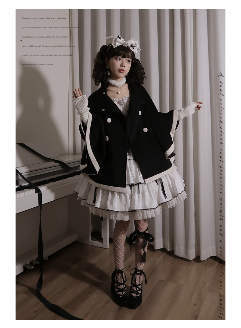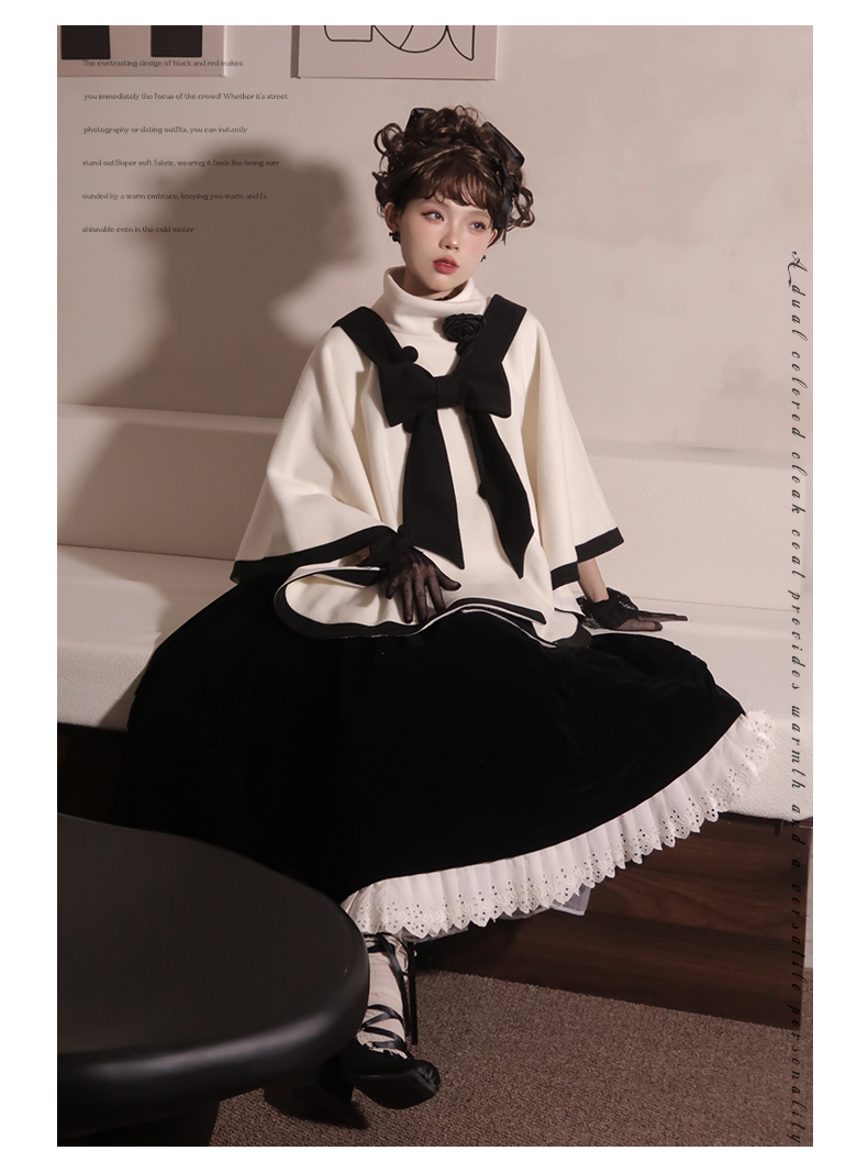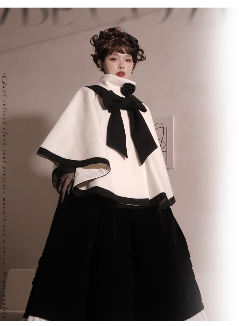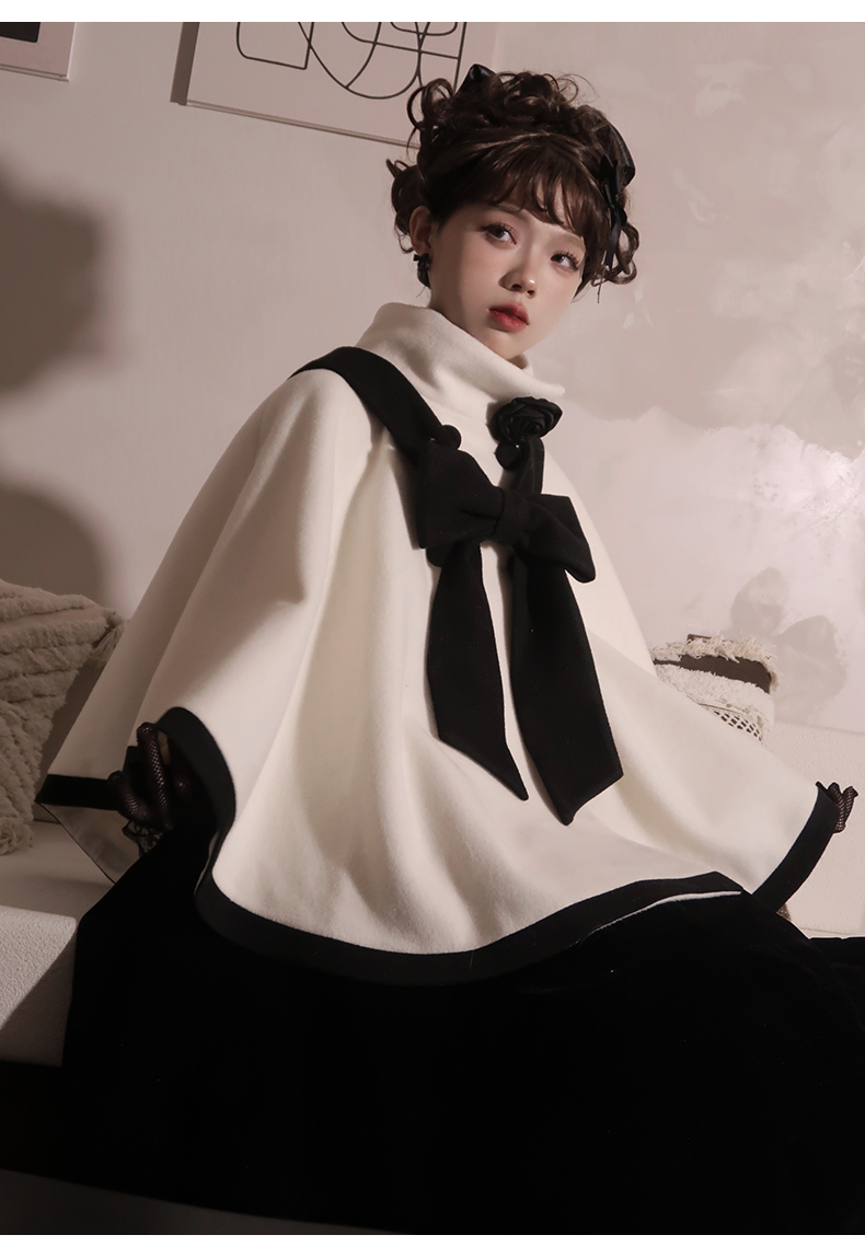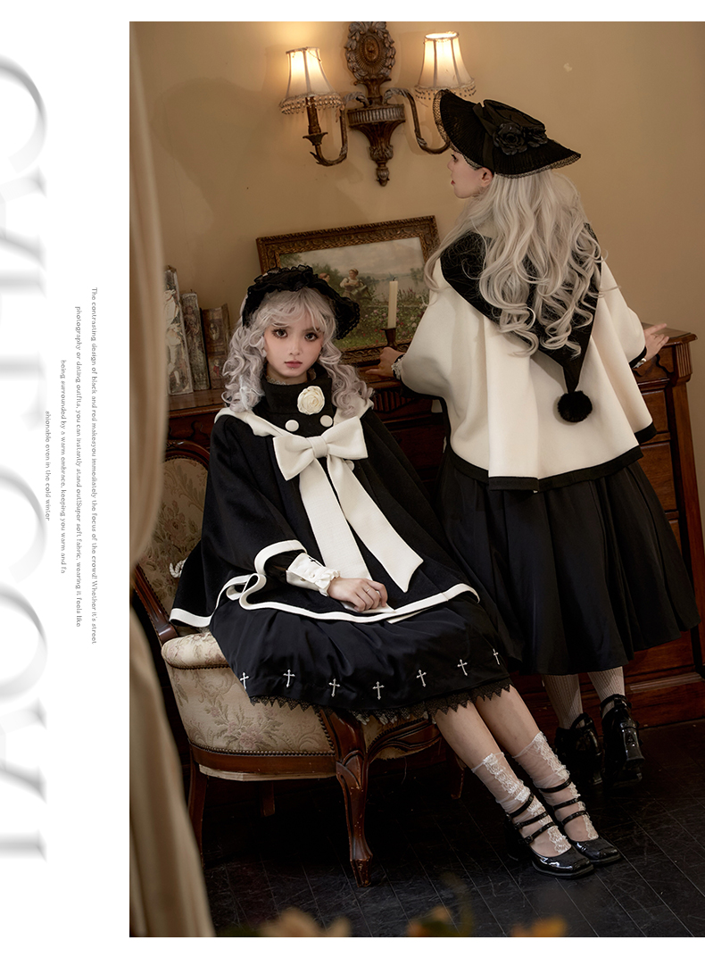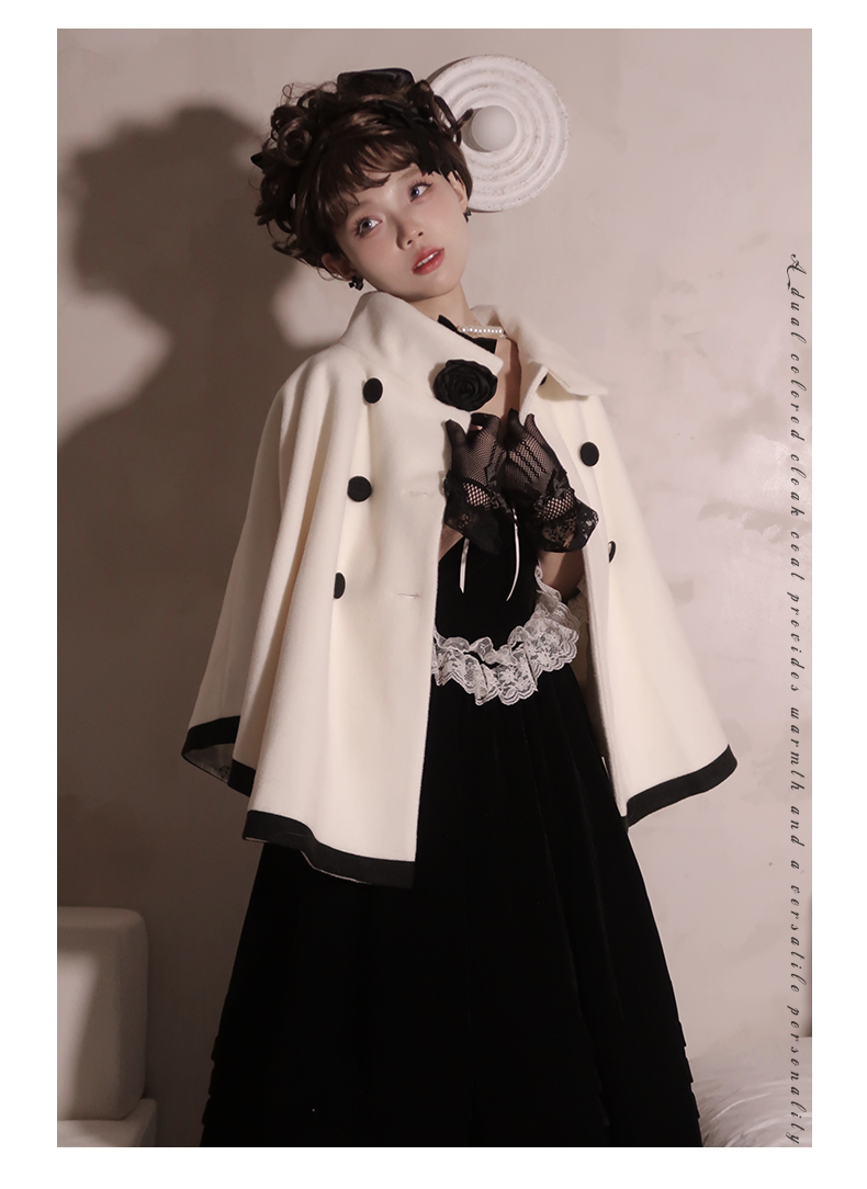 Urtto original cape coat lolita Lolita woolen coat autumn and winter elegant black and white camellia coat
