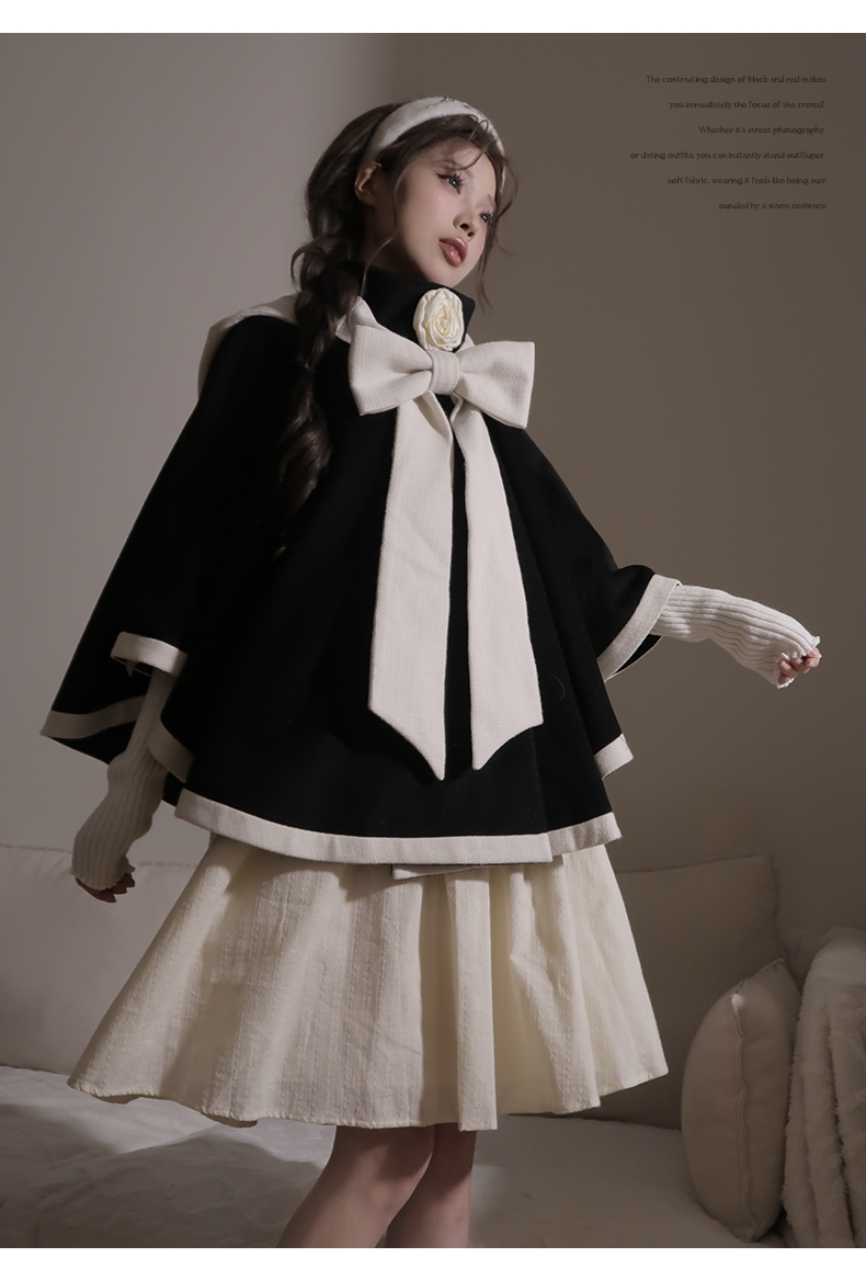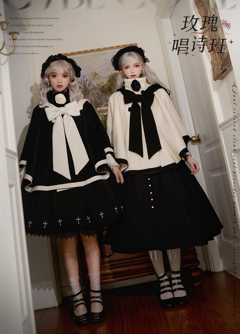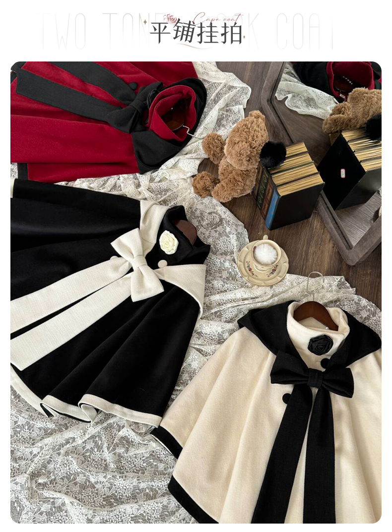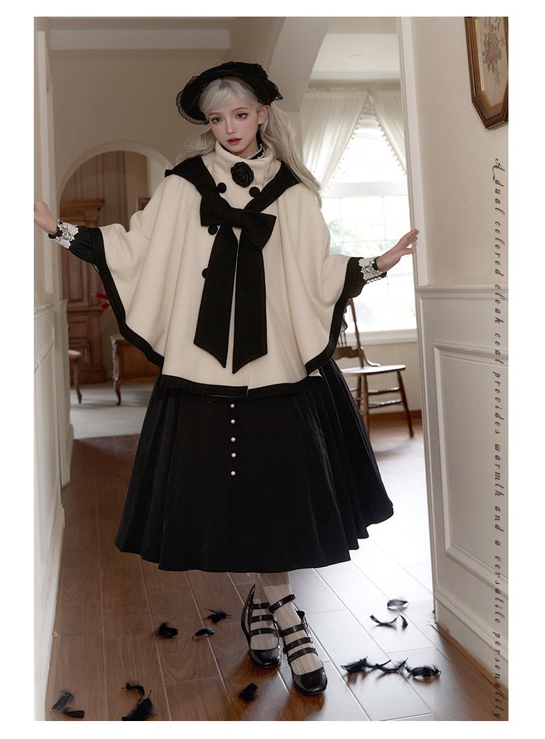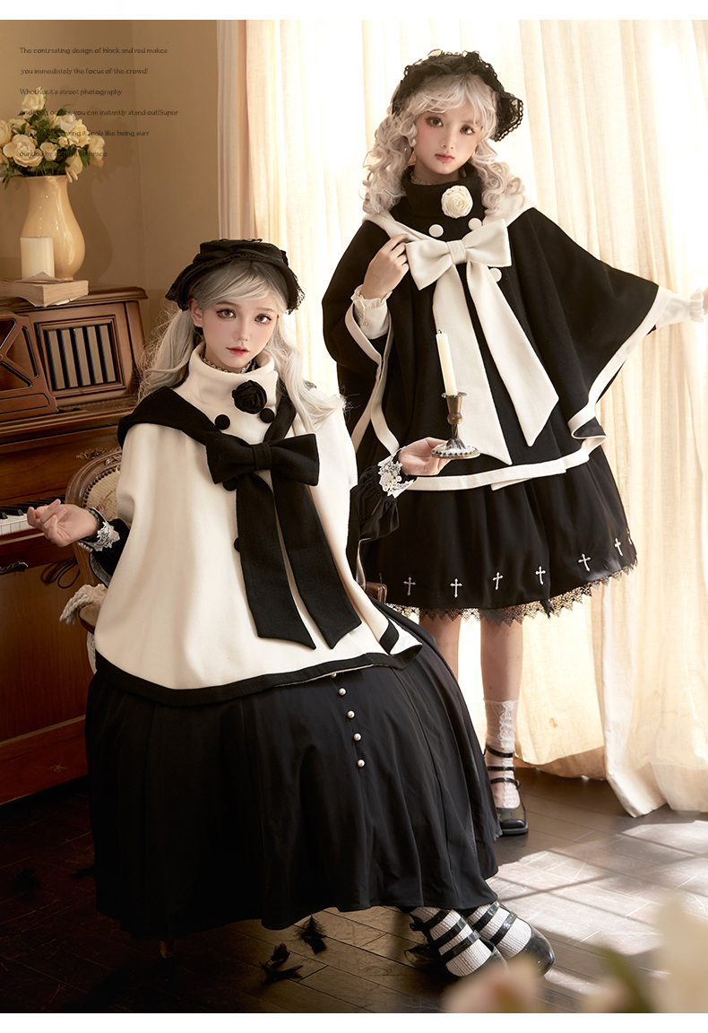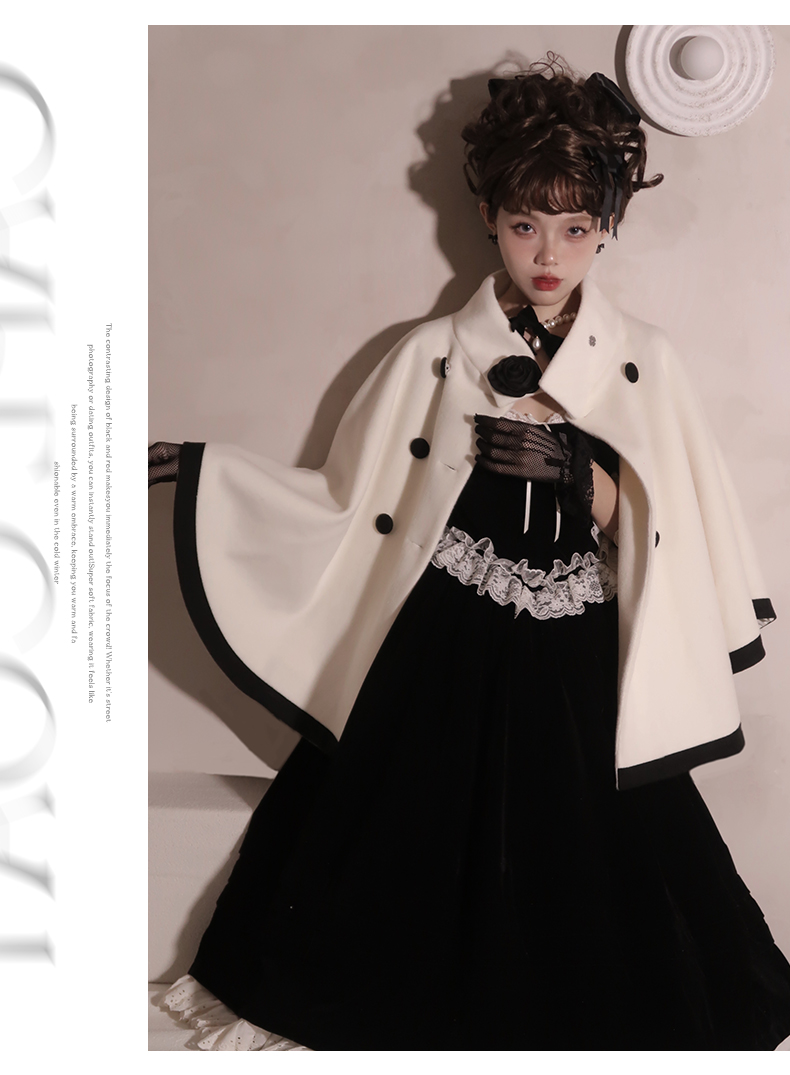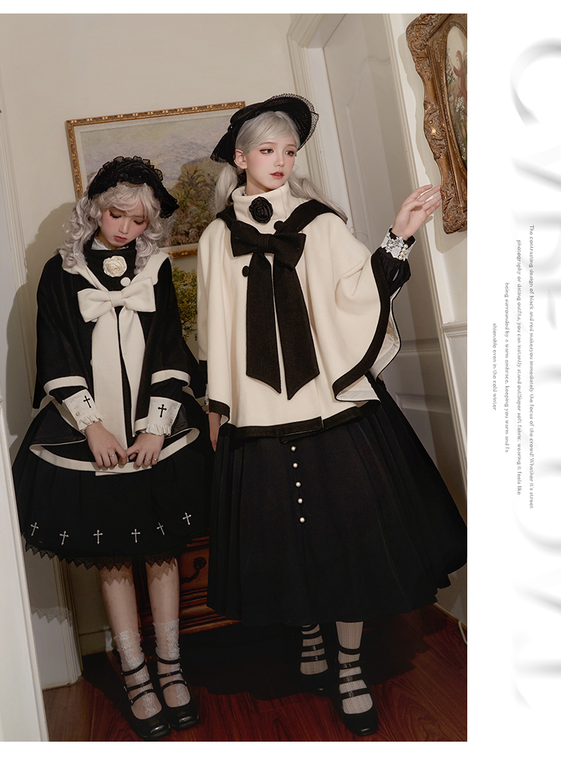 Urtto original cape coat lolita Lolita woolen coat autumn and winter elegant black and white camellia coat