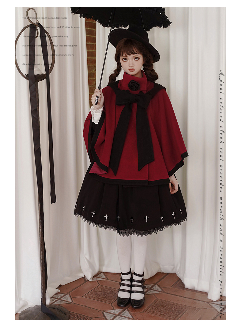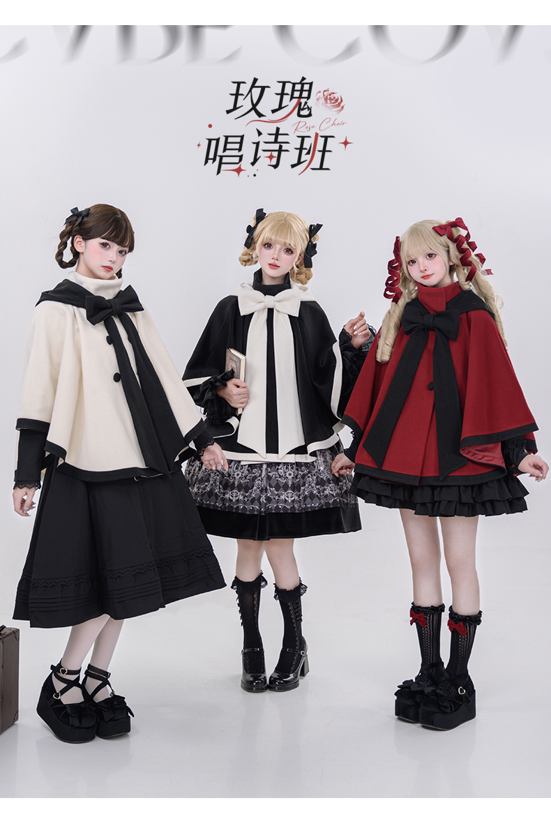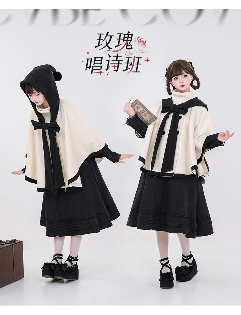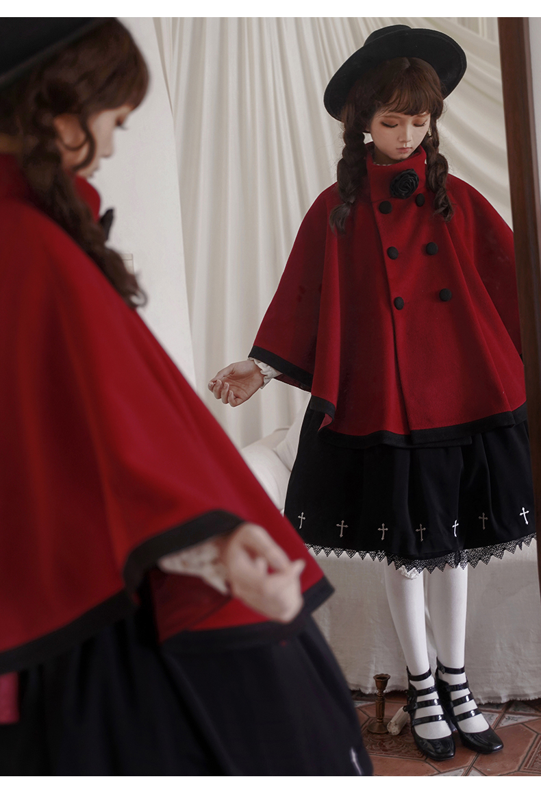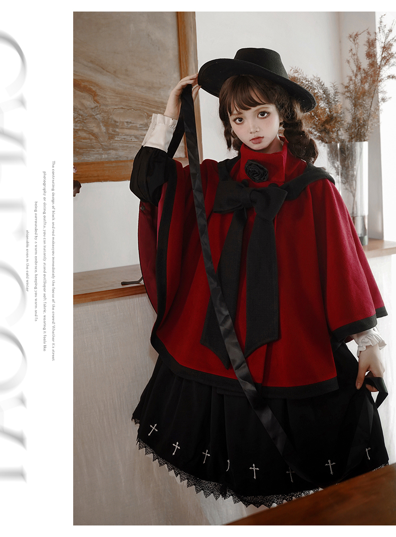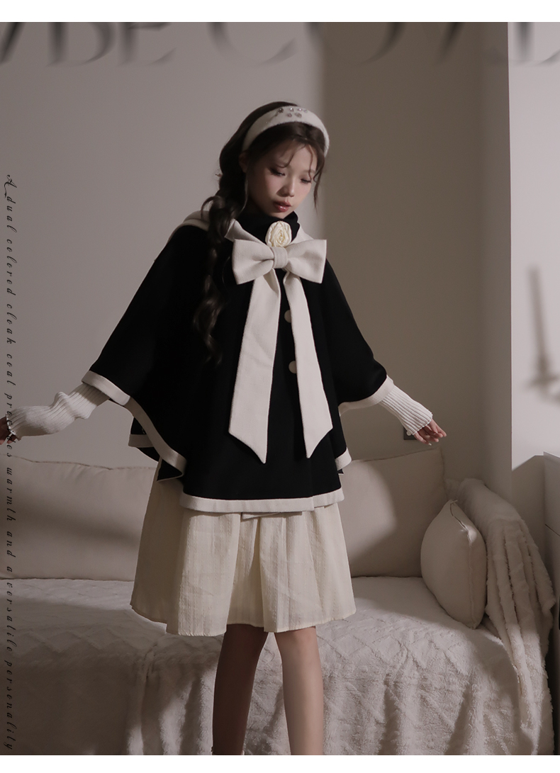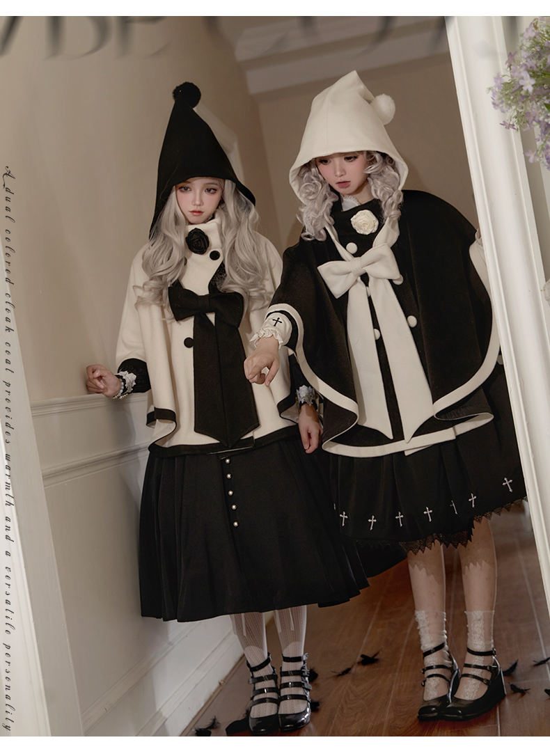 Urtto original cape coat lolita Lolita woolen coat autumn and winter elegant black and white camellia coat